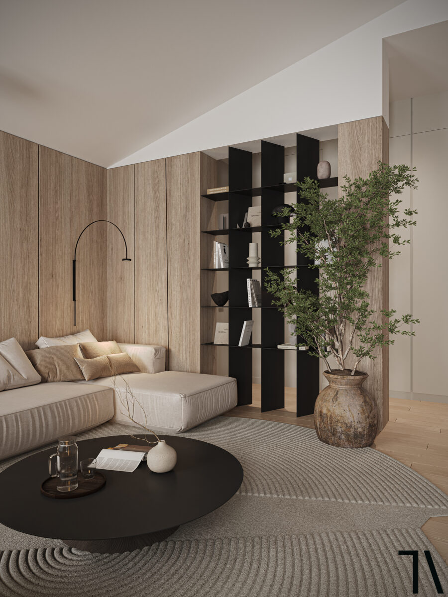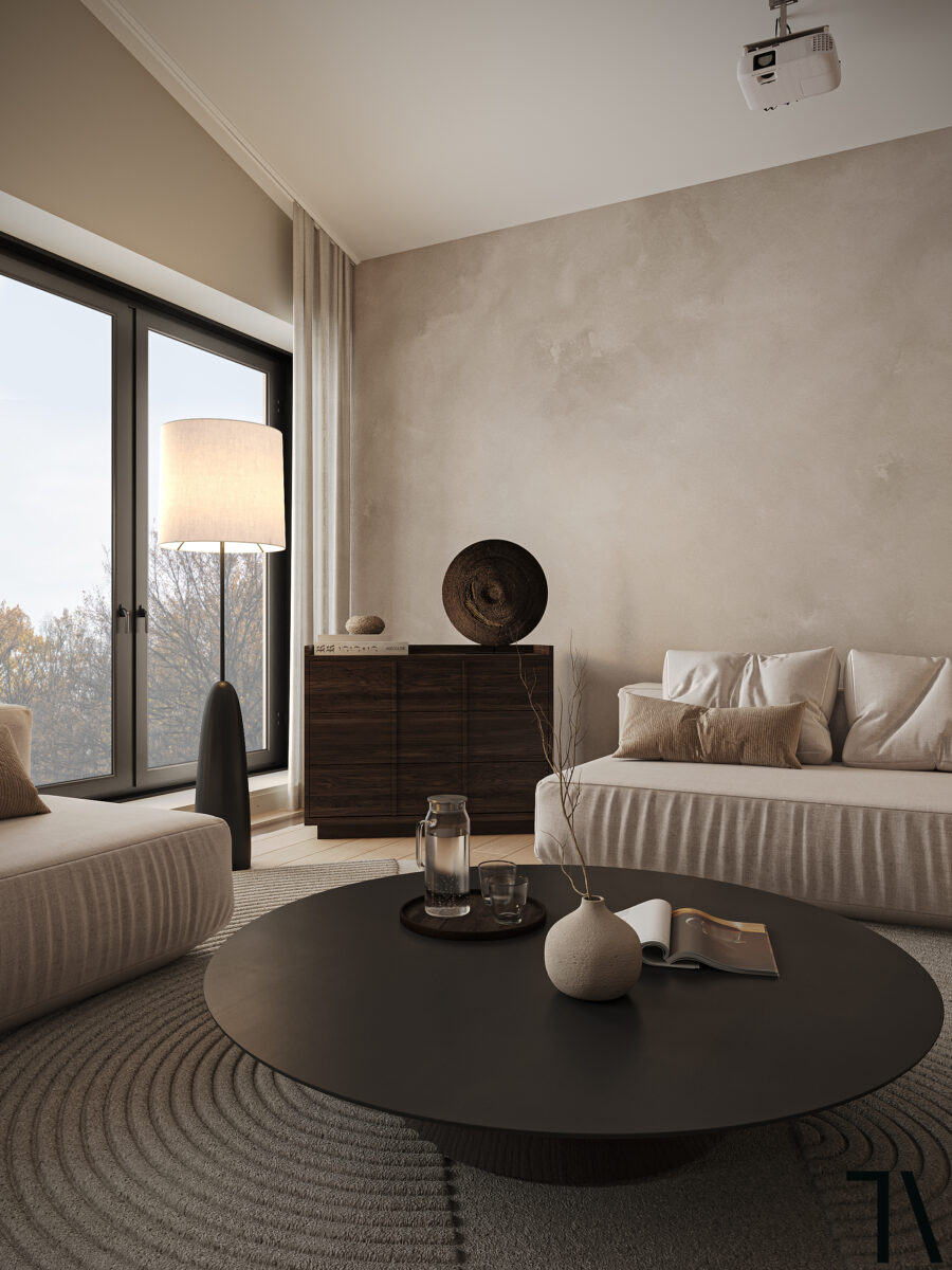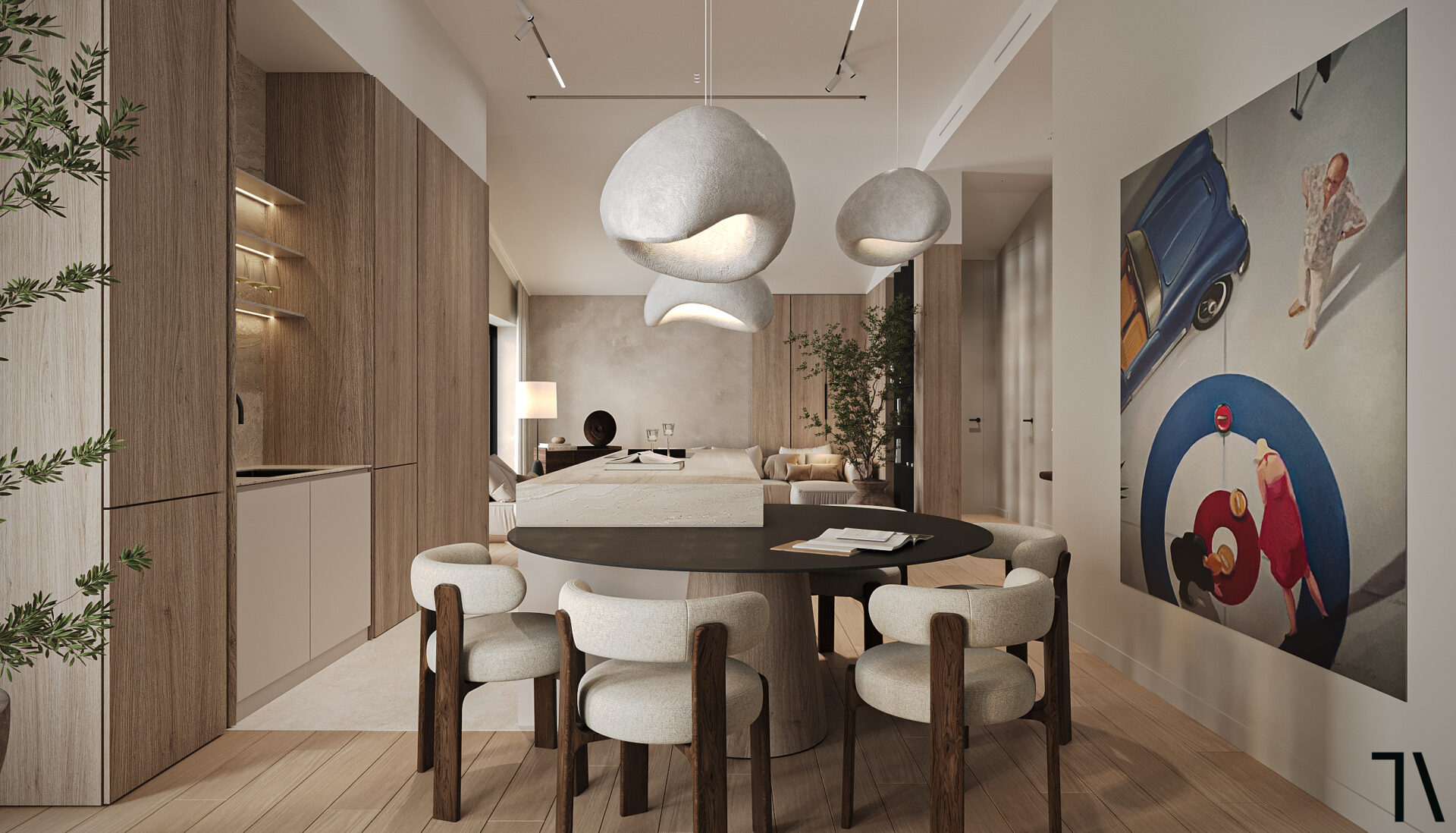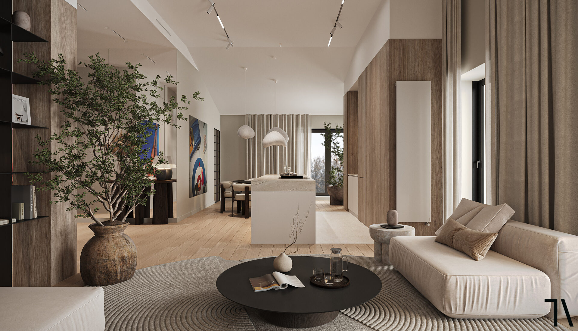 Wnętrze tego apartamentu stanowi spójną kompozycję naturalnych materiałów, subtelnych barw i miękkich form. Projekt opiera się na założeniu, że prostota i elegancja mogą współistnieć z ciepłem i przytulnością. Dominują tu beże, szarości oraz ciepłe odcienie drewna, które tworzą tło dla codziennego życia i wprowadzają atmosferę spokoju.