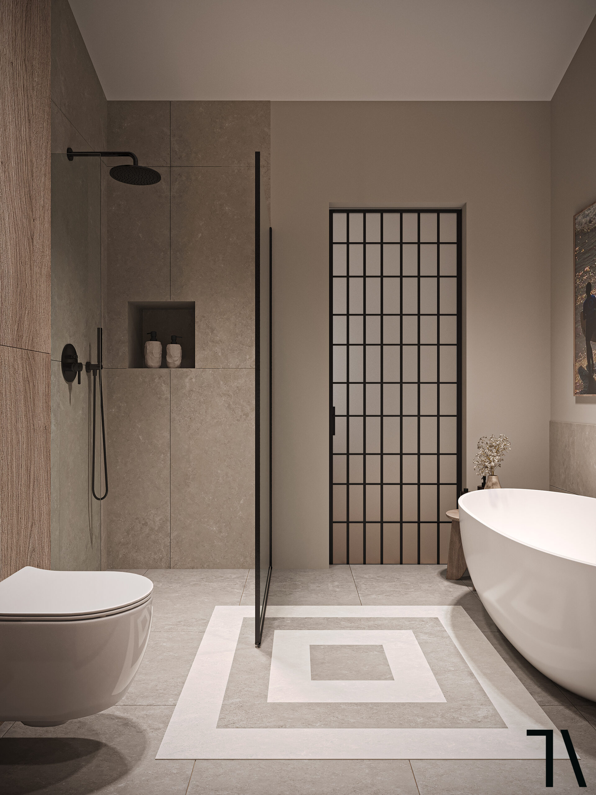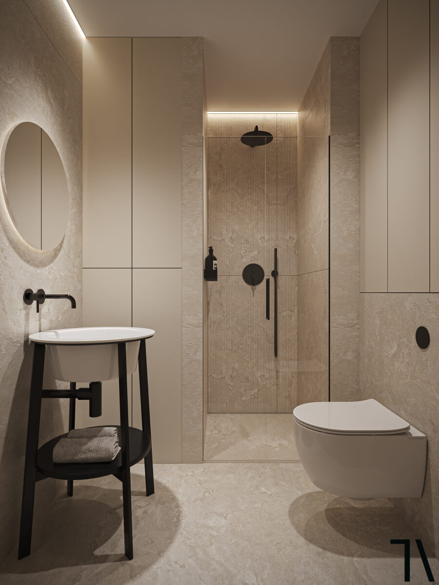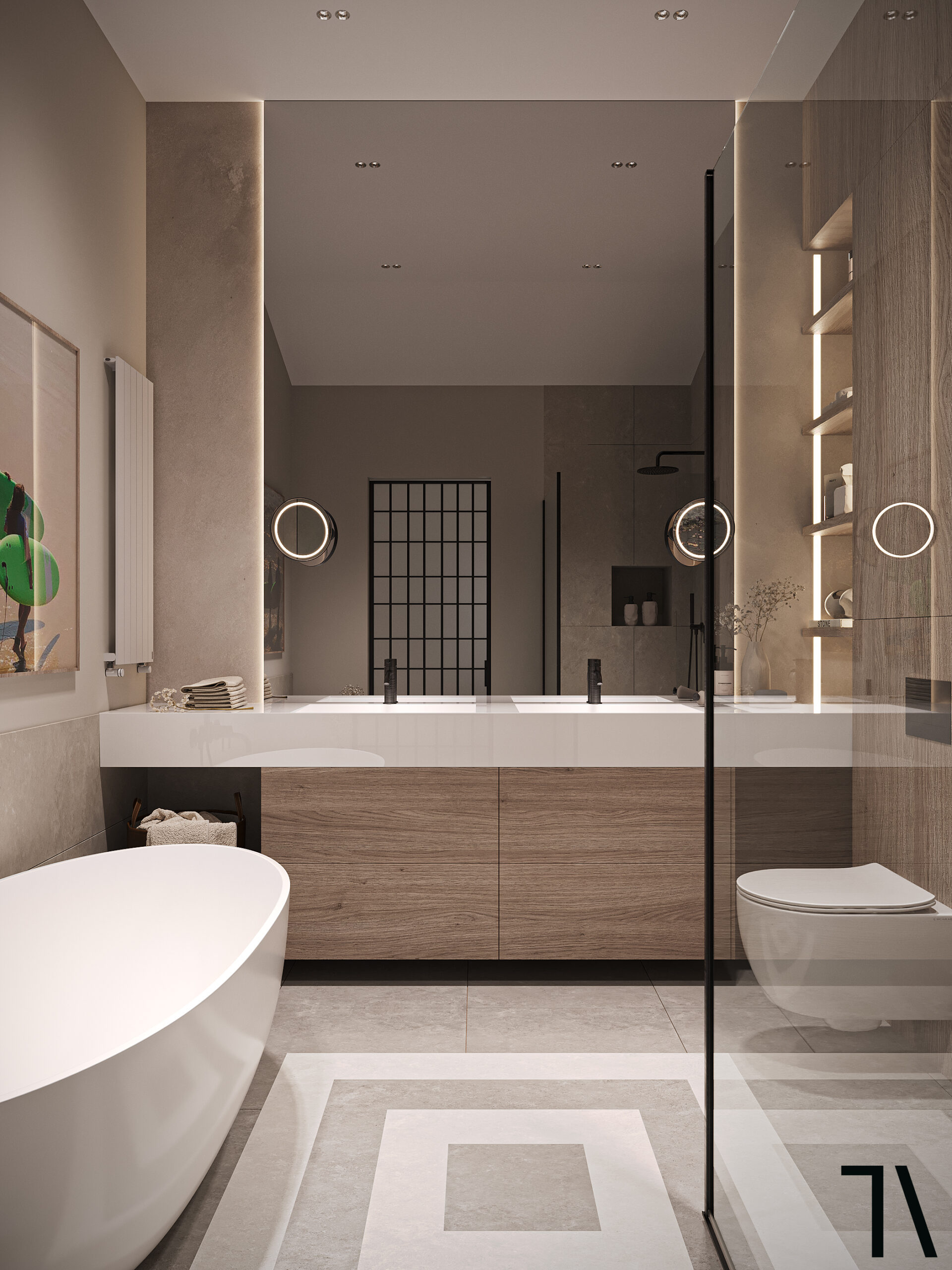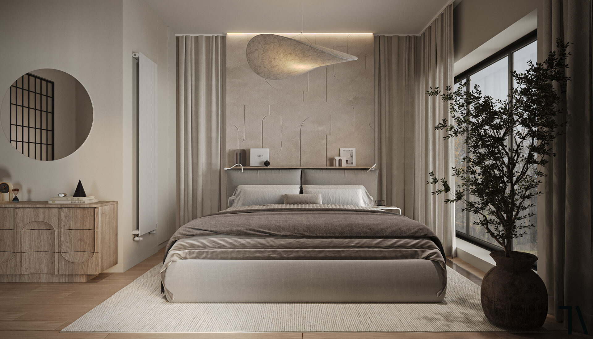 Wnętrze tego apartamentu stanowi spójną kompozycję naturalnych materiałów, subtelnych barw i miękkich form. Projekt opiera się na założeniu, że prostota i elegancja mogą współistnieć z ciepłem i przytulnością. Dominują tu beże, szarości oraz ciepłe odcienie drewna, które tworzą tło dla codziennego życia i wprowadzają atmosferę spokoju.