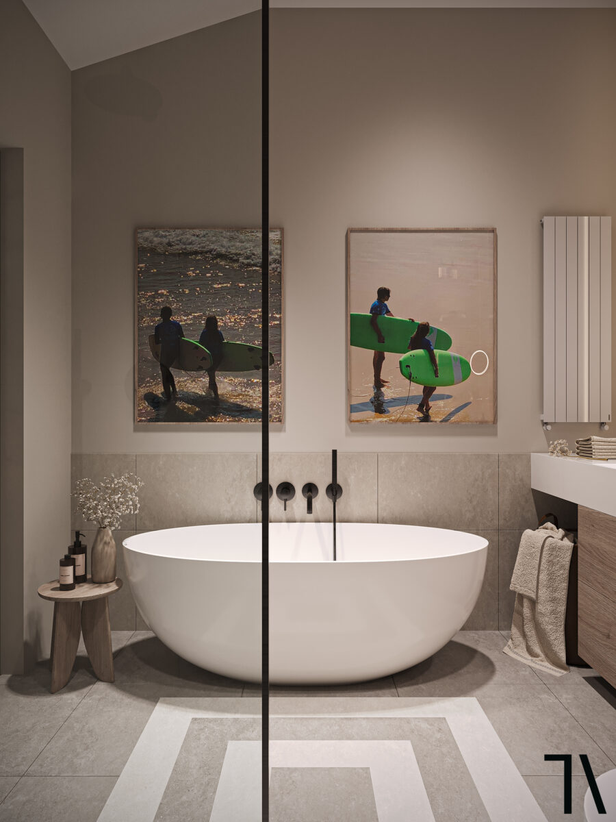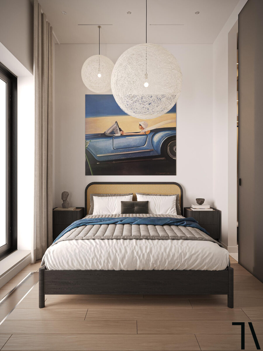 Istotnym akcentem w przestrzeni są obrazy, które przełamują stonowaną, naturalną bazę wnętrza. Ich wyraziste kolory wprowadzają energię i nadają aranżacji indywidualny charakter. To element, na którym szczególnie zależało Inwestorce – wnoszą odrobinę ekspresji i świeżości do spokojnej, zrównoważonej estetyki projektu.