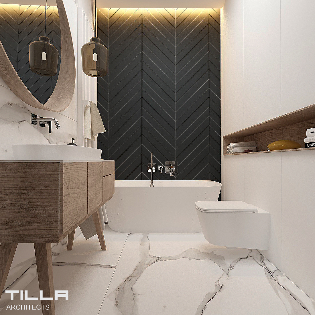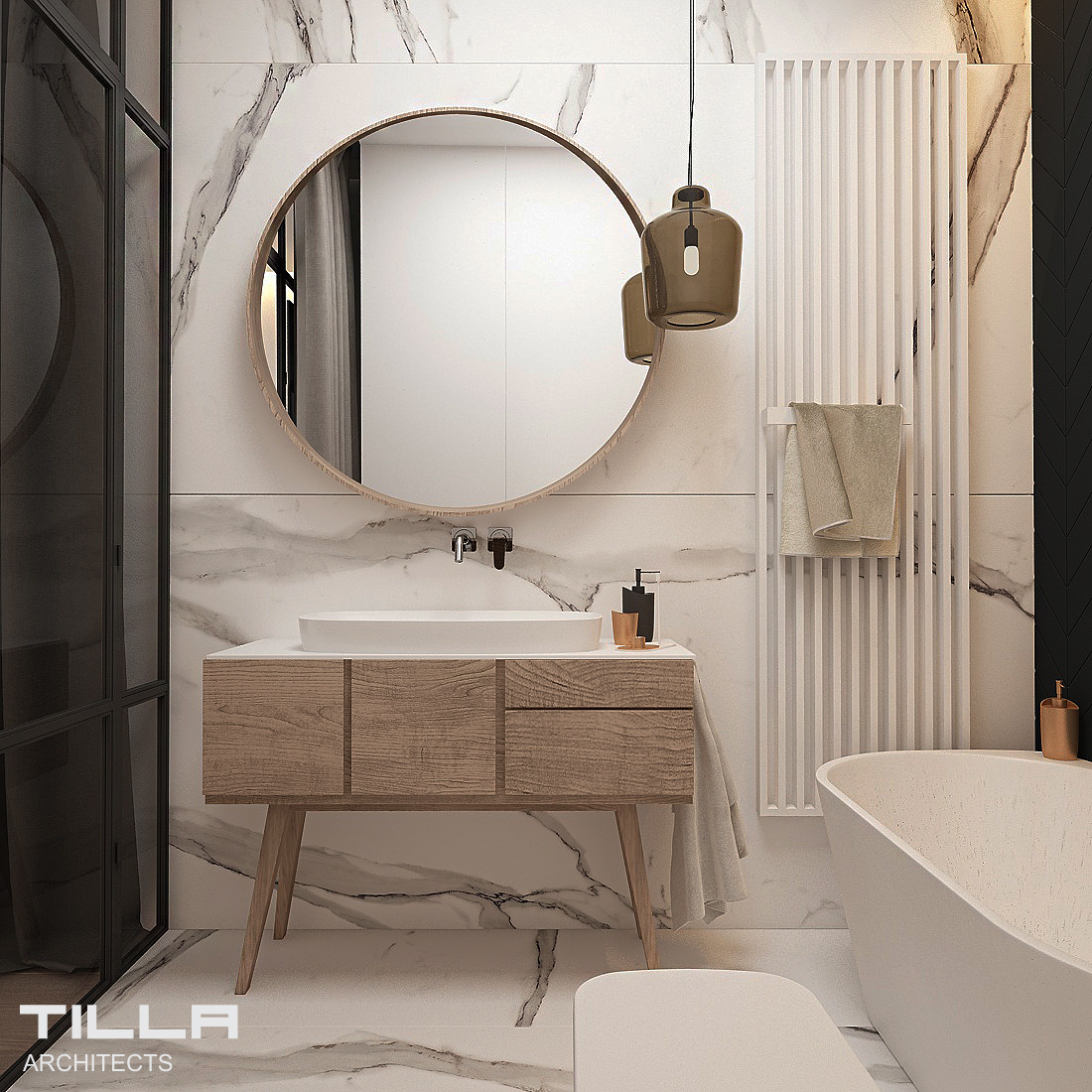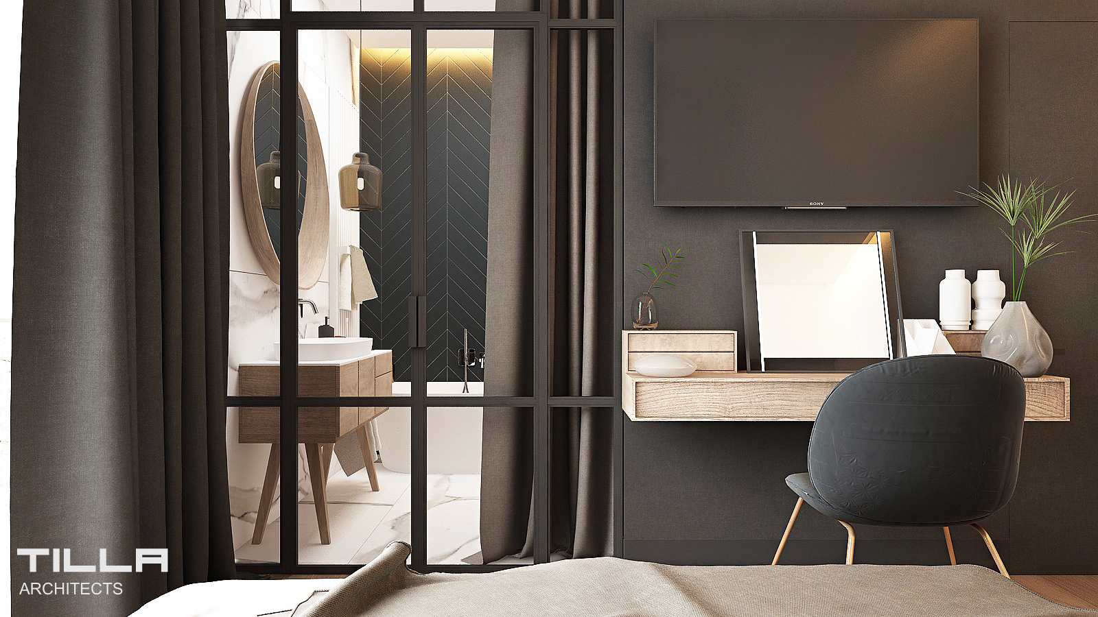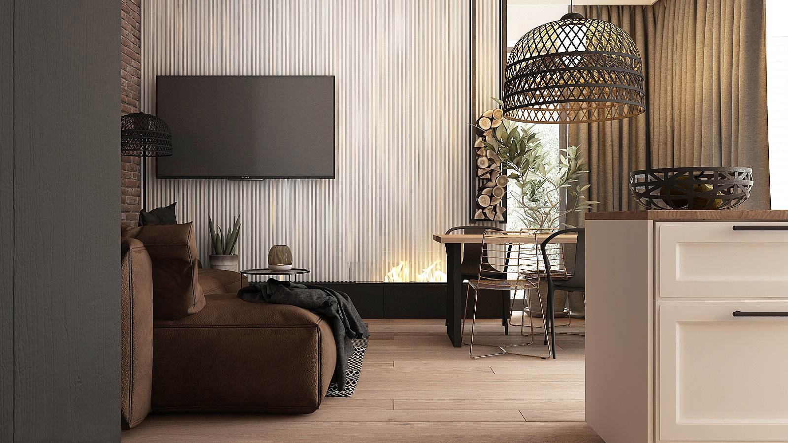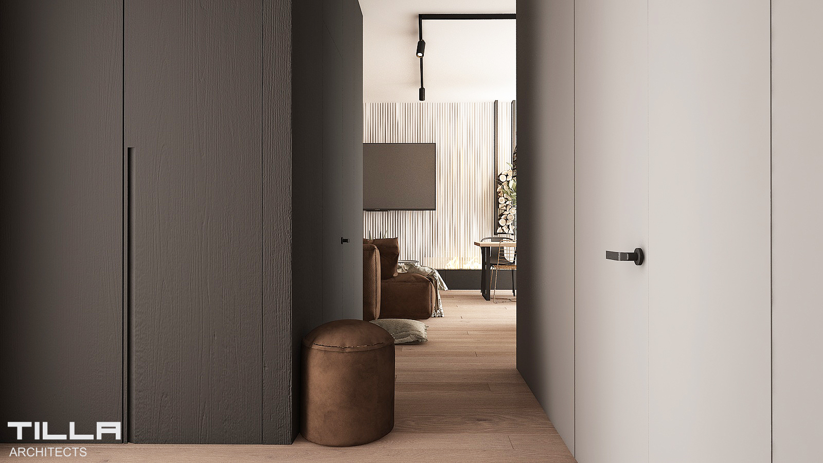 Atmosferę tworzą tu kolory – cegła, czerń, złamane biele i barwy ziemi, zastosowane konsekwentnie w całym apartamencie (poza pokojami dzieci). Wzrok przyciąga bogactwo faktur, wzorów i materiałów, które łączą się w harmonijną całość, tworząc nasycone i niepowtarzalne miejsce, w którym subtelnie pobrzmiewają industrialne echa.