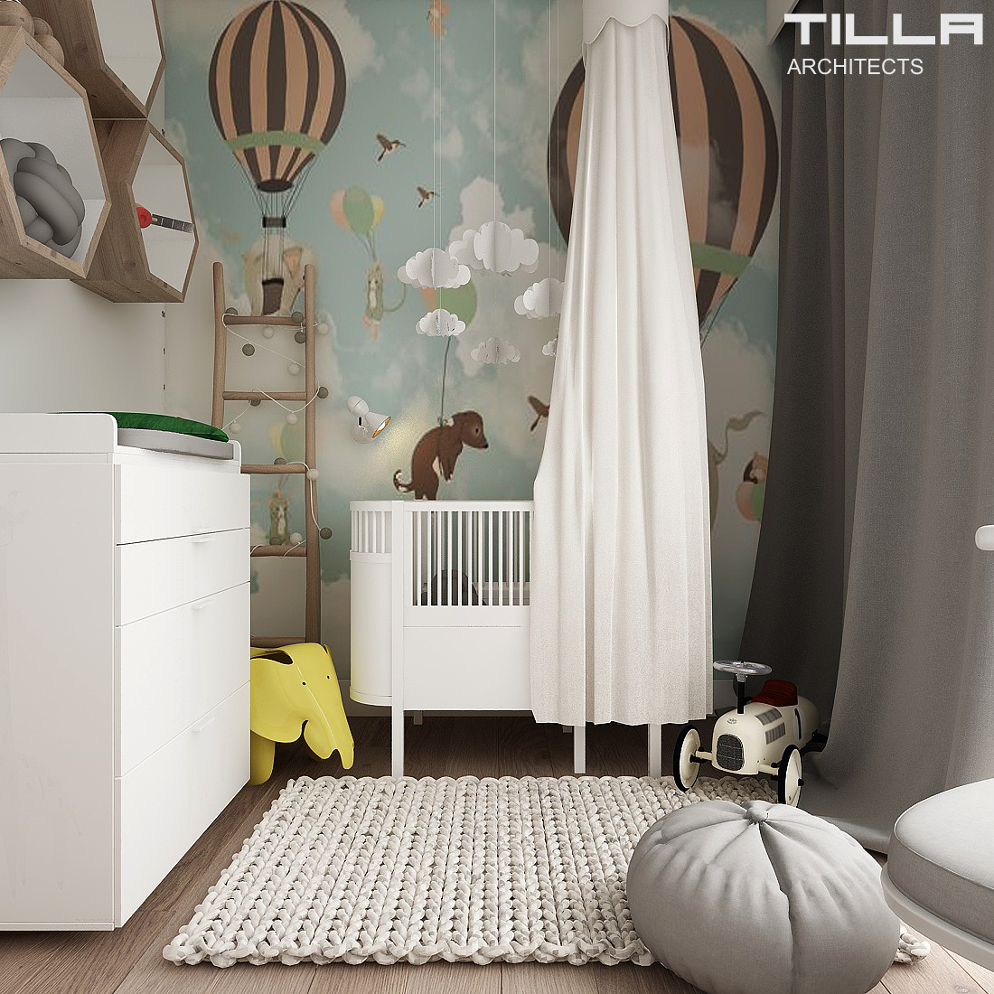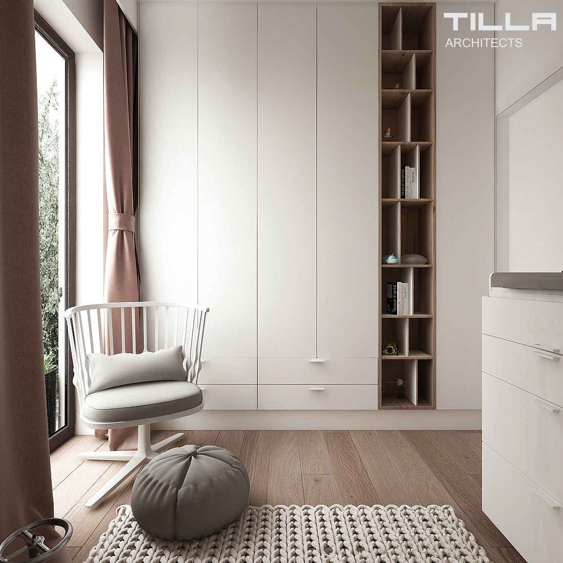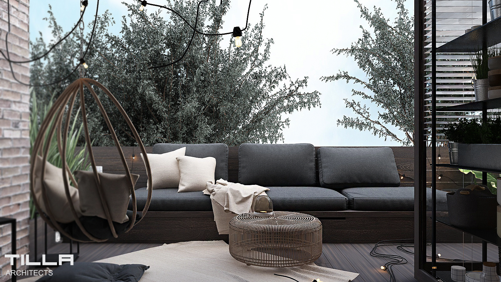 Strefę dzienną tworzy salon oraz otwarta kuchnia, a także balkon z wygodnymi siedziskami i huśtawką. Nie mogło również zabraknąć miejsca do pracy zdalnej. Ponadto, w apartamencie znajdują się dwie łazienki, sypialnia wraz z garderobą oraz dwa pokoje dziecięce.