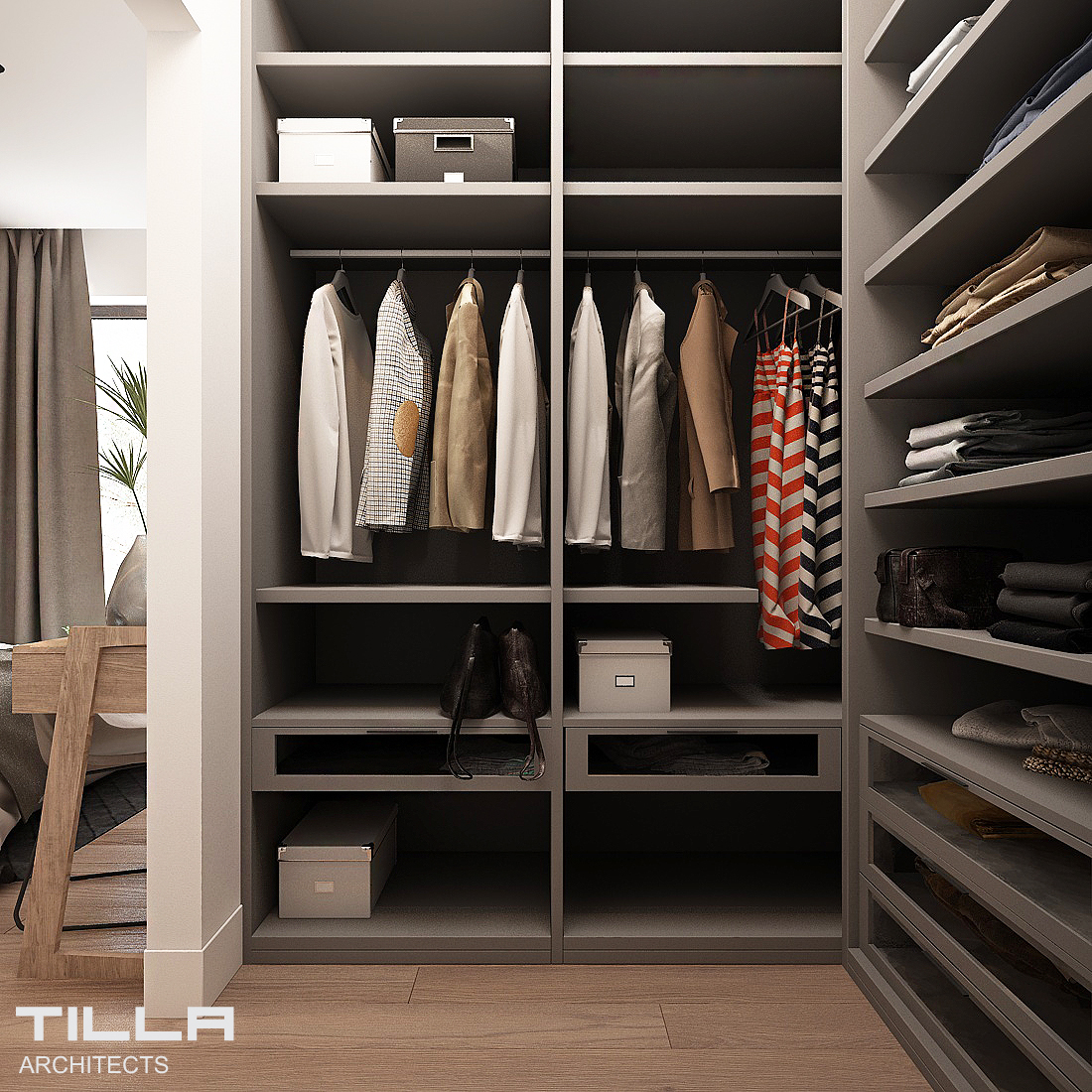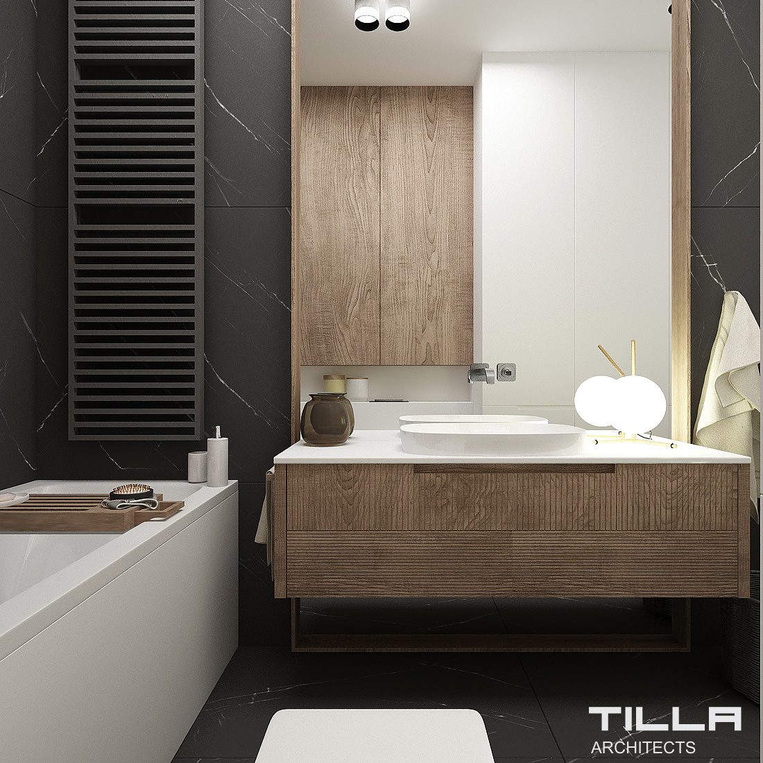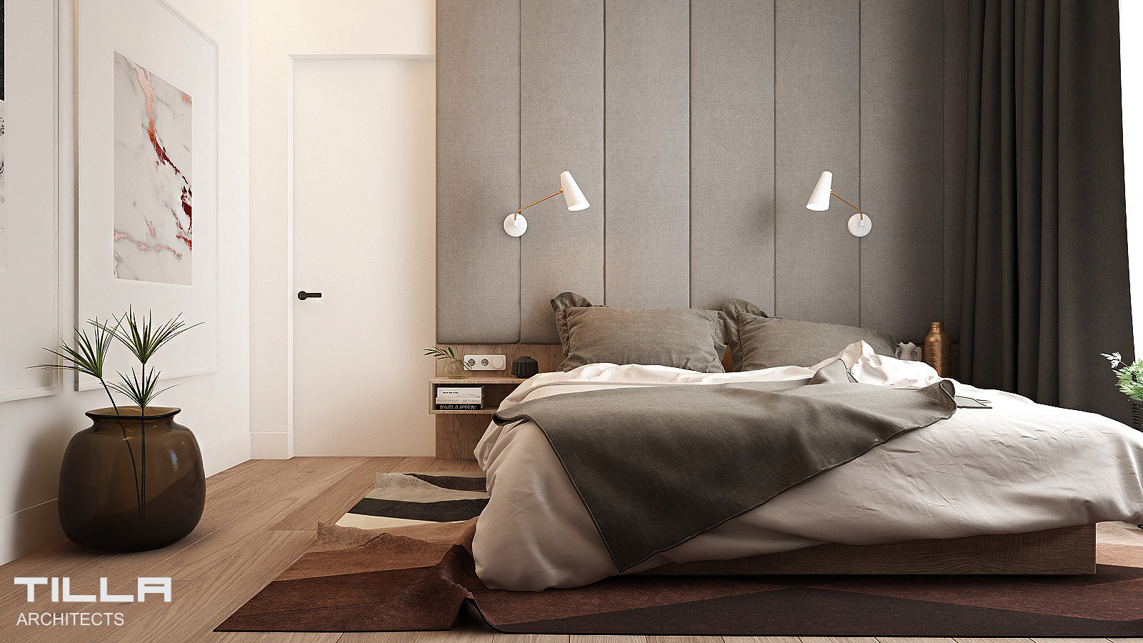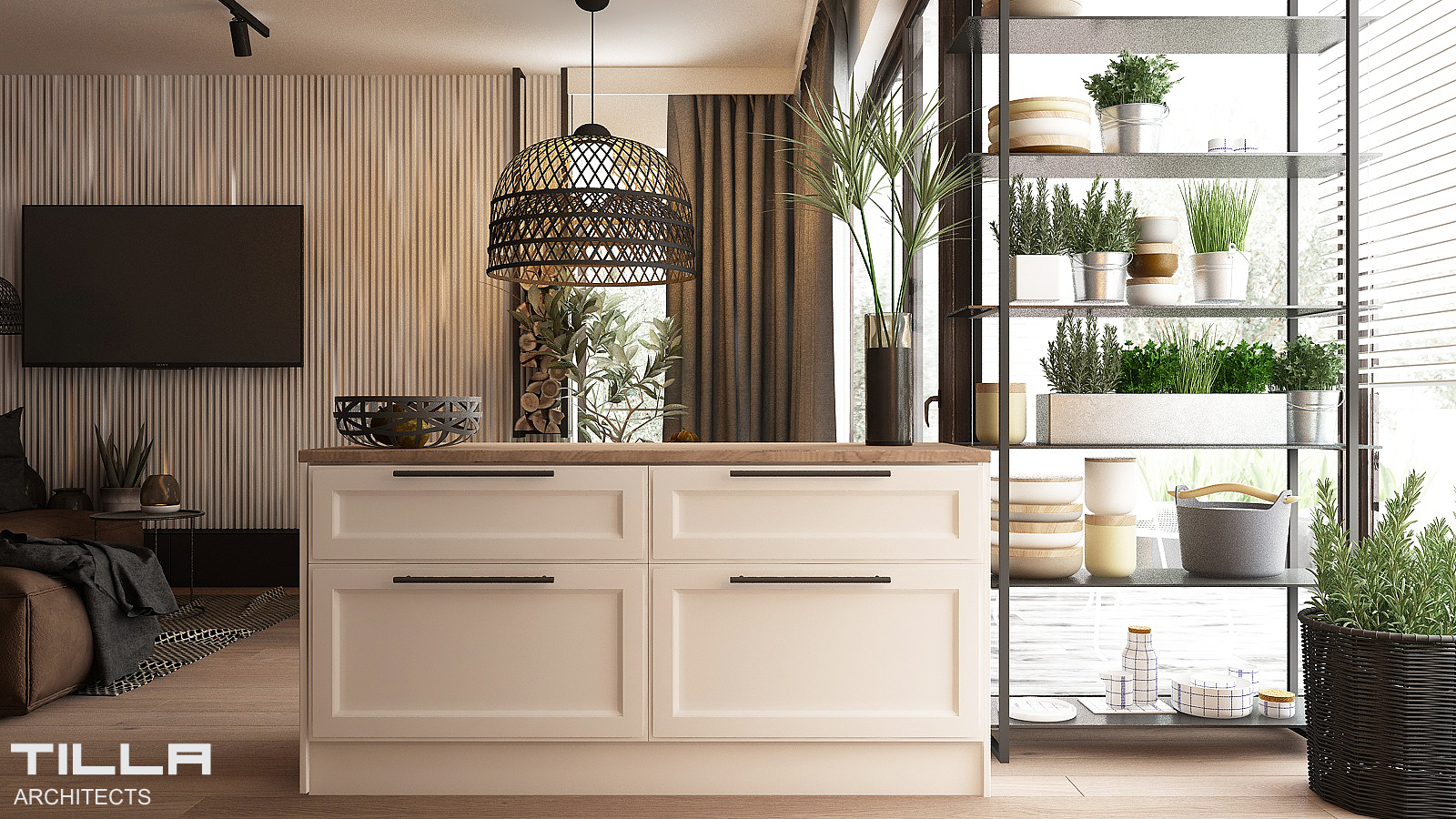Strefę dzienną tworzy salon oraz otwarta kuchnia, a także balkon z wygodnymi siedziskami i huśtawką. Nie mogło również zabraknąć miejsca do pracy zdalnej. Ponadto, w apartamencie znajdują się dwie łazienki, sypialnia wraz z garderobą oraz dwa pokoje dziecięce.