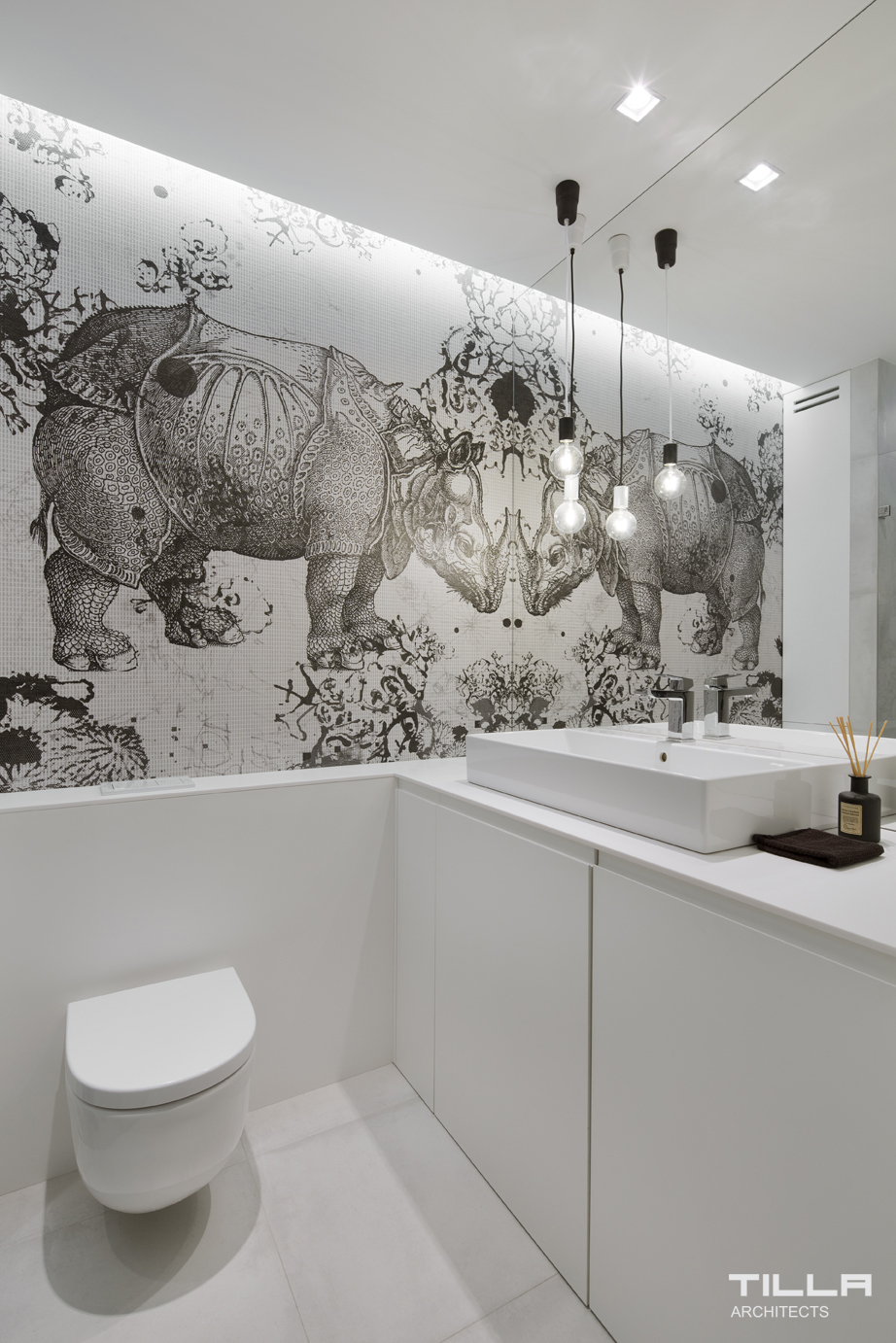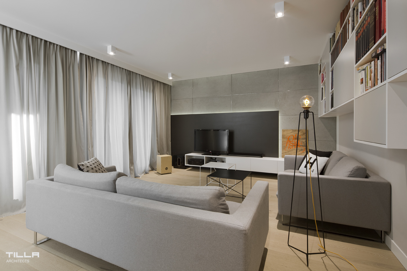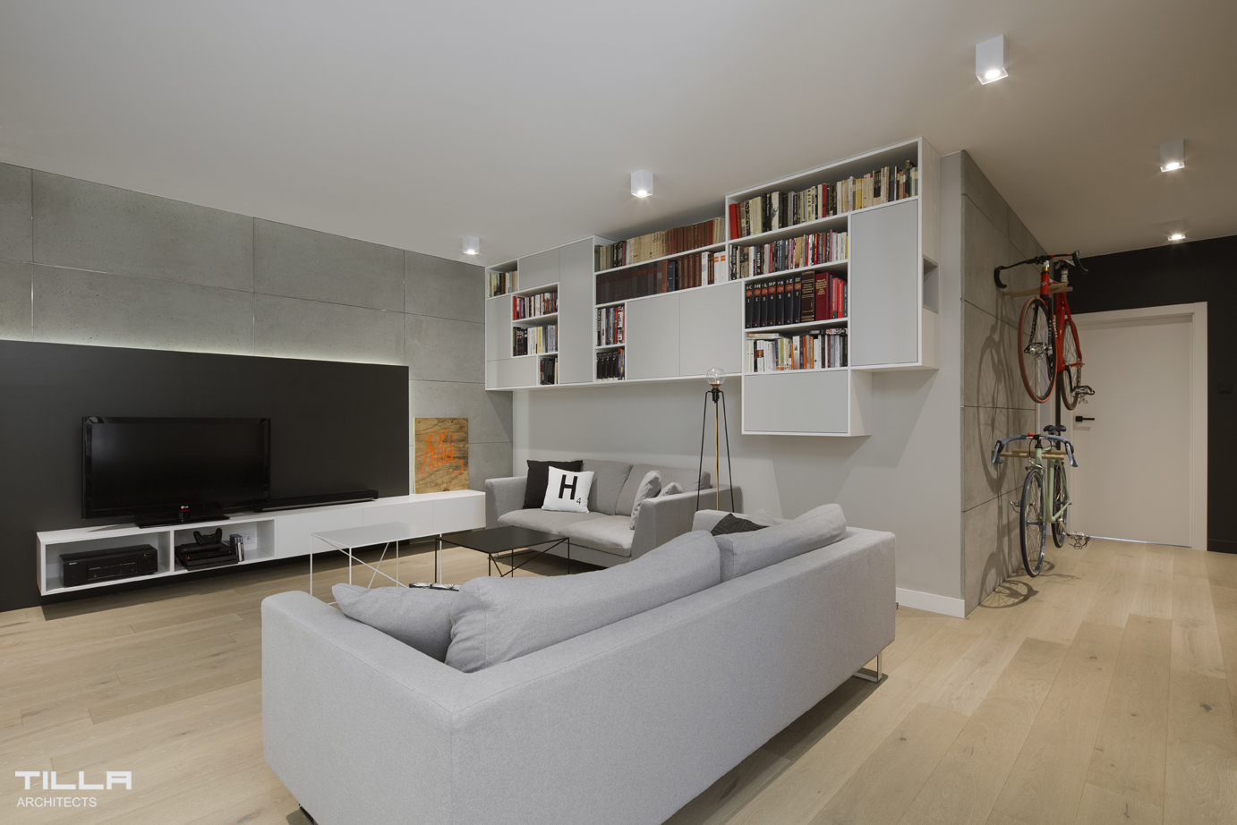 W salonie nie mogło zabraknąć miejsca na rowery właścicieli. Na jednej ze ścian zawieszono więc specjalne haki, na których wyeksponowano jednoślady. Choć we wnętrzu znajduje się wiele betonu, nie jest ono pozbawione ciepła. Wygodna strefa wypoczynkowa wraz z TV i biblioteczką są idealnym miejsce relaksu. Na uwagę zasługuje również łazienka, której ścianę zdobi grafika ze stylizowanym nosorożcem. Całość jest funkcjonalna, przyjemna dla oka i oddaje charakter inwestorów.