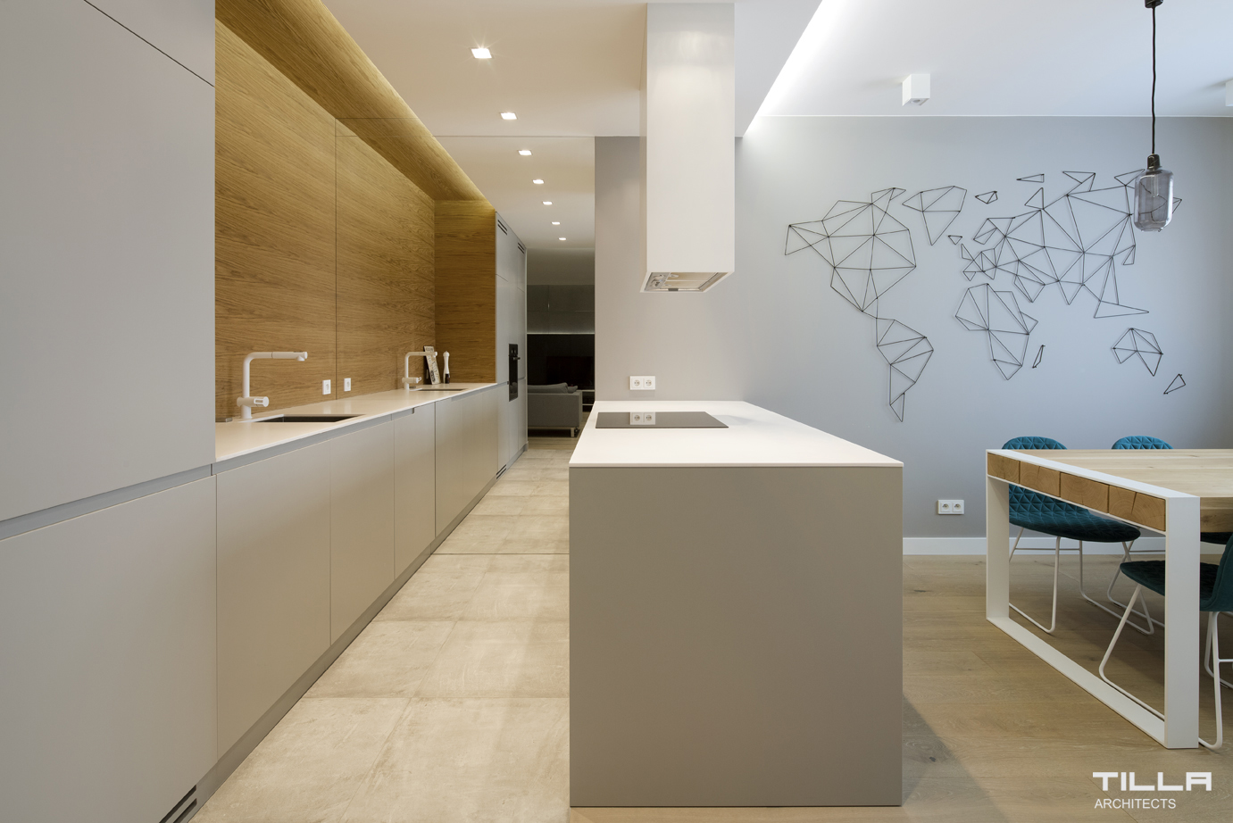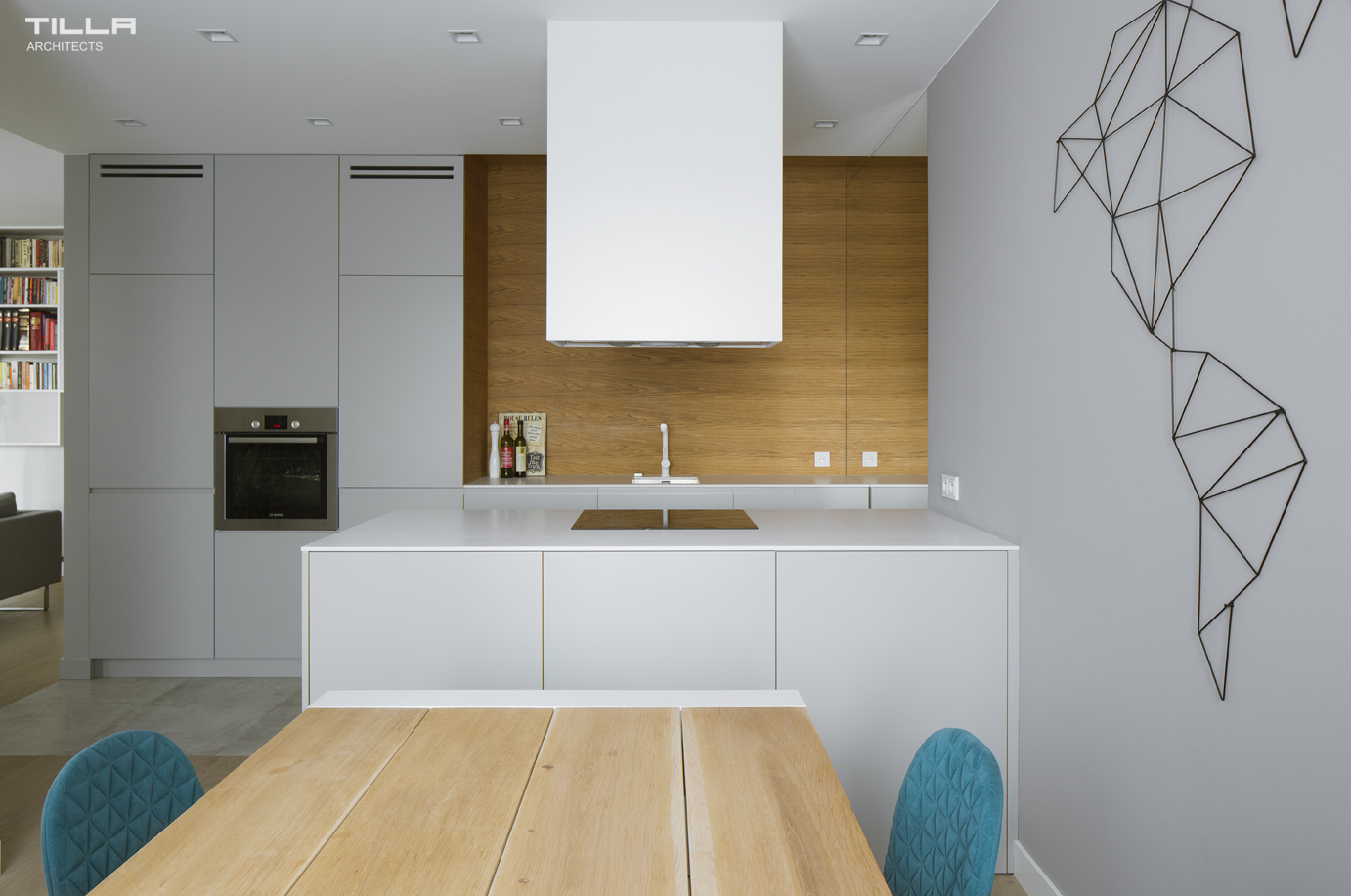 Przestronny apartament na warszawskim Mokotowie powstał dla wielbicieli jazdy na rowerze. Został utrzymany w duchu minimalizmu, jest funkcjonalny, nowoczesny i przytulny. Strefę dzienną tworzą salon wraz z otwartą kuchnią. W strefie gotowania króluje biel i drewno. Meble bez frontów, prosta wyspa wraz z minimalistycznym okapem tworzą harmonijną, spójną całość. Kącik jadalniany zdobi ścienna instalacja w postaci geometrycznej mapy świata.