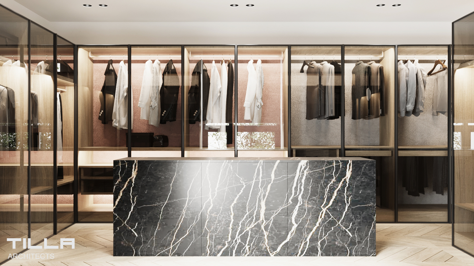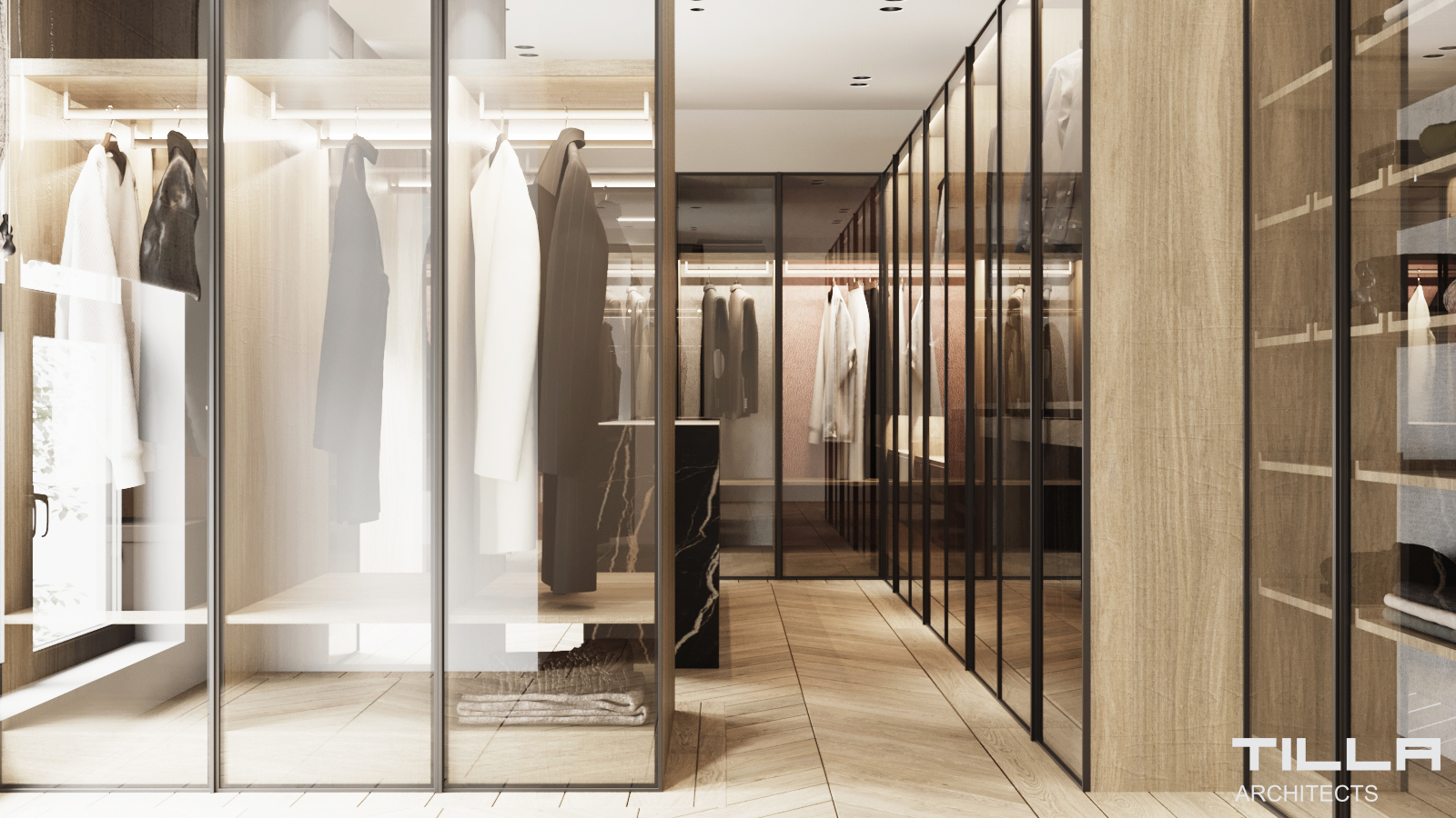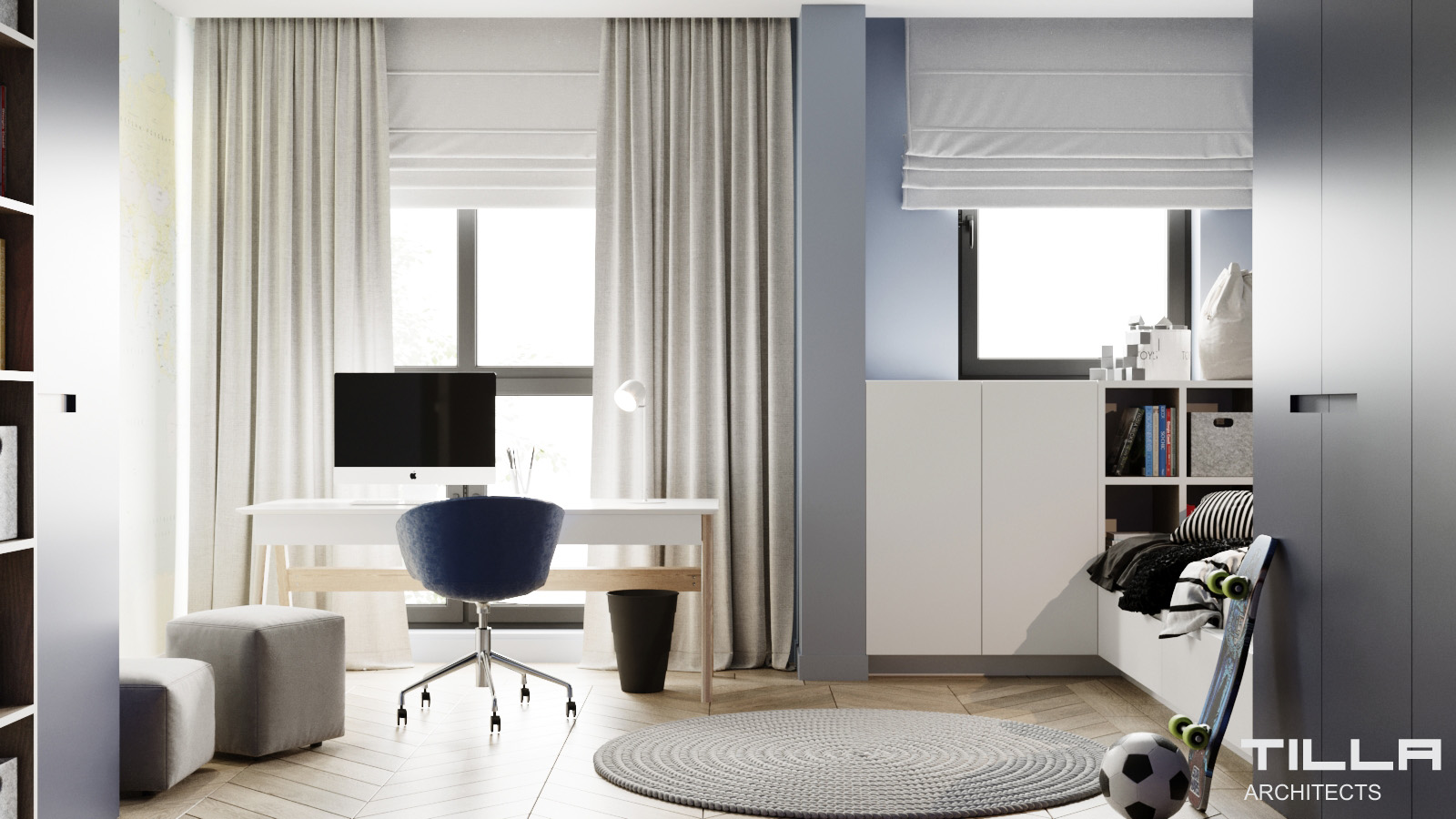 Na uwagę zasługuje również przestronna garderoba. Przeszklona i podświetlona niezwykle eksponuje ubrania. Toaletka gościnna jest kontynuacją całości – harmonijna i elegancka. Pomieszczeniem, które wyróżnia się z całej kompozycji jest pokój syna właścicieli utrzymany w odcieniach granatu i beżu. Ozdobę tego wnętrza stanowi tapeta z motywem mapy. Znajduje się tu dużo zabudów, które zapewniają miejsce do przechowywania. Apartament na Białym Kamieniu to miejsce pełne niewymuszonej, wyrafinowanej elegancji.