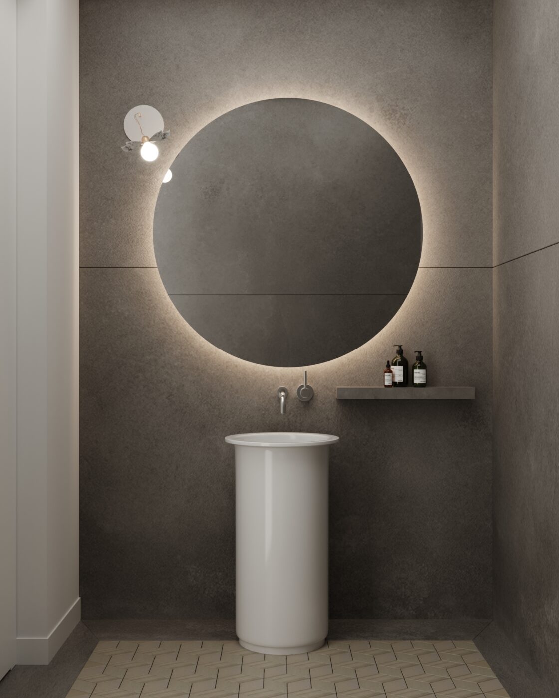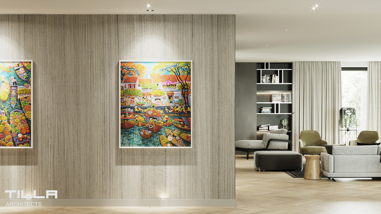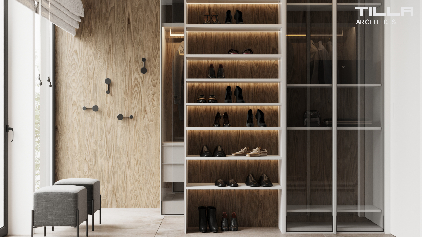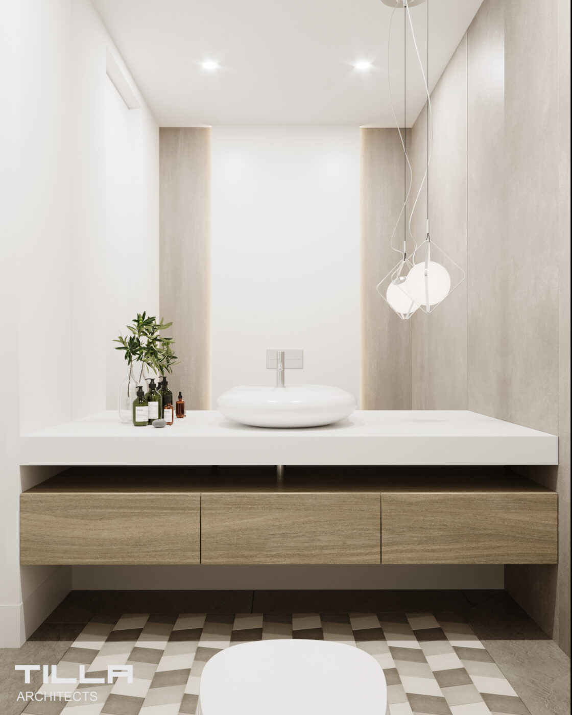 Na uwagę zasługuje również przestronna garderoba. Przeszklona i podświetlona niezwykle eksponuje ubrania. Toaletka gościnna jest kontynuacją całości – harmonijna i elegancka. Pomieszczeniem, które wyróżnia się z całej kompozycji jest pokój syna właścicieli utrzymany w odcieniach granatu i beżu. Ozdobę tego wnętrza stanowi tapeta z motywem mapy. Znajduje się tu dużo zabudów, które zapewniają miejsce do przechowywania. Apartament na Białym Kamieniu to miejsce pełne niewymuszonej, wyrafinowanej elegancji.