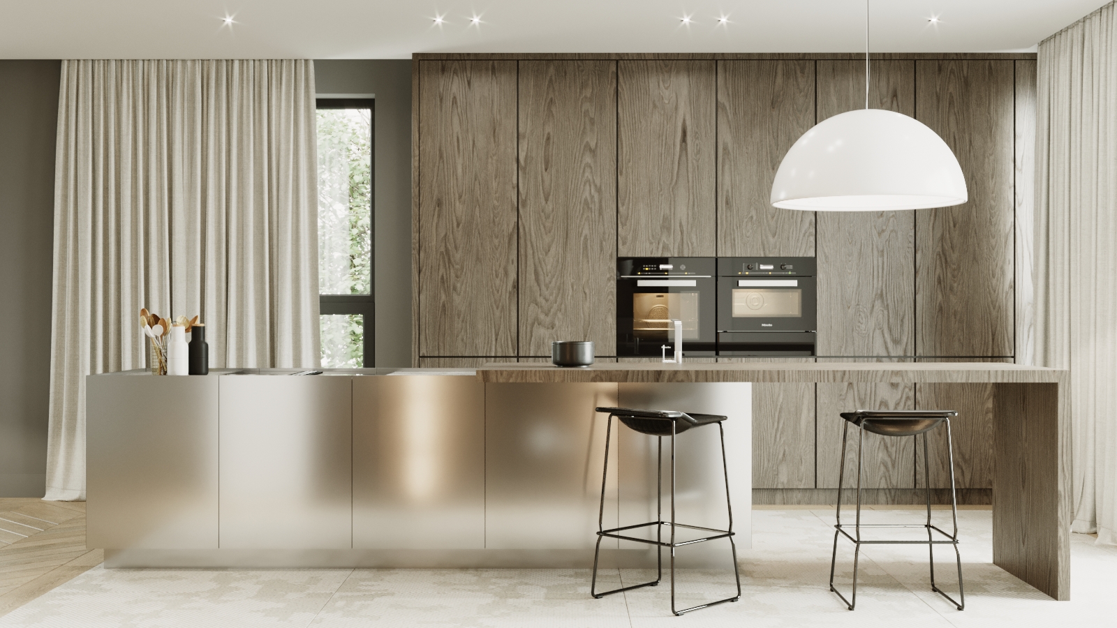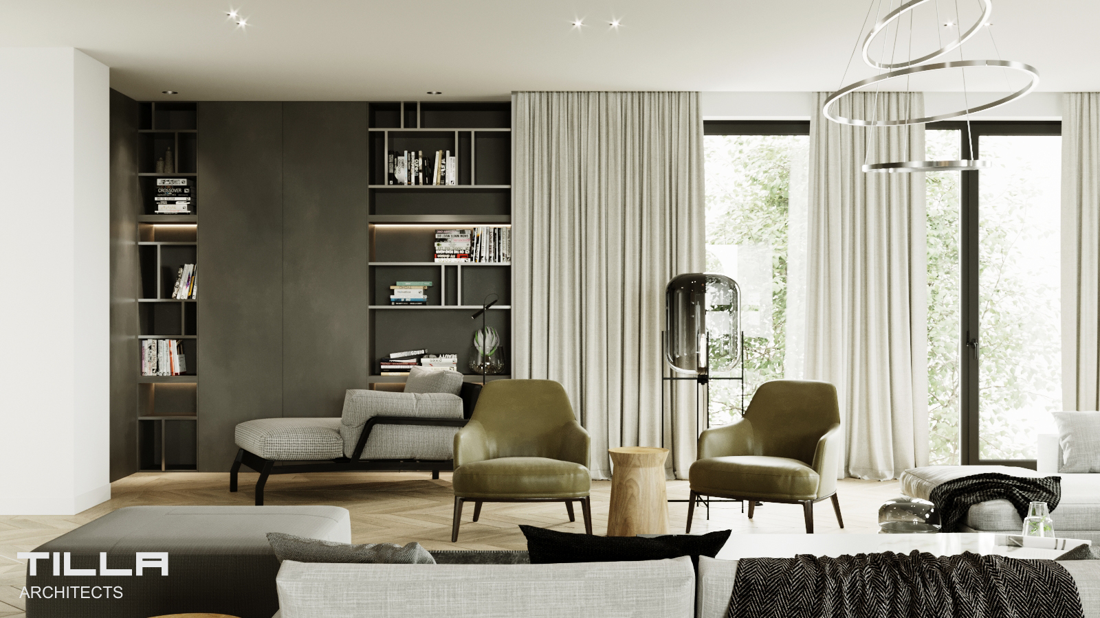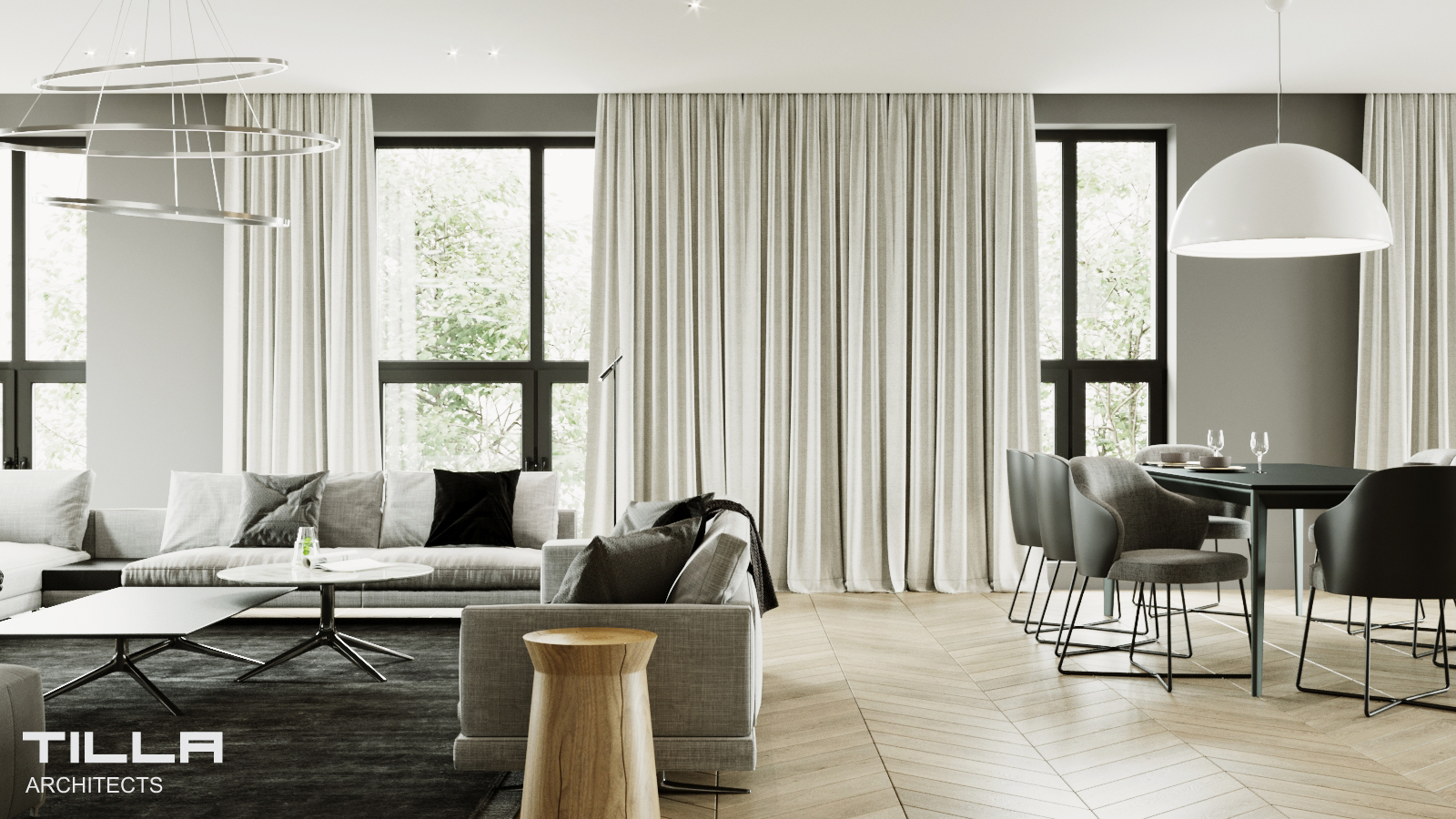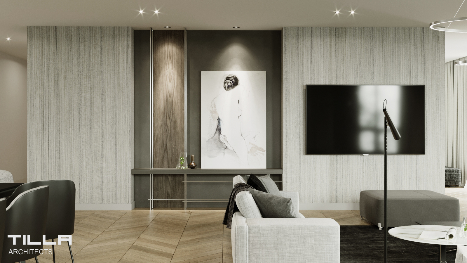 Wnętrza apartamentu położonego na Białym Kamieniu są zaprojektowane z rozmachem i dbałością o każdy detal. Niezwykle istotną rolę odgrywa tu oświetlenie, które wydobywa to, co najpiękniejsze i podkreśla charakter dekoracyjnych detali. Przestronny salon mieści w sobie kącik wypoczynkowy, biblioteczkę wraz z wygodnym szezlongiem oraz część jadalnianą. Podłogę zdobi deska ułożona w jodełkę, ściany utrzymano w beżach i szarościach o ciepłych odcieniach. Wartość do wnętrza wnoszą też tkaniny – ciężkie zasłony, dywan oraz tapicerki mebli wypoczynkowych, które dodają elegancji i tworzą spójną kolorystyczną kompozycję. Wyposażenie o szlachetnych formach dopełnia całość – jest komfortowe i jednocześnie przyjemne dla oka. Otwarta kuchnia łączy się z pozostałą częścią strefy dziennej – tworzą ją prosta drewniana zabudowa, elegancka wyspa oraz blat wraz z hokerami.