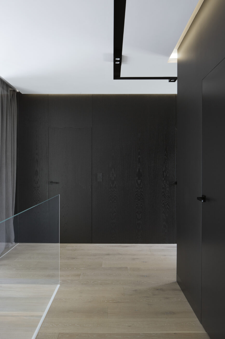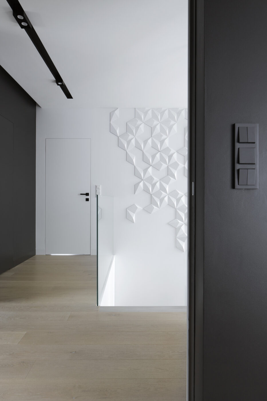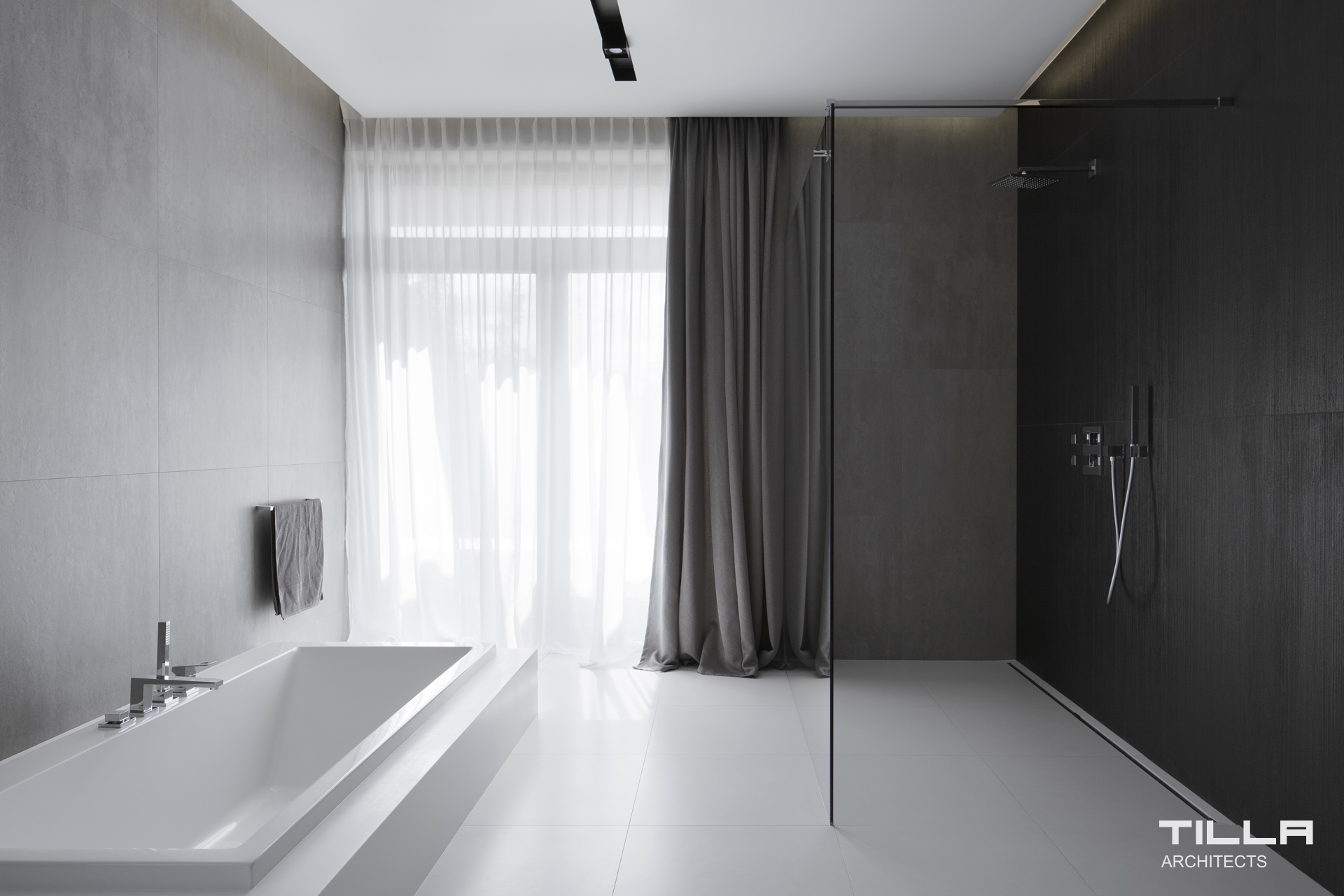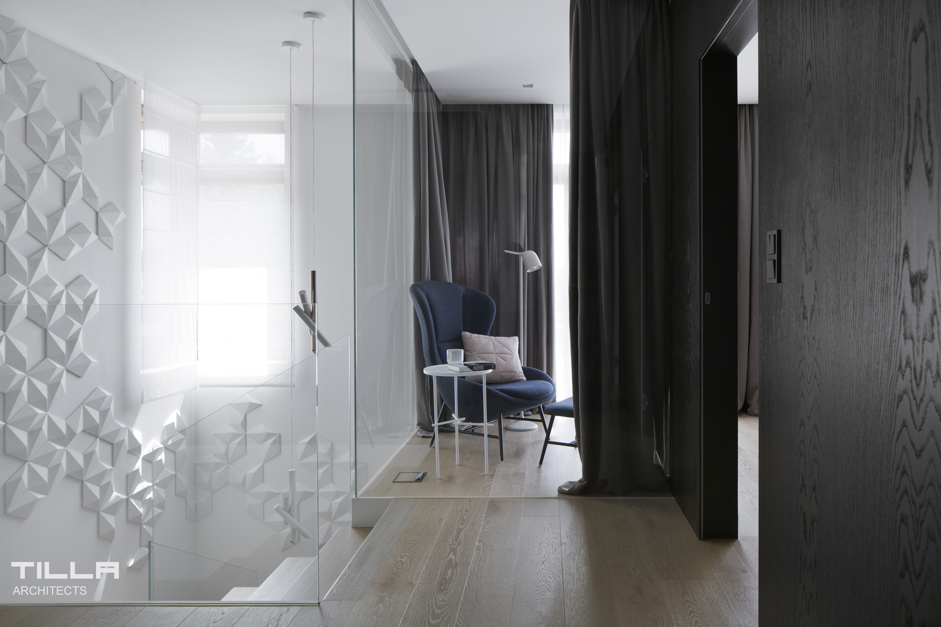 Klatkę schodową zdobią płytki ułożone w nieregularny geometryczny wzór. Ściany hallu na piętrze wyłożono drewnem w kolorze czerni. Ten kolor dominuje również w sypialni. Ścianę za łóżkiem pokrywają czarne lamele, zabudowy również przybrały tę barwę. Łazienka master jest utrzymana w minimalistycznym stylu. Pierwsze skrzypce gra tutaj wanna wpuszczona w warstwy posadzki. Ściana z prysznicem typu walk-in pokryta jest strukturalnymi antracytowymi płytami gresowymi, a tę za wanną zdobią płyty przypominające na myśl beton. Przestrzeń tworzy spójną całość, która jest wizytówką klasycznego minimalizmu.