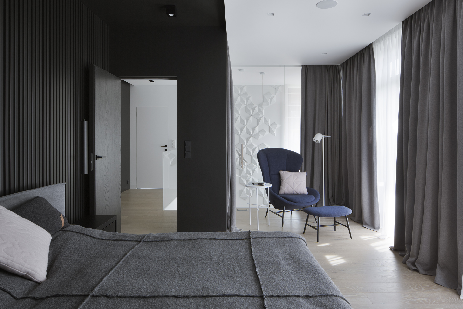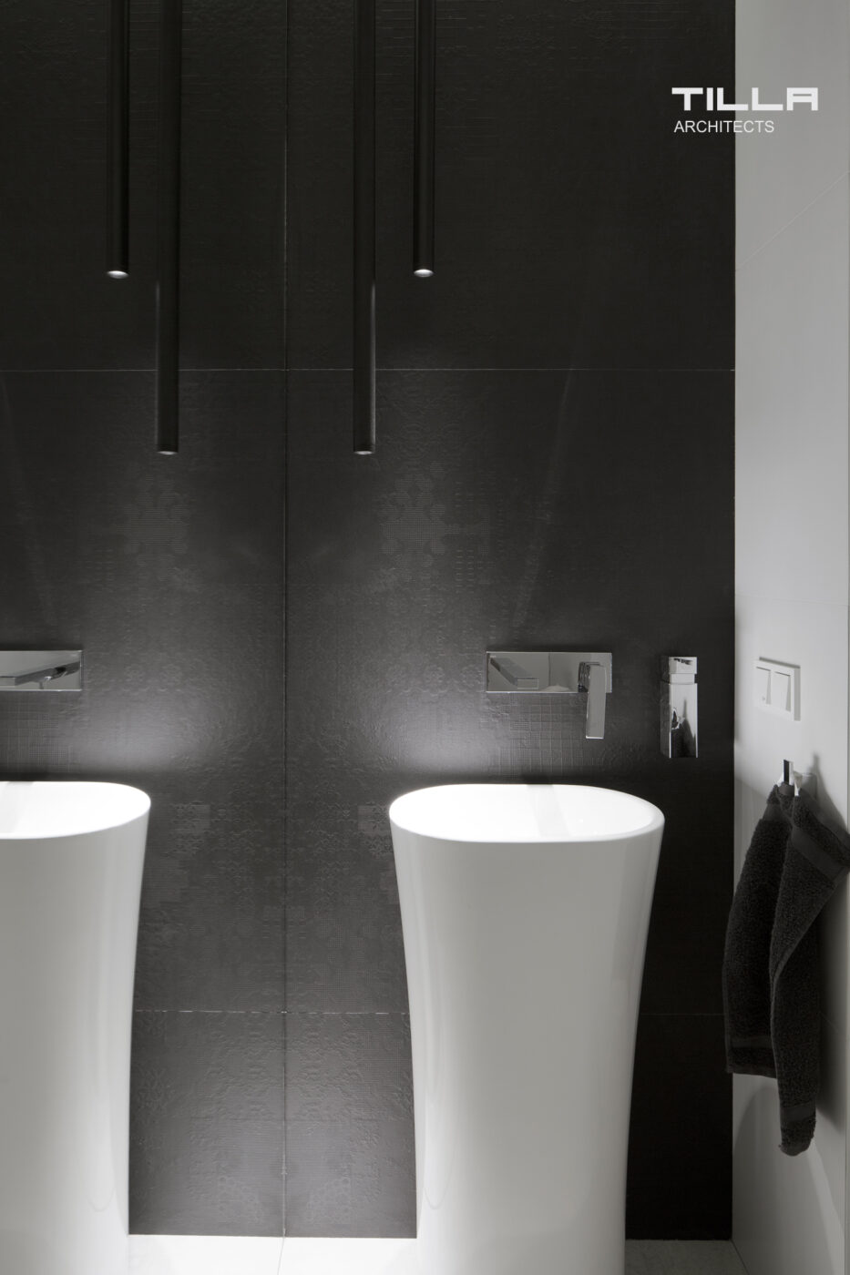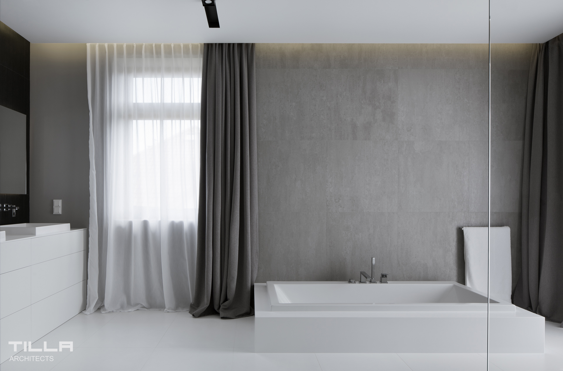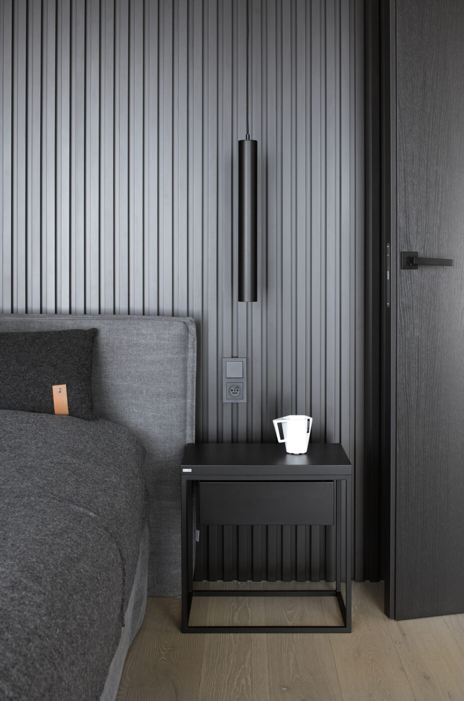 Klatkę schodową zdobią płytki ułożone w nieregularny geometryczny wzór. Ściany hallu na piętrze wyłożono drewnem w kolorze czerni. Ten kolor dominuje również w sypialni. Ścianę za łóżkiem pokrywają czarne lamele, zabudowy również przybrały tę barwę. Łazienka master jest utrzymana w minimalistycznym stylu. Pierwsze skrzypce gra tutaj wanna wpuszczona w warstwy posadzki. Ściana z prysznicem typu walk-in pokryta jest strukturalnymi antracytowymi płytami gresowymi, a tę za wanną zdobią płyty przypominające na myśl beton. Przestrzeń tworzy spójną całość, która jest wizytówką klasycznego minimalizmu.