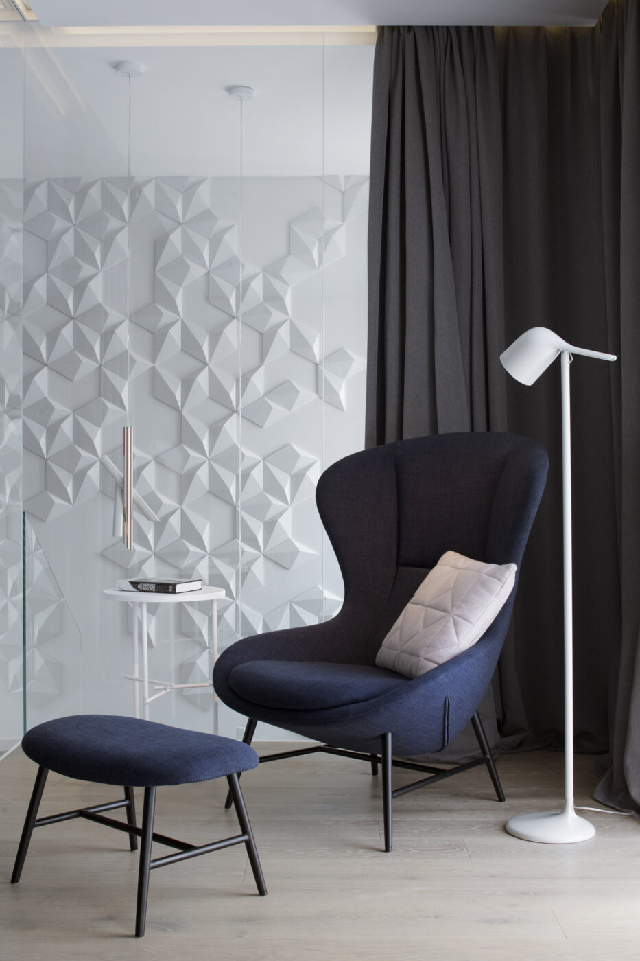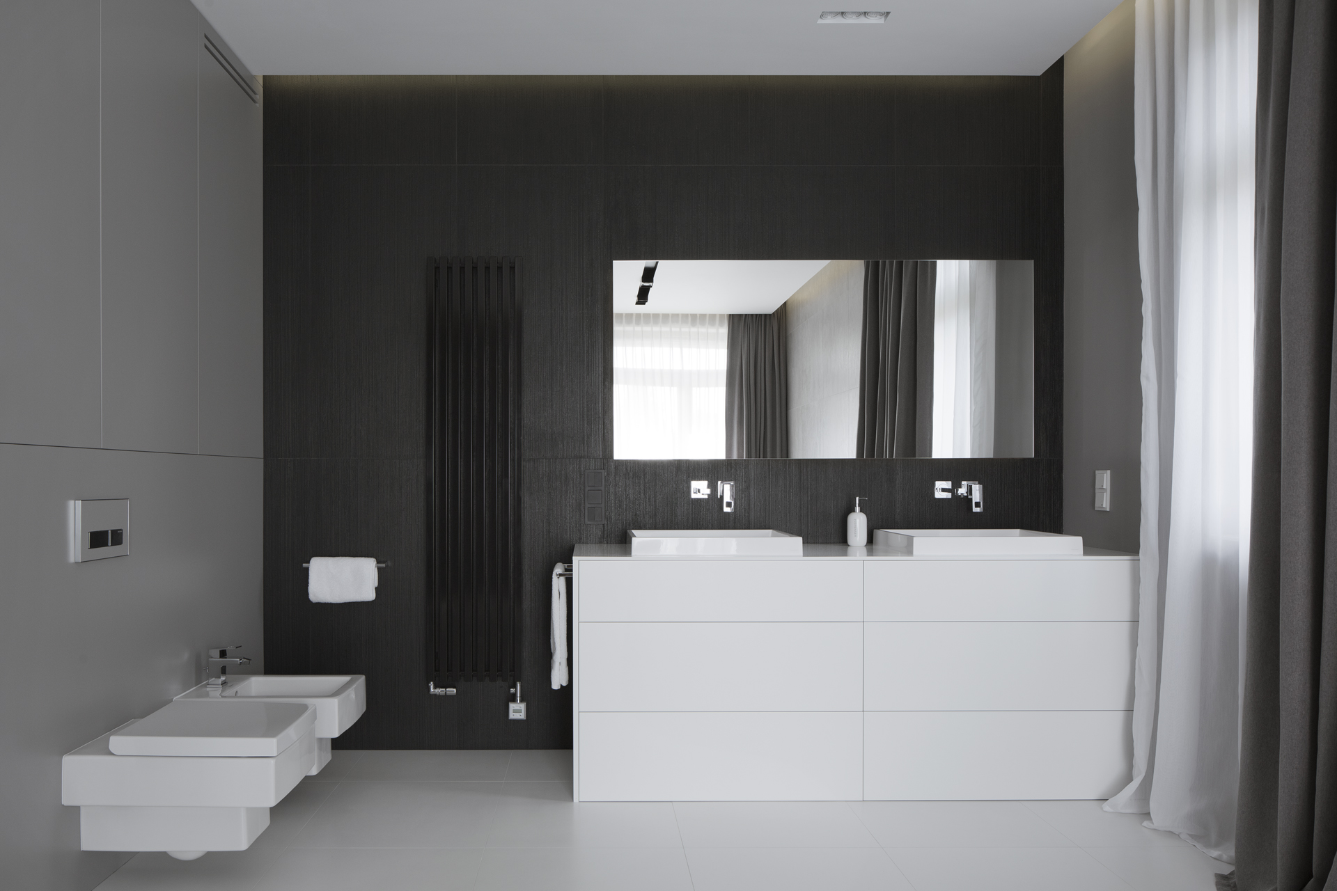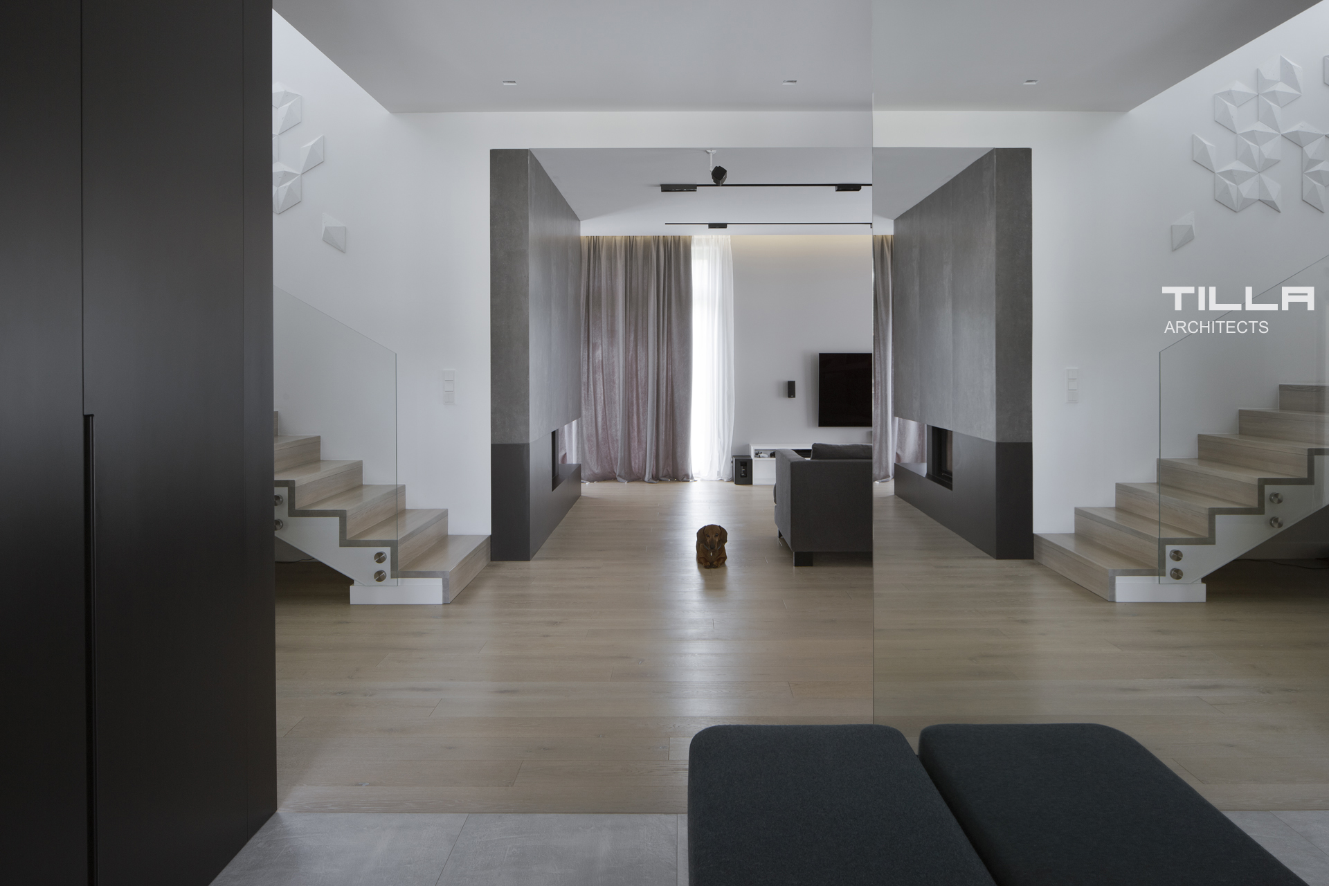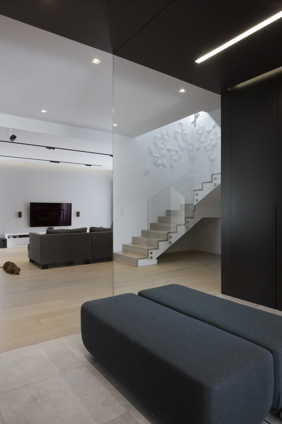 Klatkę schodową zdobią płytki ułożone w nieregularny geometryczny wzór. Ściany hallu na piętrze wyłożono drewnem w kolorze czerni. Ten kolor dominuje również w sypialni. Ścianę za łóżkiem pokrywają czarne lamele, zabudowy również przybrały tę barwę. Łazienka master jest utrzymana w minimalistycznym stylu. Pierwsze skrzypce gra tutaj wanna wpuszczona w warstwy posadzki. Ściana z prysznicem typu walk-in pokryta jest strukturalnymi antracytowymi płytami gresowymi, a tę za wanną zdobią płyty przypominające na myśl beton. Przestrzeń tworzy spójną całość, która jest wizytówką klasycznego minimalizmu.