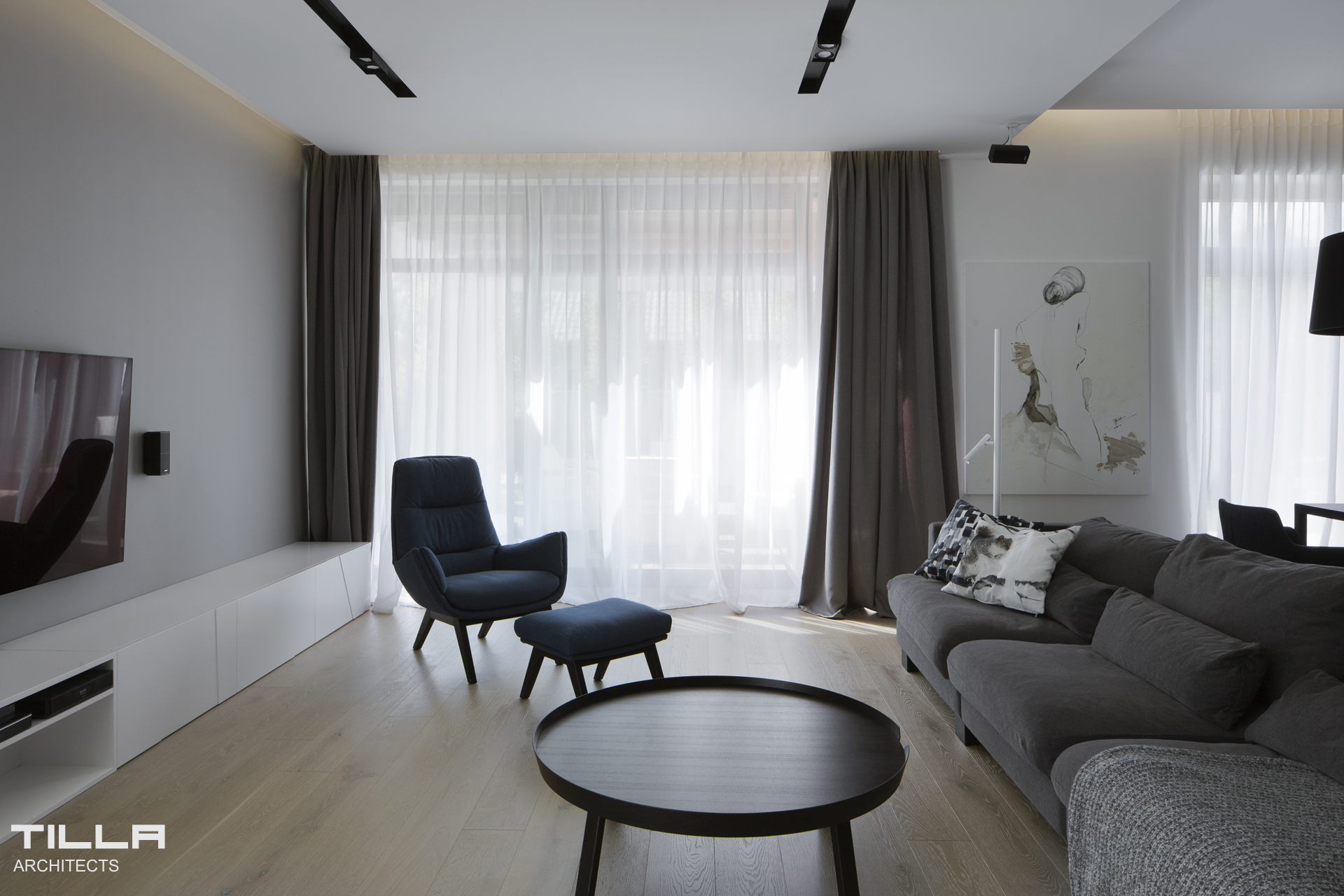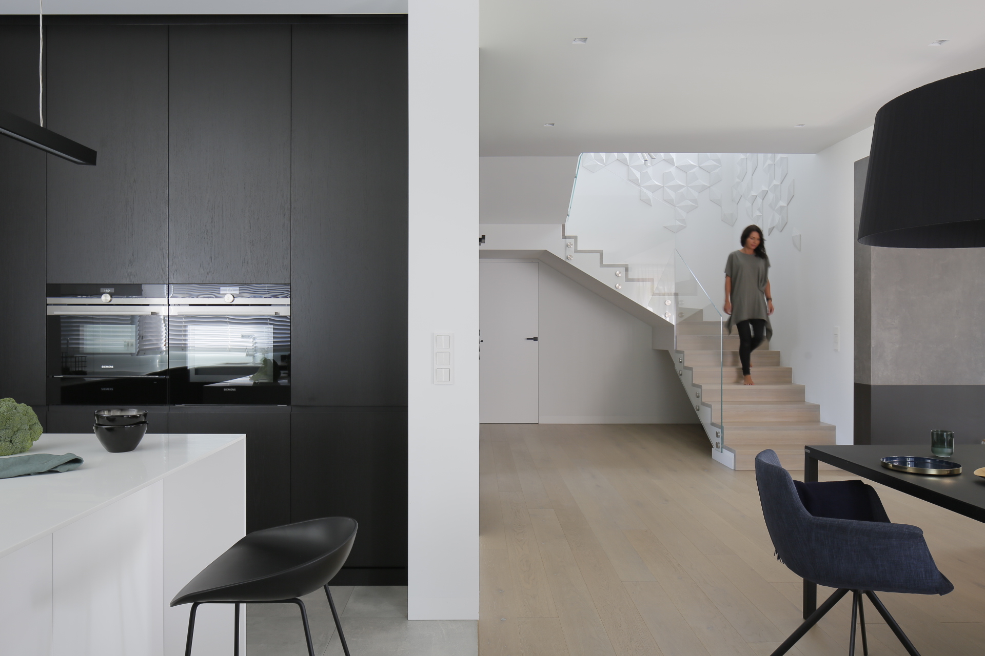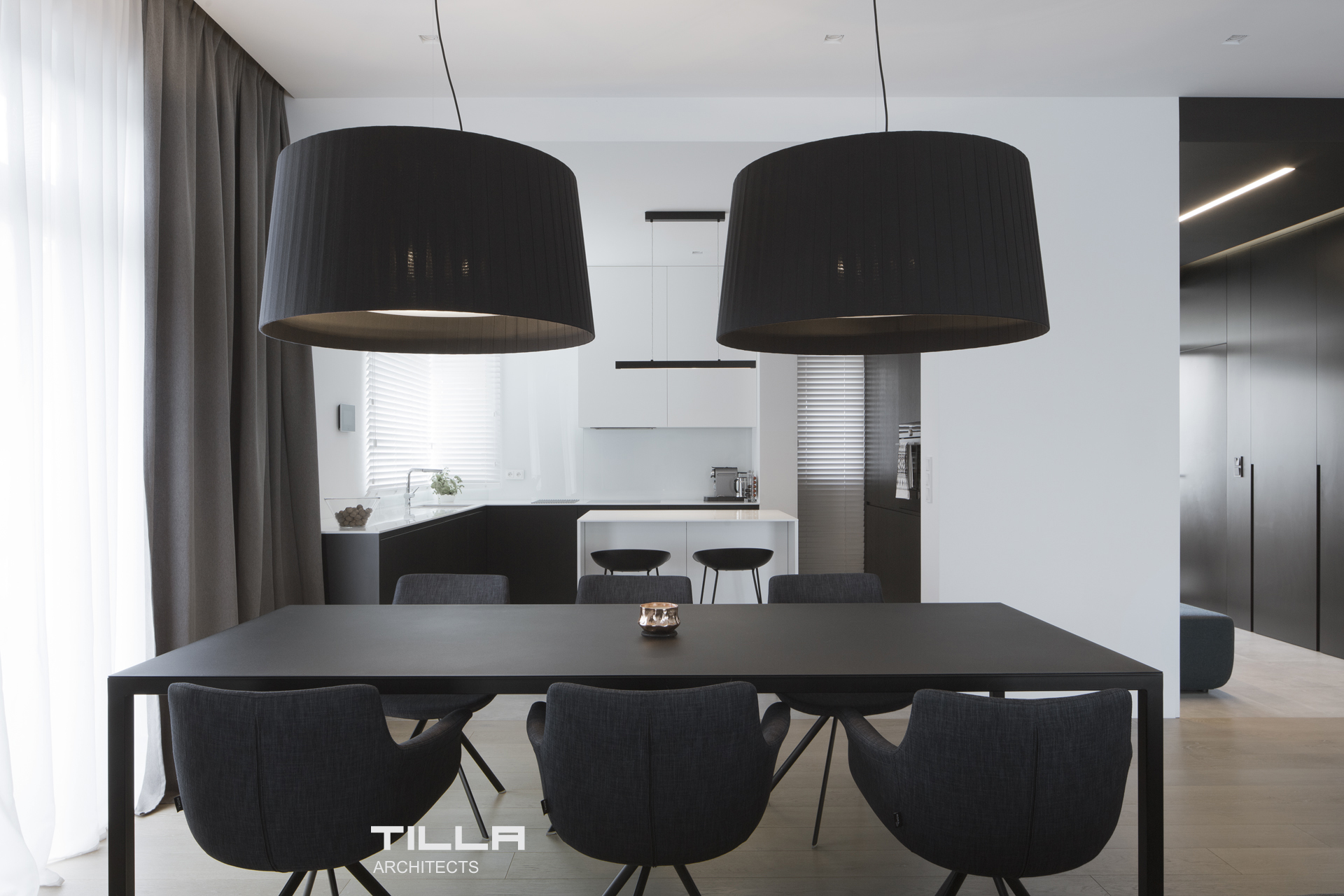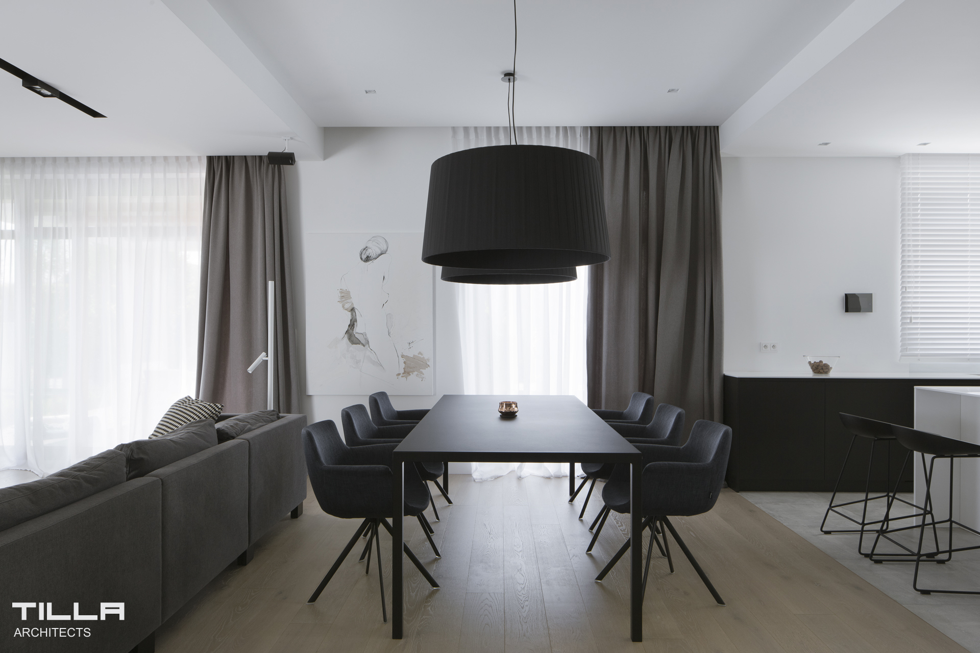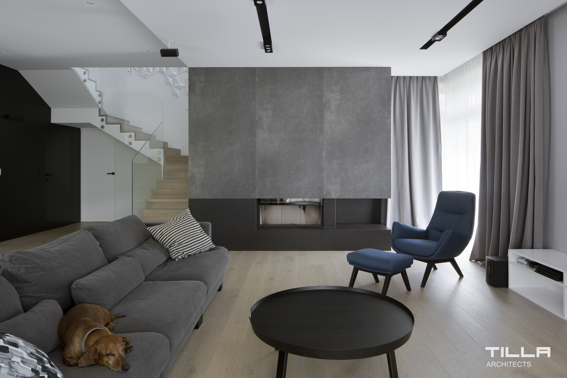 Ta nowoczesna rezydencja jest pełna szlachetnej prostoty. Nie ma tu żadnych zbędnych elementów i ozdobników, co sprawia, że na pierwszy plan wysuwa się starannie wybrane, nowoczesne wzornictwo. W salonie znalazła się wygodna kanapa i fotel wraz ze stolikiem kawowym i strefą RTV. Nie zabrakło także kominka. Ścianę nad nim pokrywają płyty o fakturze betonu, które dodają charakteru. Strefę jadalnianą tworzą czarny stół wraz z tapicerowanymi krzesłami i dużymi lampami w tym samym kolorze. W kuchni króluje połączenie czerni i bieli.