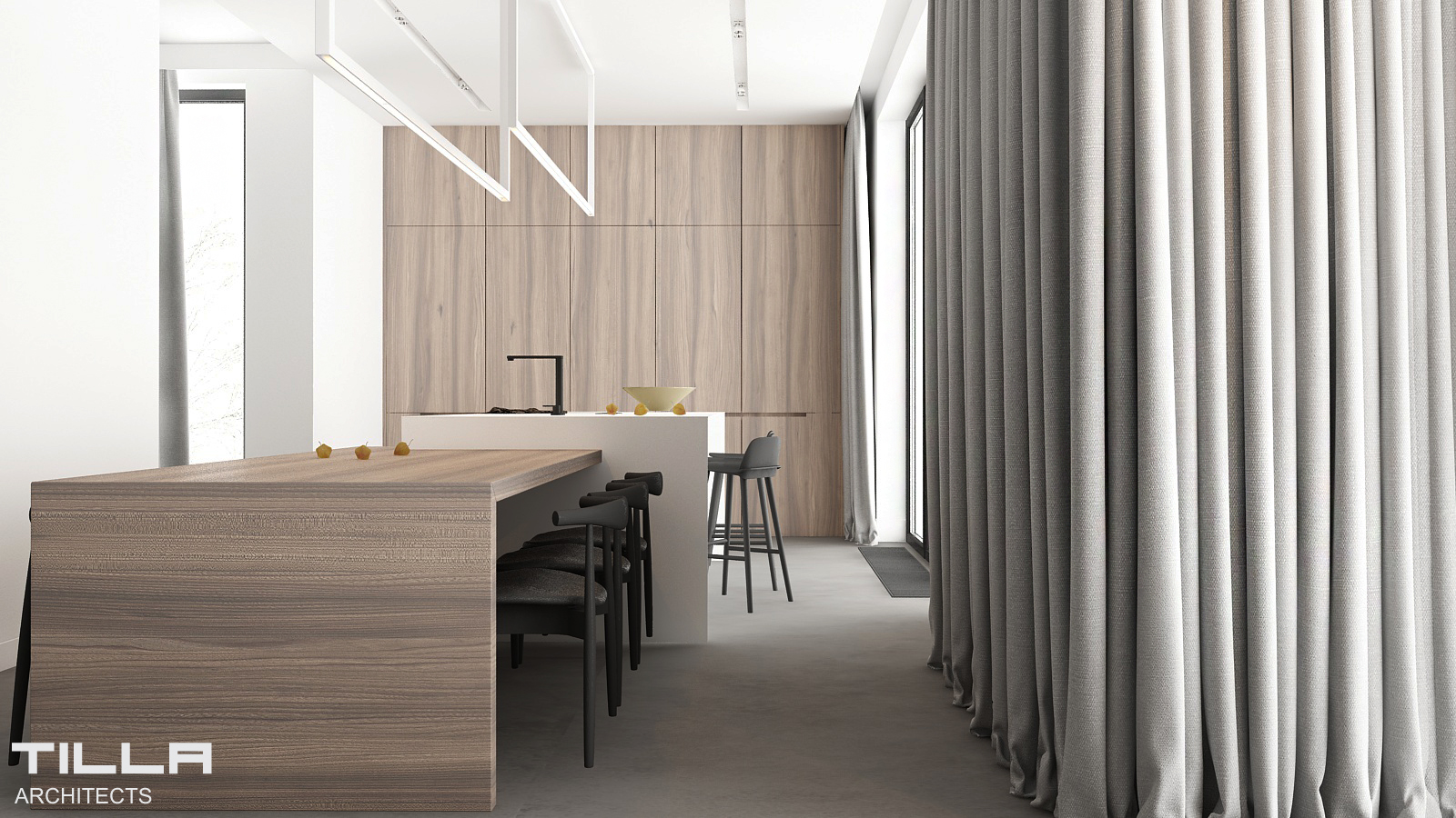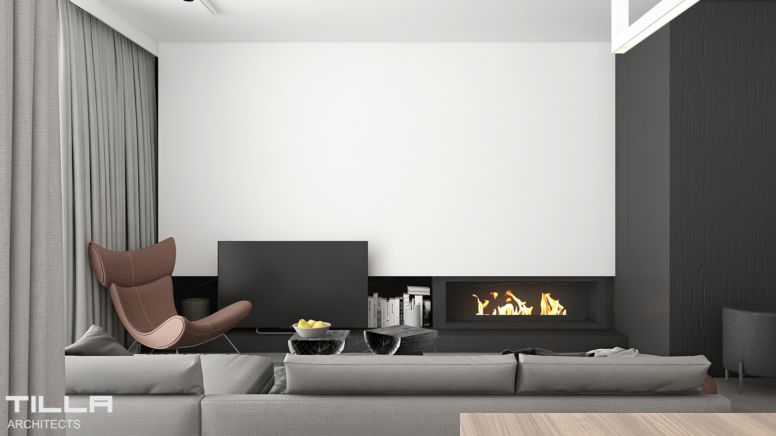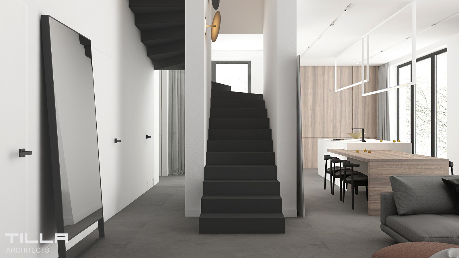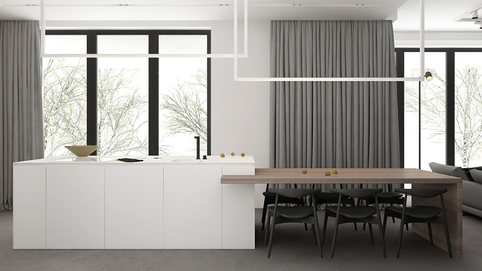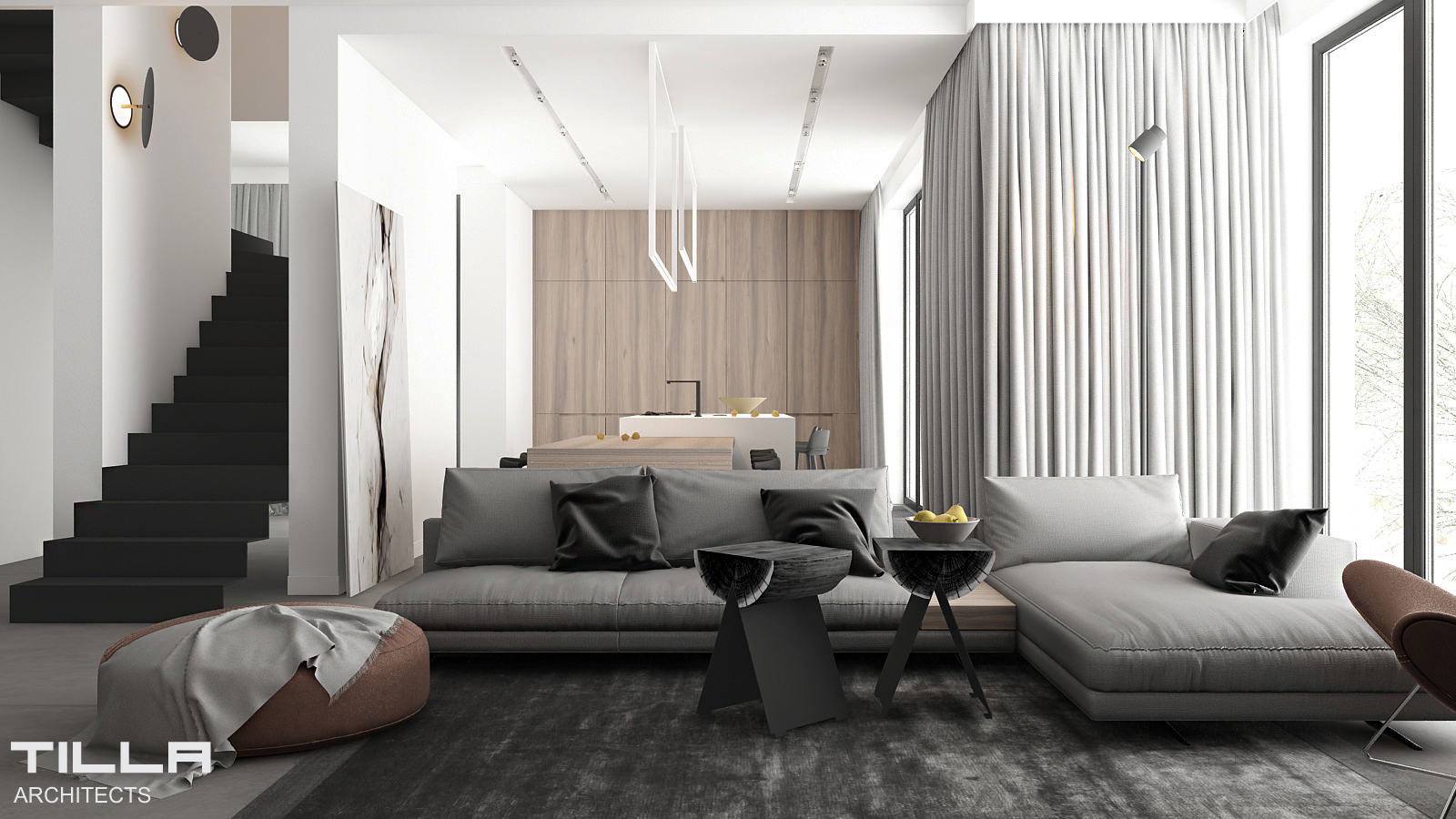 W tym domu króluje minimalizm, nowoczesne formy i prostota, której jednak nie brakuje wyrazistości. Strefa dzienna to otwarta przestrzeń, z kuchnią, jadalnianym stołem i salonem. W kąciku wypoczynkowym dominują szarości – ciemnoszary dywan z jasnymi przetarciami, szara kanapa i rude pufy tworzą przyjemną dla oka kompozycję. Wzrok przykuwają stylizowane stoliki kawowe z czarnego drewna o ciekawych kształtach. Kuchenna wyspa łączy się z jadalnianym stołem. Oba elementy mają proste formy i wzajemnie się uzupełniają. Pozostałą część kuchni tworzą zabudowy z drewnianymi frontami bez uchwytów.