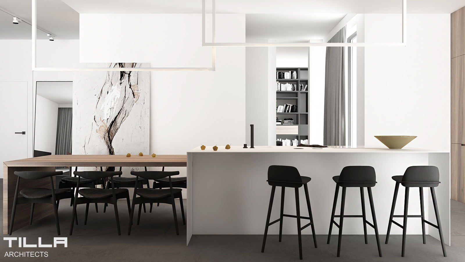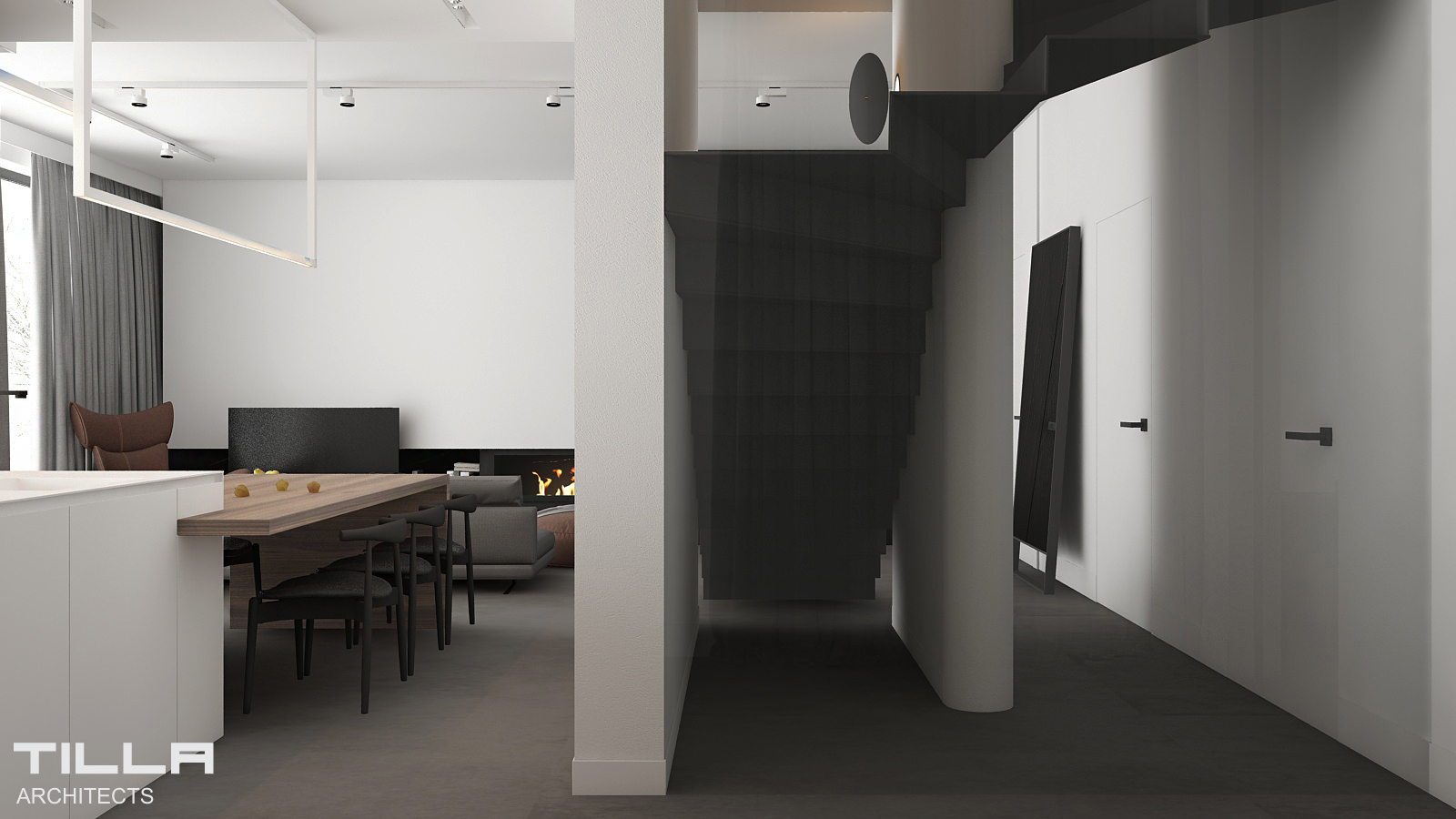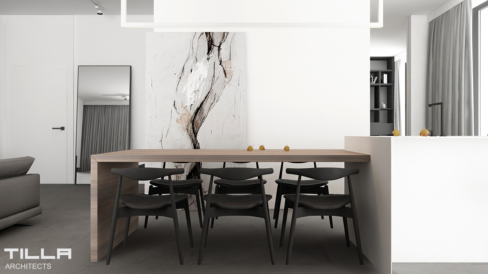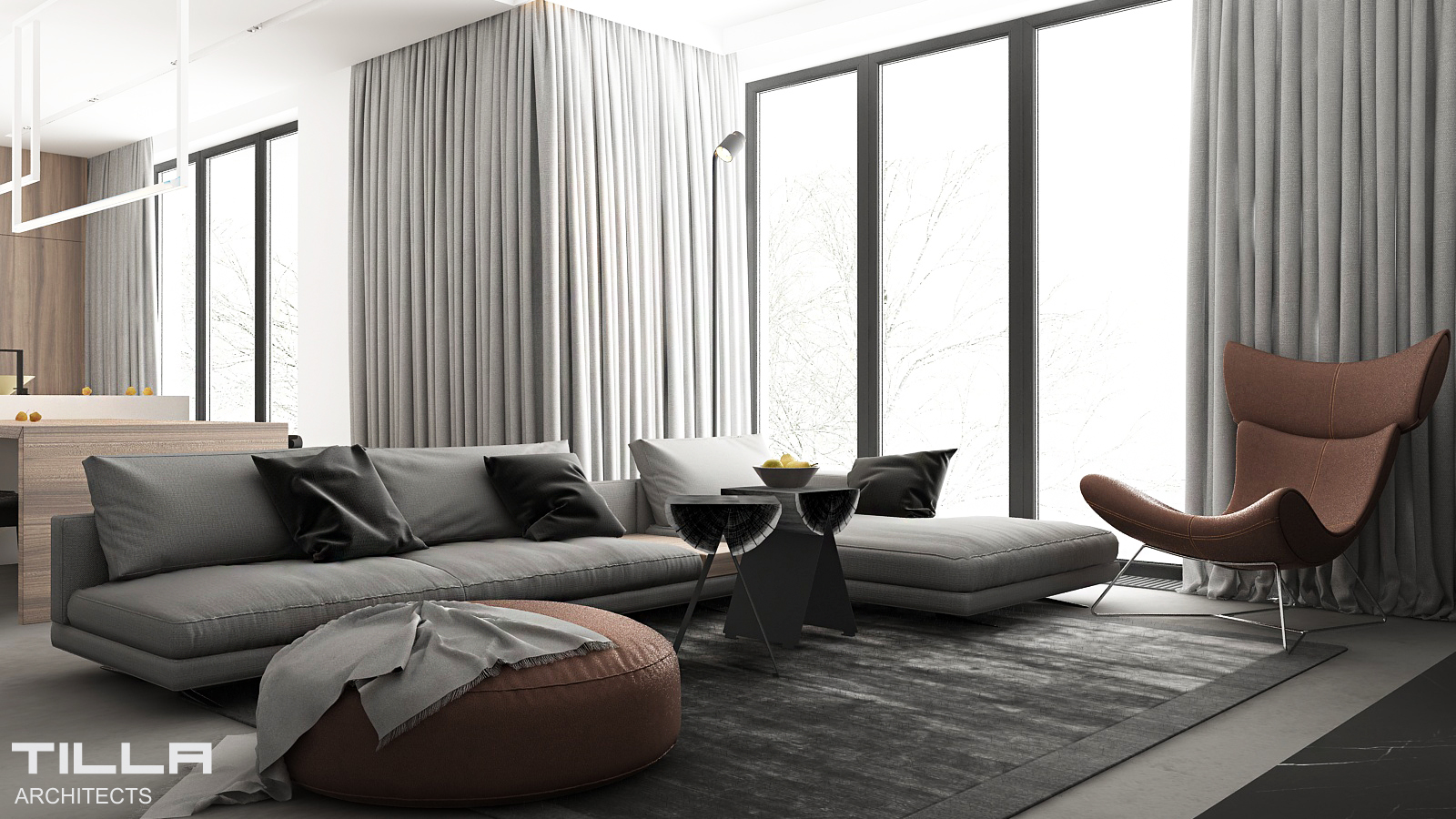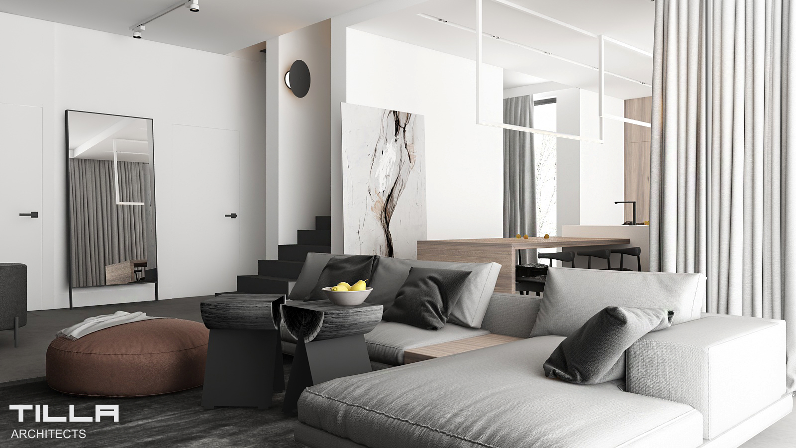 W tym domu króluje minimalizm, nowoczesne formy i prostota, której jednak nie brakuje wyrazistości. Strefa dzienna to otwarta przestrzeń, z kuchnią, jadalnianym stołem i salonem. W kąciku wypoczynkowym dominują szarości – ciemnoszary dywan z jasnymi przetarciami, szara kanapa i rude pufy tworzą przyjemną dla oka kompozycję. Wzrok przykuwają stylizowane stoliki kawowe z czarnego drewna o ciekawych kształtach. Kuchenna wyspa łączy się z jadalnianym stołem. Oba elementy mają proste formy i wzajemnie się uzupełniają. Pozostałą część kuchni tworzą zabudowy z drewnianymi frontami bez uchwytów.