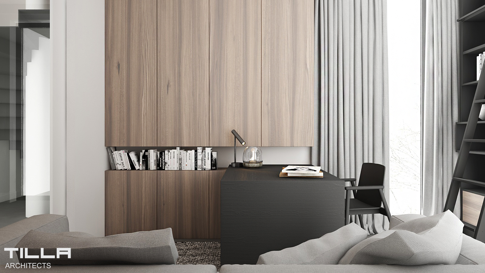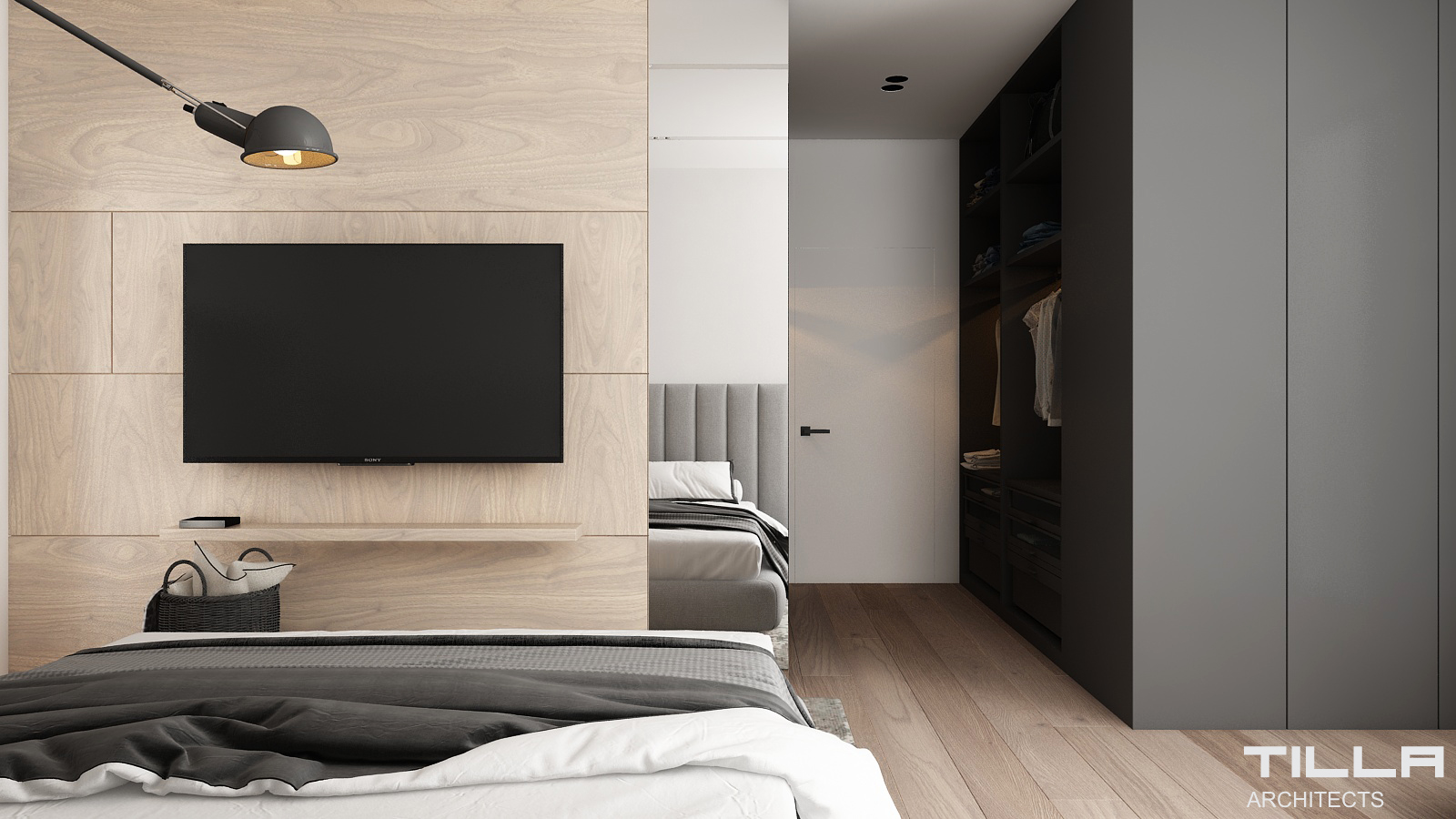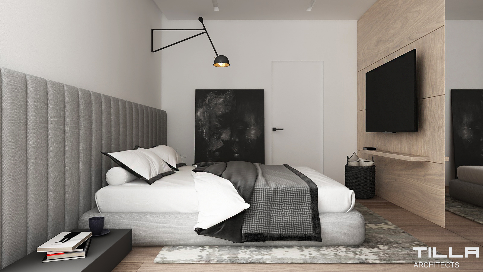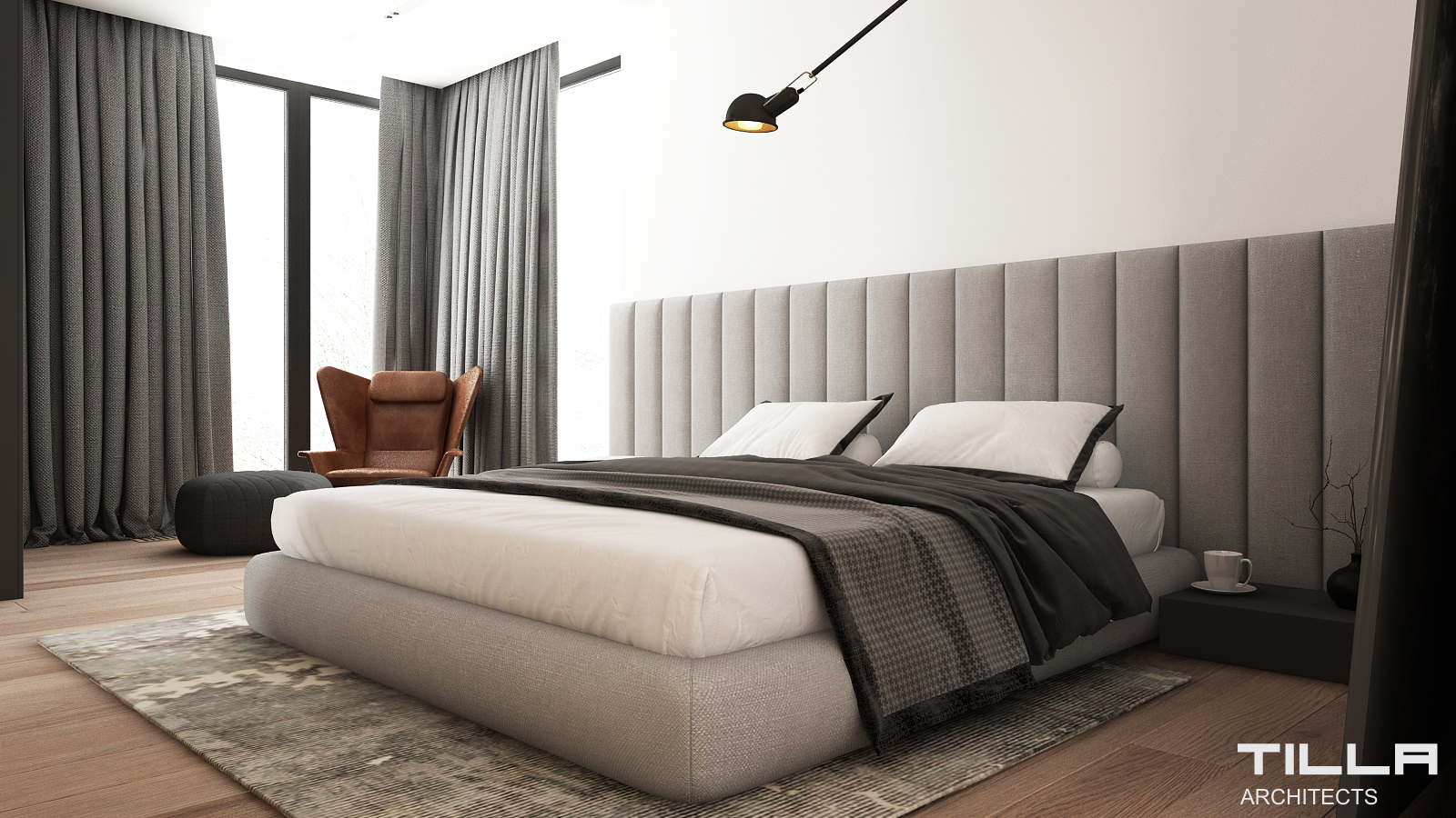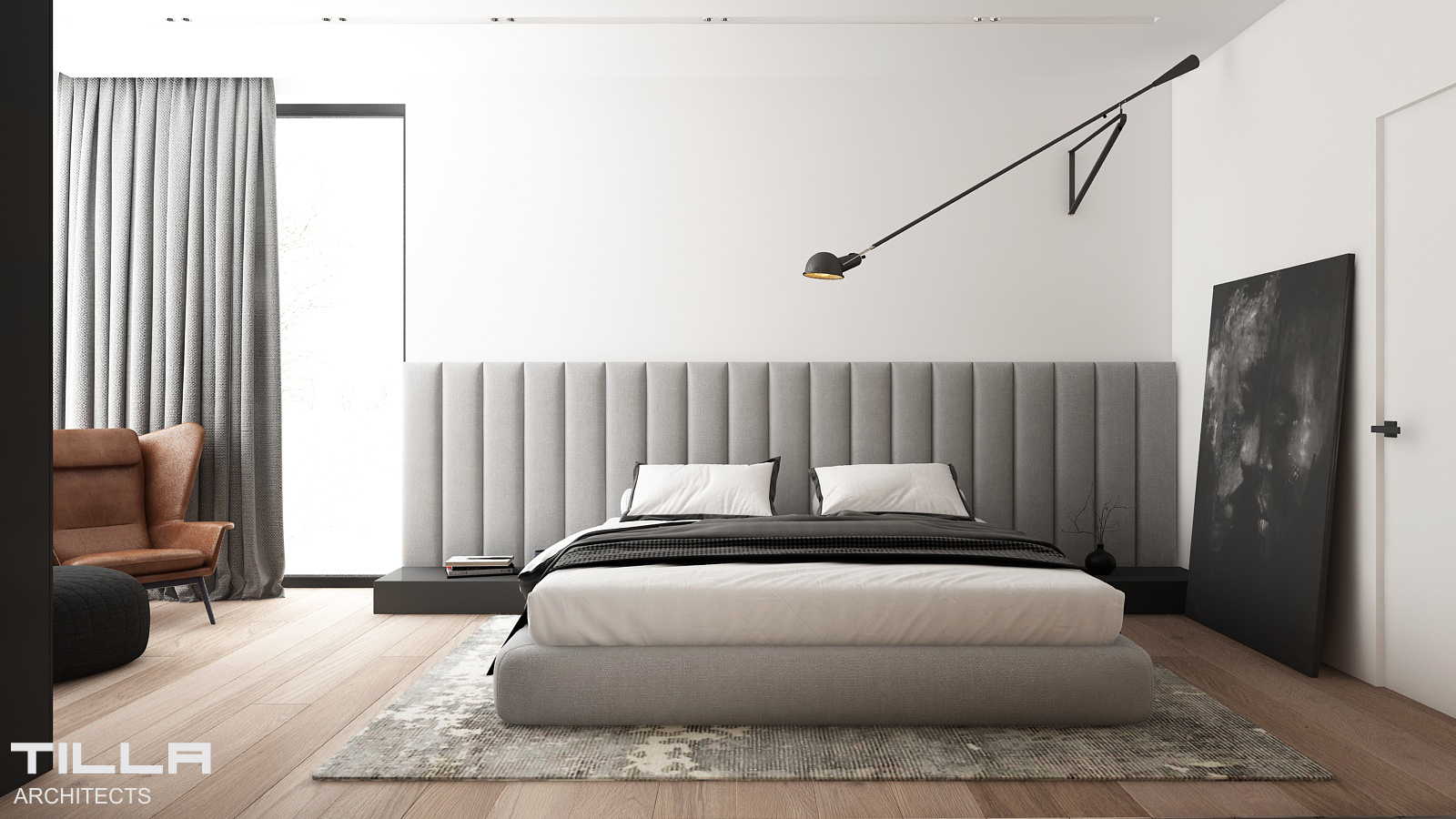 W sypialni dominuje biel, szarość i drewno. Za łóżkiem umieszczono tapicerowany zagłówek, na przeciwko – drewnianą ściankę z telewizorem. Charakteru dodaje skórzany fotel w rudym odcieniu oraz loftowe oświetlenie. Znalazła się tu także pojemna szafa, pełniąca funkcję garderoby. Gabinet jest utrzymany w podobnym stylu. Oprócz biurka i sofy, znalazły się tu zabudowy mieszczące obszerne zbiory książek Inwestorów. W domu znalazły się również dwie łazienki – z wolnostojącą wanną oraz prysznicem. Cała przestrzeń jest spójna, nowoczesna i harmonijna.