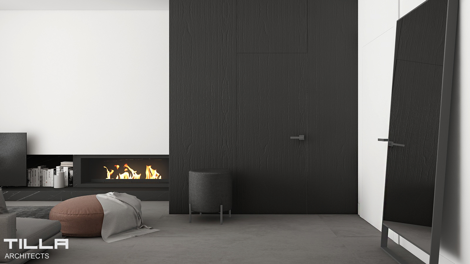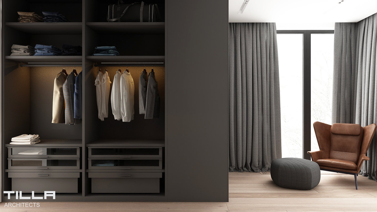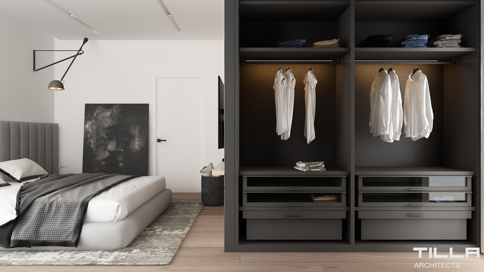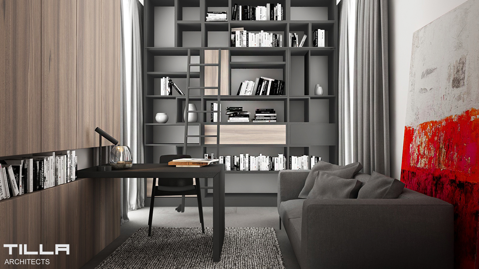 W sypialni dominuje biel, szarość i drewno. Za łóżkiem umieszczono tapicerowany zagłówek, na przeciwko – drewnianą ściankę z telewizorem. Charakteru dodaje skórzany fotel w rudym odcieniu oraz loftowe oświetlenie. Znalazła się tu także pojemna szafa, pełniąca funkcję garderoby. Gabinet jest utrzymany w podobnym stylu. Oprócz biurka i sofy, znalazły się tu zabudowy mieszczące obszerne zbiory książek Inwestorów. W domu znalazły się również dwie łazienki – z wolnostojącą wanną oraz prysznicem. Cała przestrzeń jest spójna, nowoczesna i harmonijna.