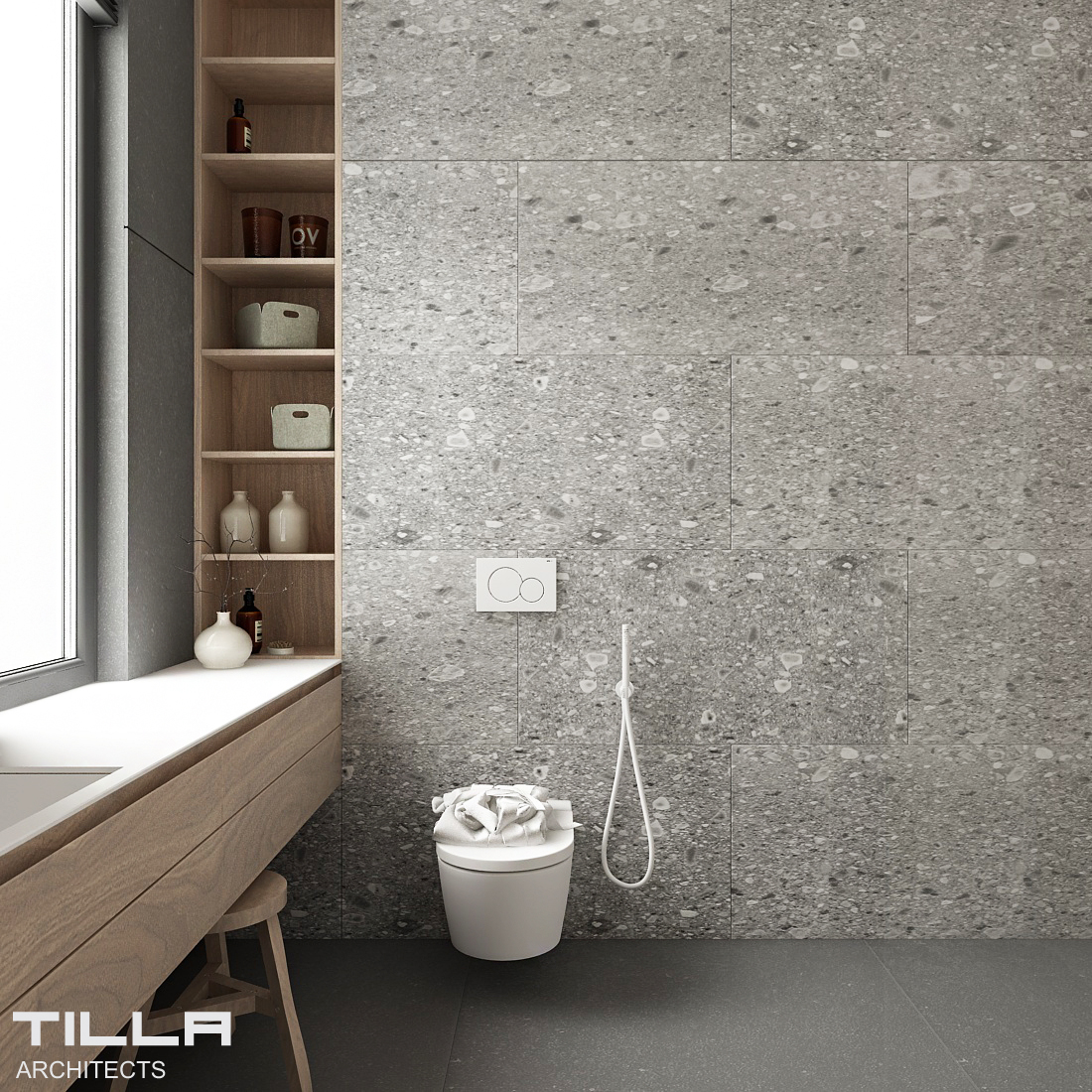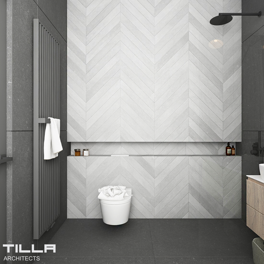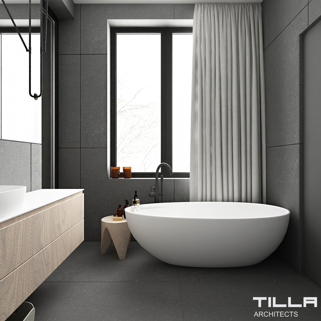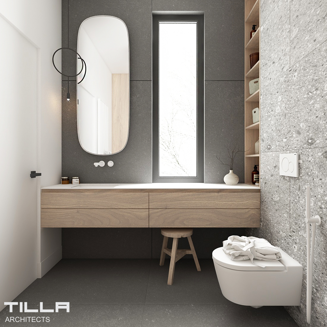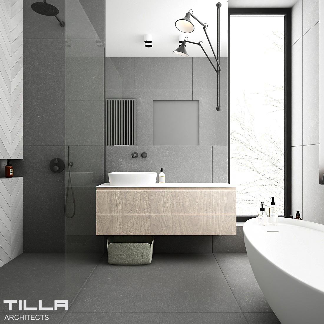W sypialni dominuje biel, szarość i drewno. Za łóżkiem umieszczono tapicerowany zagłówek, na przeciwko – drewnianą ściankę z telewizorem. Charakteru dodaje skórzany fotel w rudym odcieniu oraz loftowe oświetlenie. Znalazła się tu także pojemna szafa, pełniąca funkcję garderoby. Gabinet jest utrzymany w podobnym stylu. Oprócz biurka i sofy, znalazły się tu zabudowy mieszczące obszerne zbiory książek Inwestorów. W domu znalazły się również dwie łazienki – z wolnostojącą wanną oraz prysznicem. Cała przestrzeń jest spójna, nowoczesna i harmonijna.
