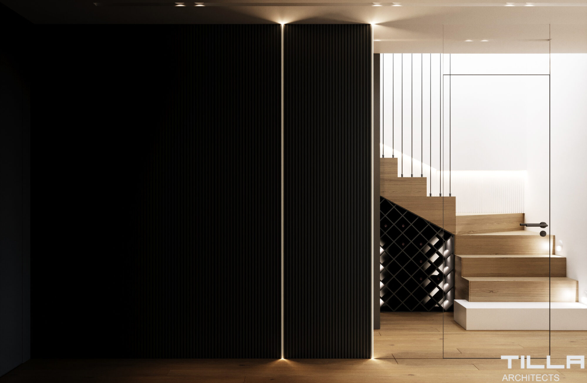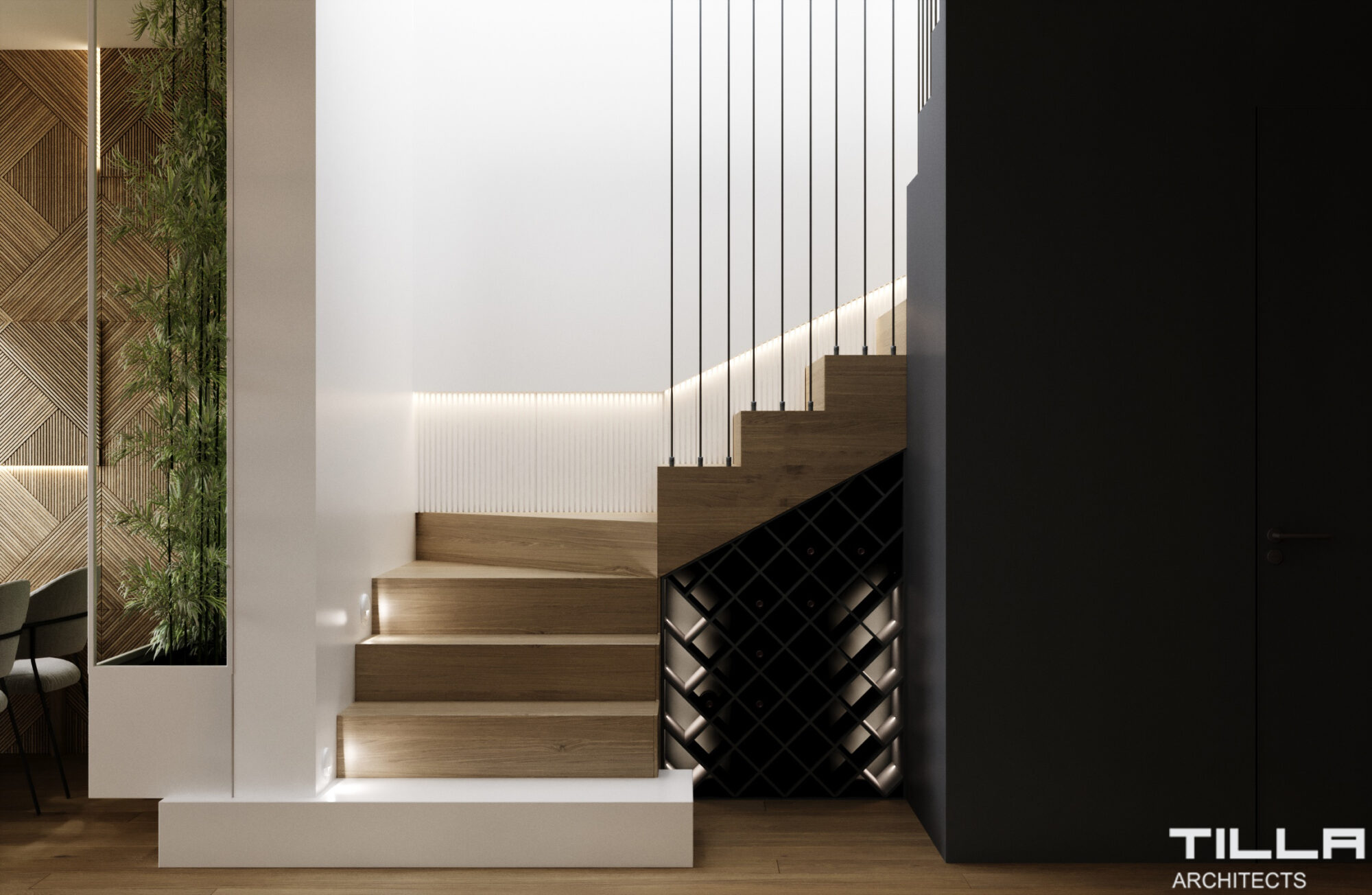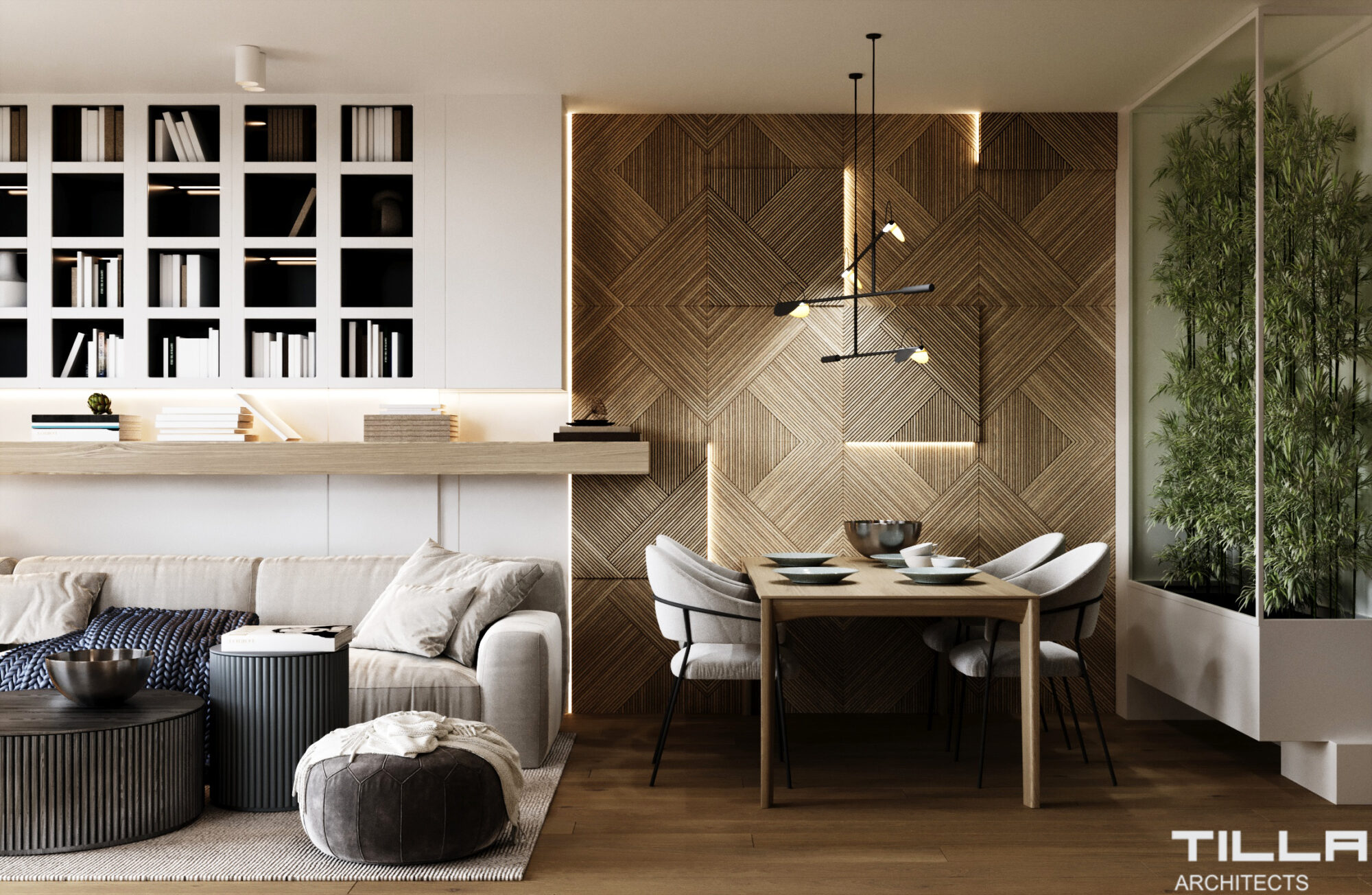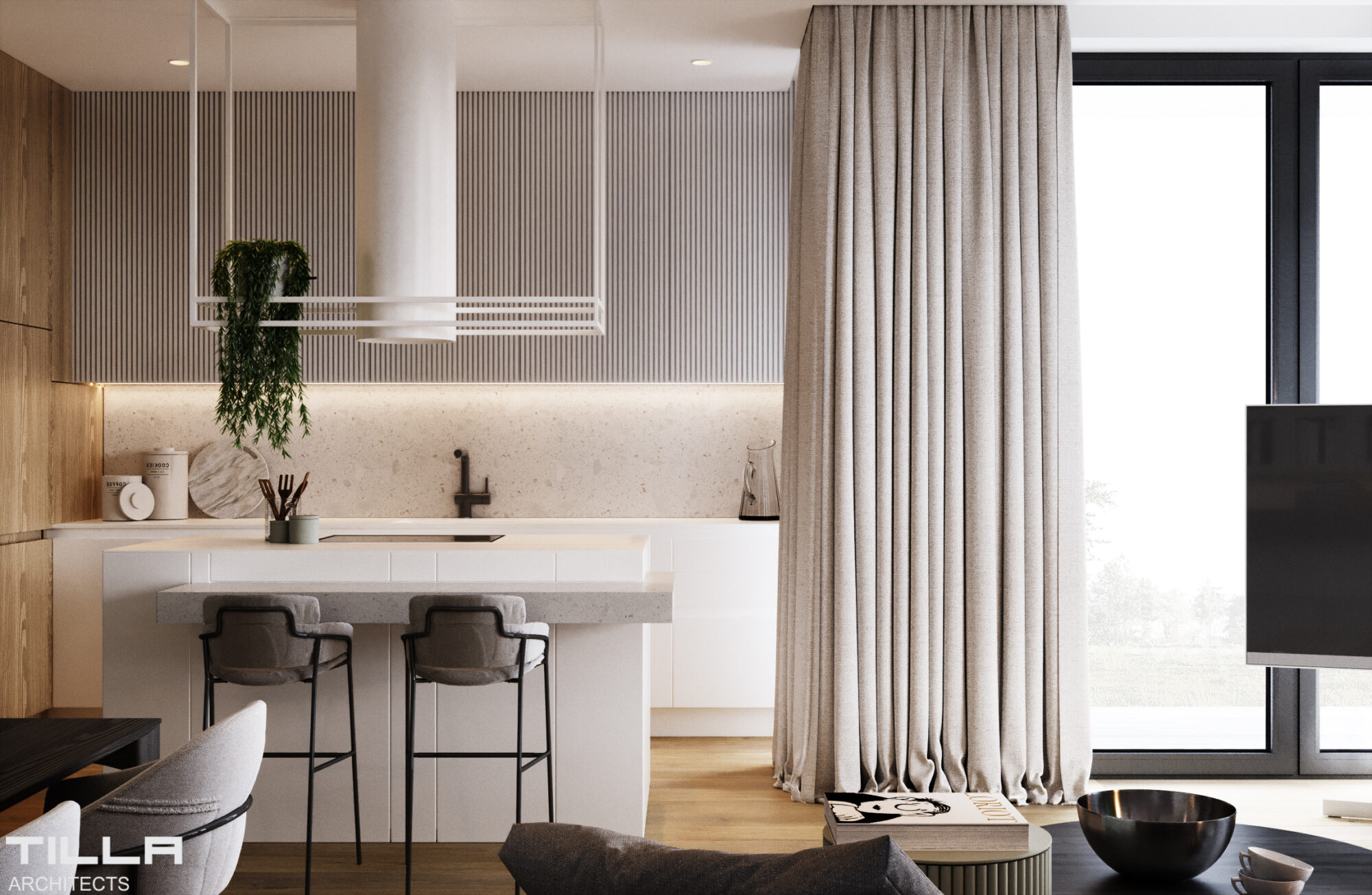 Dom w Poznaniu to nowoczesna i pełna przytulności przestrzeń, w której króluje drewno, harmonijne barwy i dopracowane oświetlenie. W strefie dziennej w roli dekoracji występuje natura. Drewniane dekoracyjne panele, lamele oraz wyeksponowana roślina w specjalnej donicy na postumencie z ramą. Za kanapą znalazło się miejsce na zabudowę – tak powstało miejsce na książki i detale. W kuchni dominuje biel i drewno – jest nowoczesna i utrzymana w duchu współczesnej prostoty.