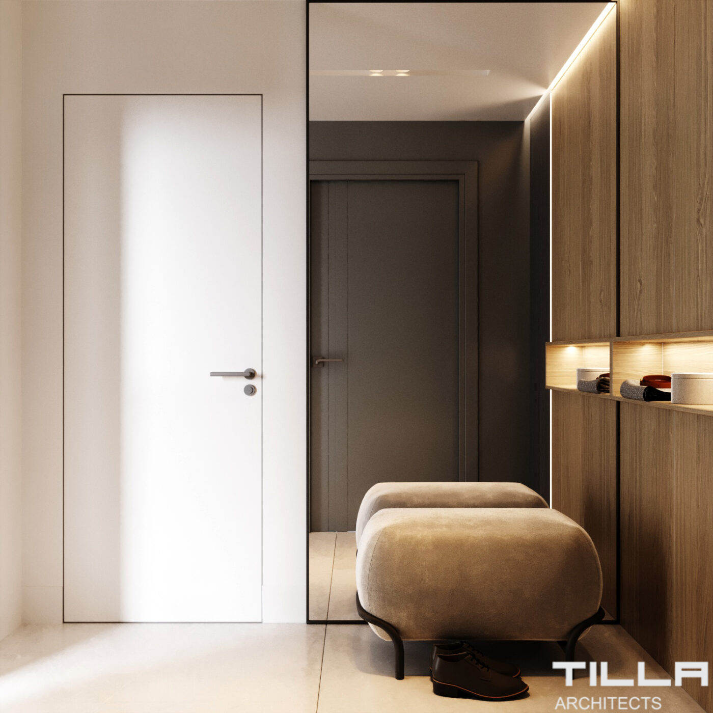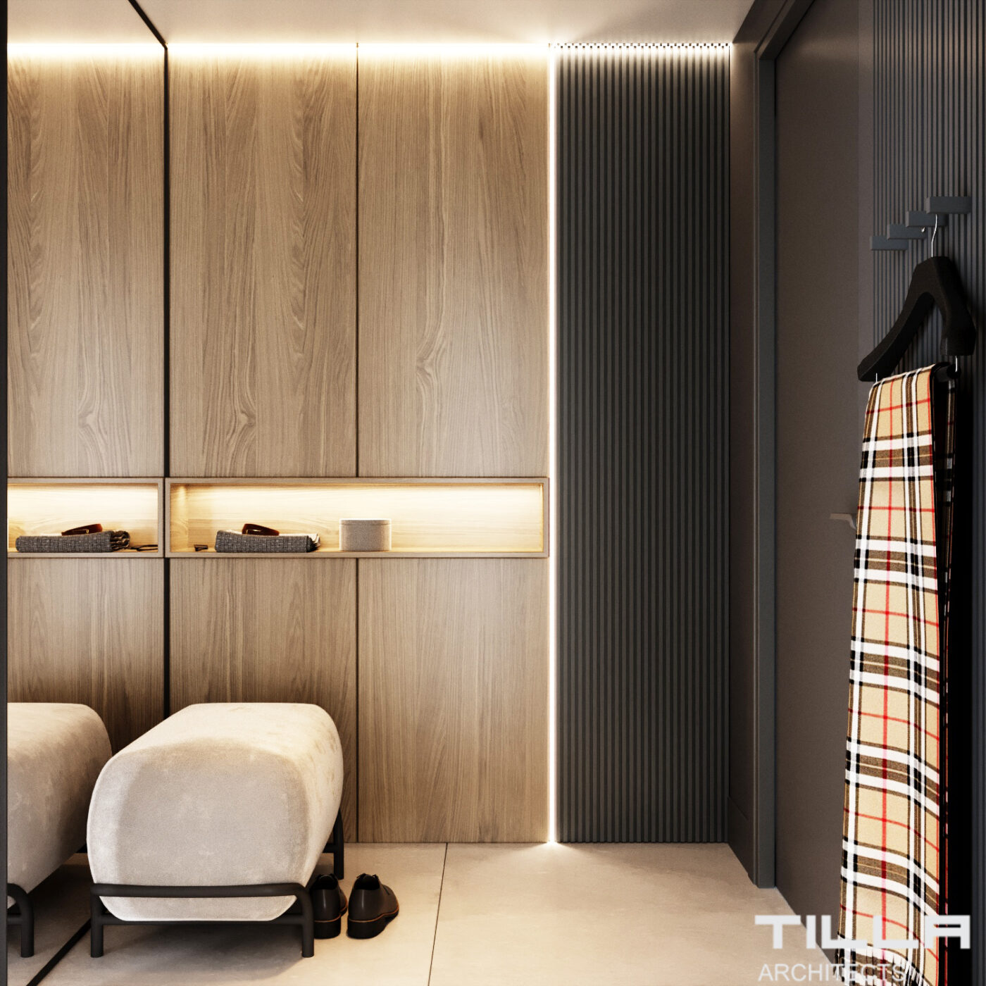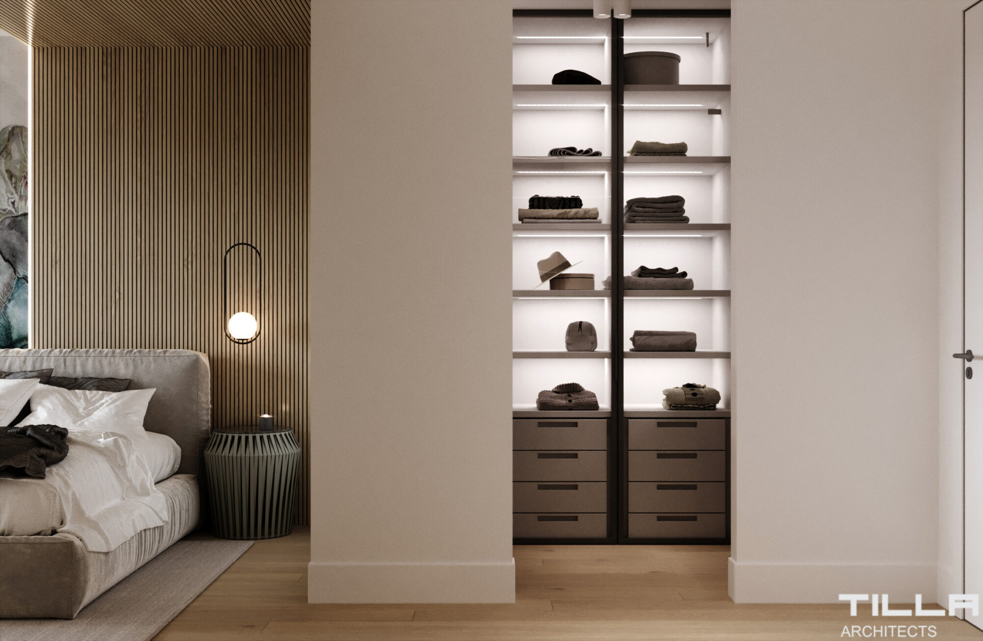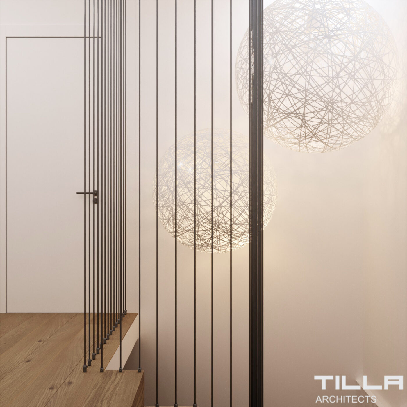 Dom w Poznaniu to nowoczesna i pełna przytulności przestrzeń, w której króluje drewno, harmonijne barwy i dopracowane oświetlenie. W strefie dziennej w roli dekoracji występuje natura. Drewniane dekoracyjne panele, lamele oraz wyeksponowana roślina w specjalnej donicy na postumencie z ramą. Za kanapą znalazło się miejsce na zabudowę – tak powstało miejsce na książki i detale. W kuchni dominuje biel i drewno – jest nowoczesna i utrzymana w duchu współczesnej prostoty.