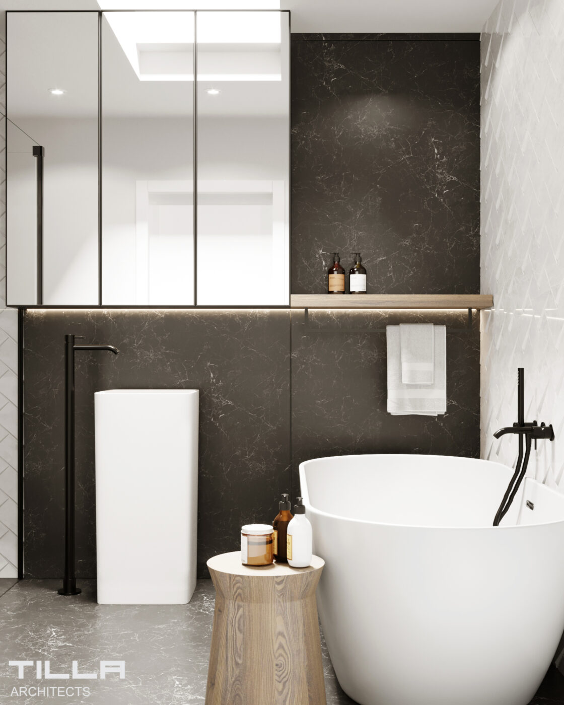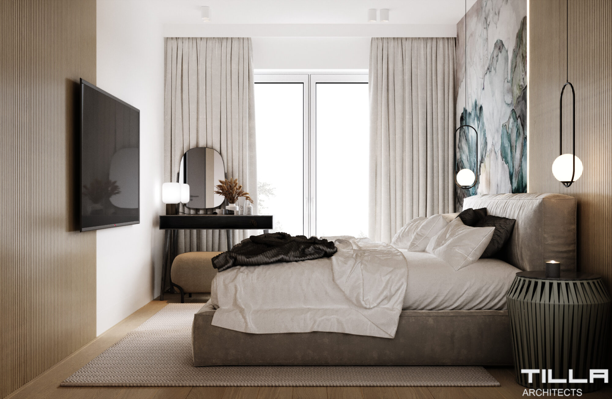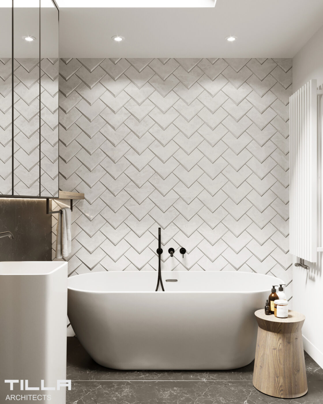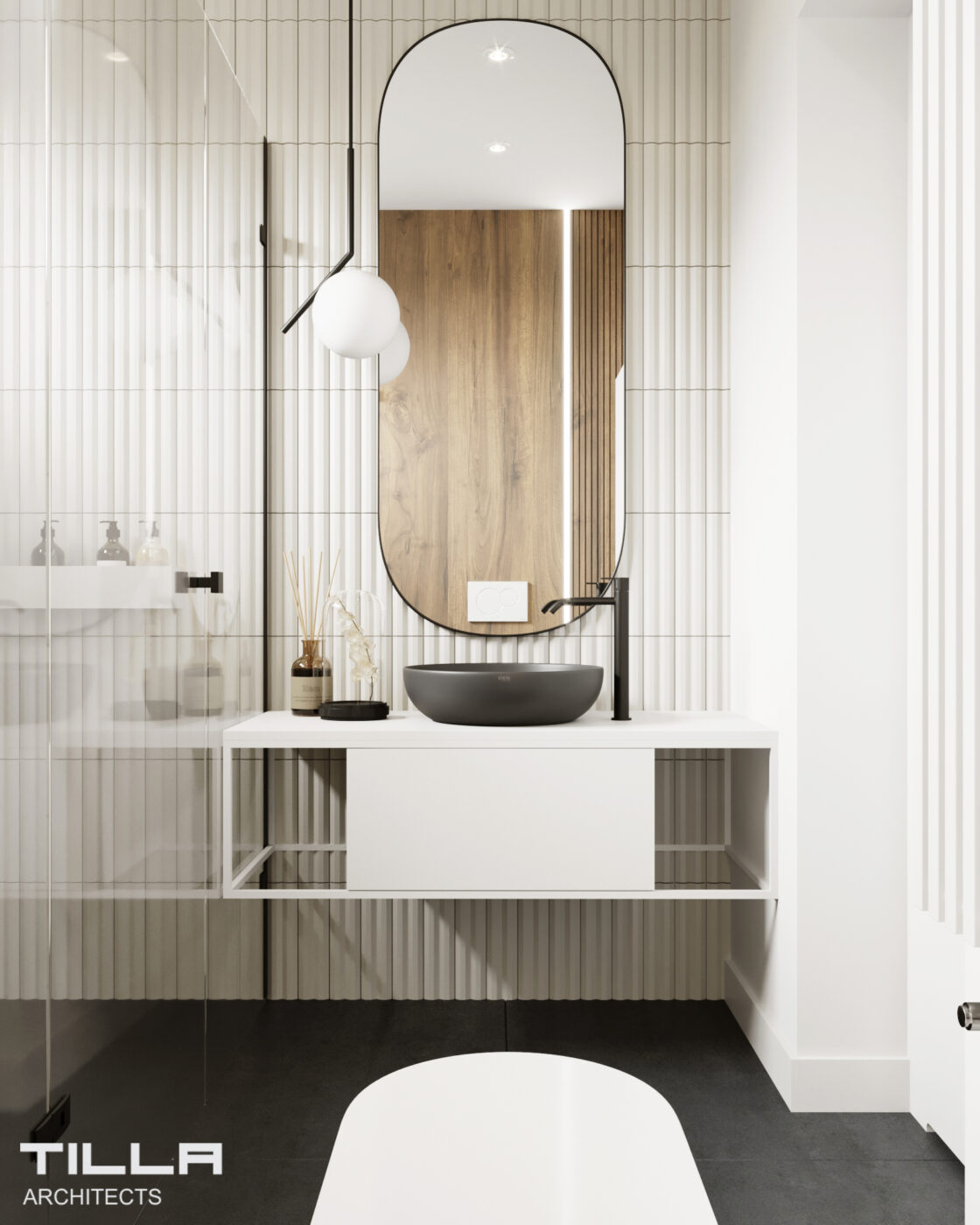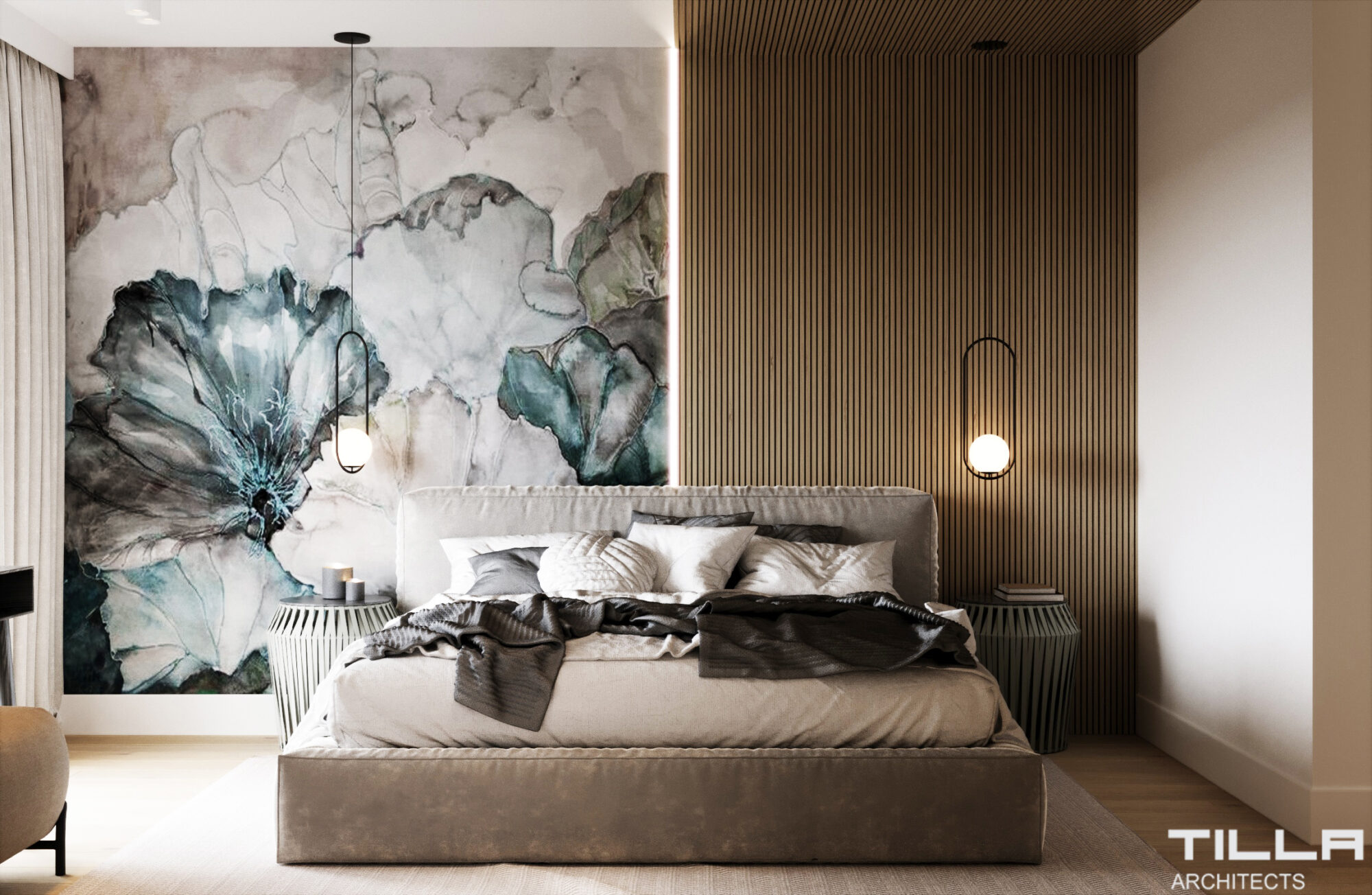 Łazienka z wolnostojącą wanną to eleganckie połączenie bieli i czerni. Ścianę za wanną zdobią płytki tworzące fantazyjny geometryczny wzór. Z kolei ściana za umywalką została pokryta ciemnymi płytkami o delikatnych przeżyleniach. Sypialnia to wnętrze pełne rozmachu i elegancji. W roli dekoracji pojawiają się tu drewniane lamele oraz efektowny motyw przeskalowanych kwiatów. W domu znalazła się też garderoba. Całość jest harmonijna, nowoczesna i funkcjonalna.