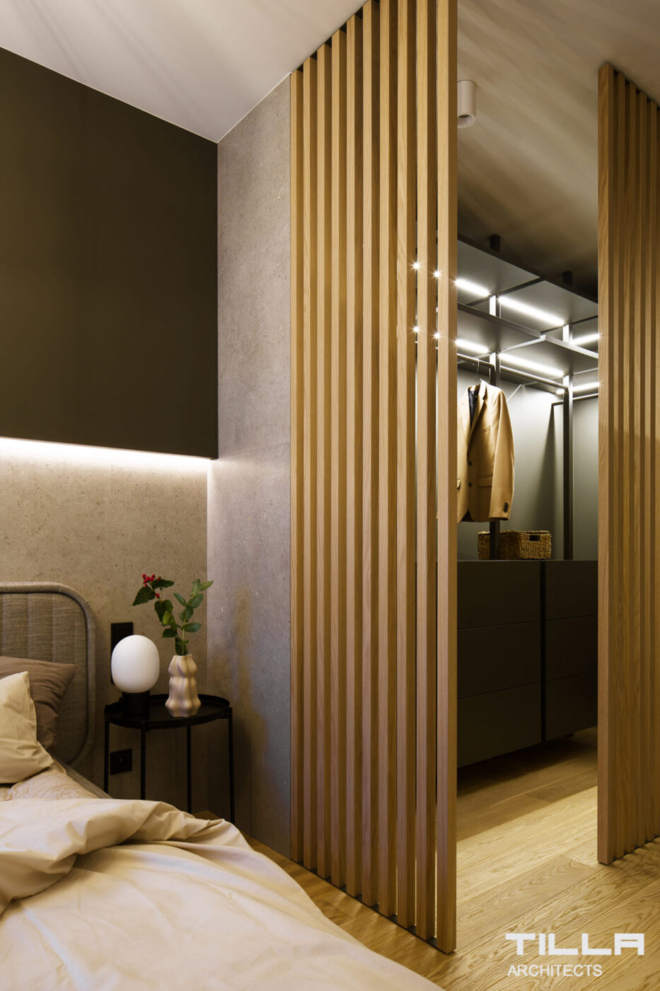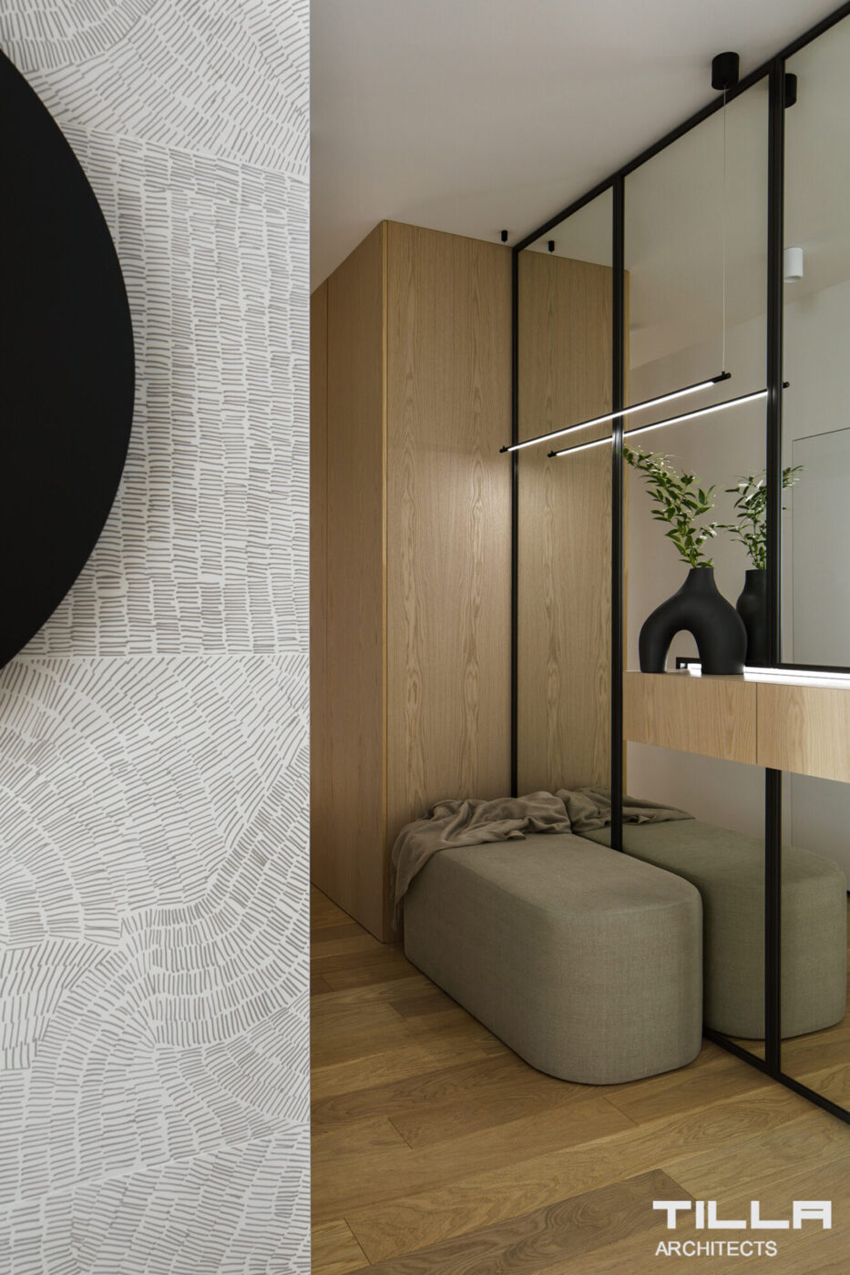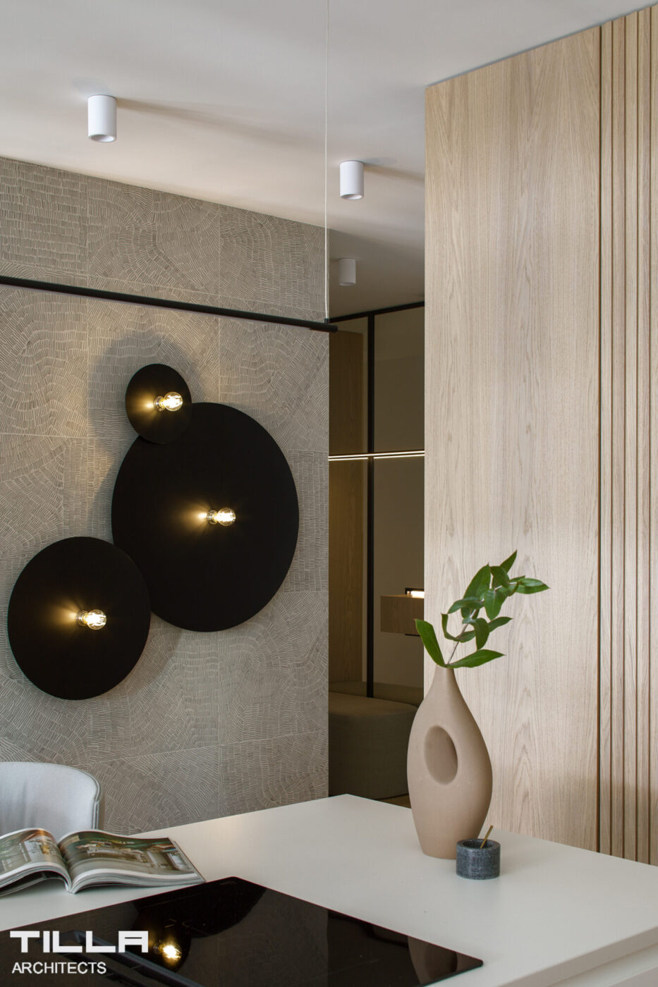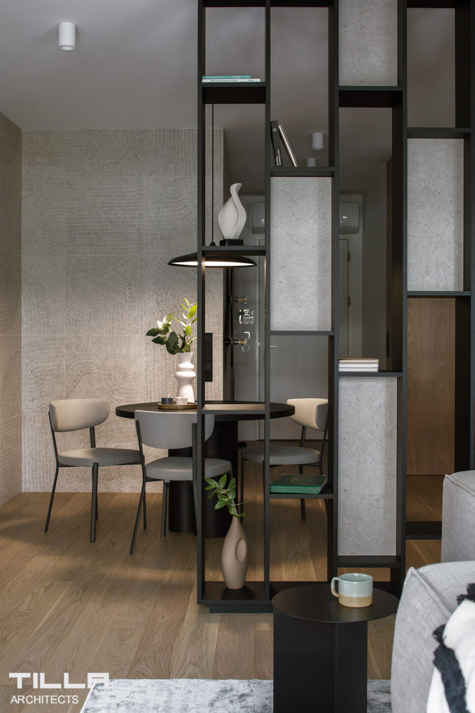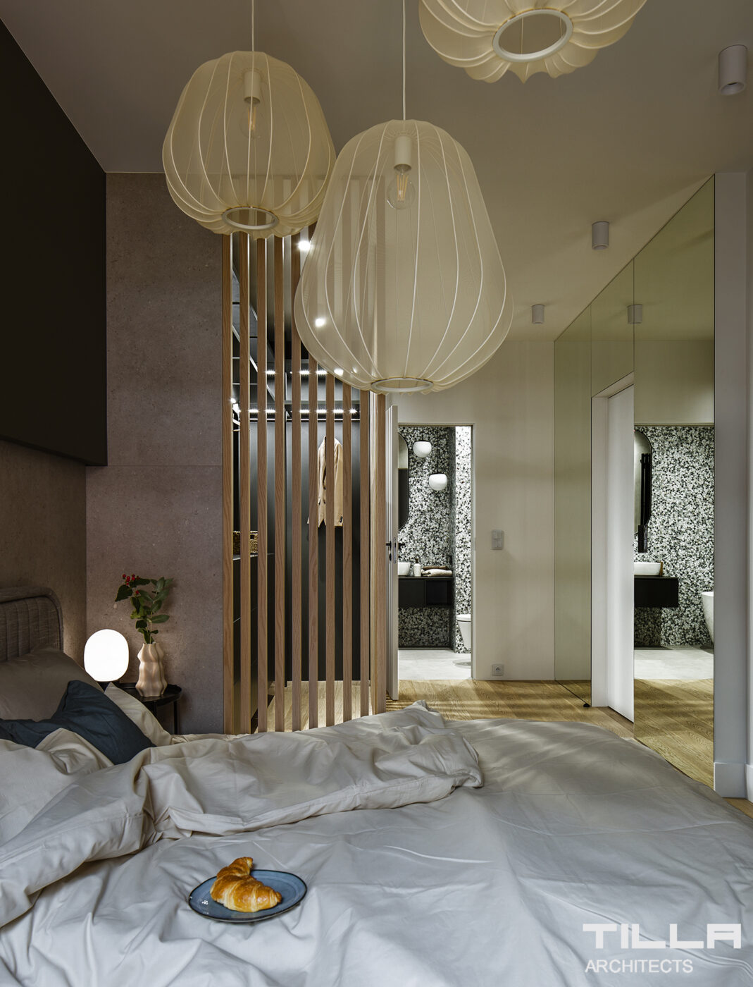 Harmonijne połączenie szarości, czerni, drewna i bieli tworzy spokojny kolorystyczny rytm tego miejsca. Prostota form i barw tworzy wdzięczne tło dla wyrafinowanych dekoracyjnych detali – stylizowanego oświetlenia, ażurowych ścianek z lameli i ceramiki. Na apartament składają się salon wraz z kuchnią, łazienka z prysznicem, łazienka z wolnostojącą wanną, sypialnia oraz loggia. Całość jest intrygująca, przytulna i pełna charakteru.