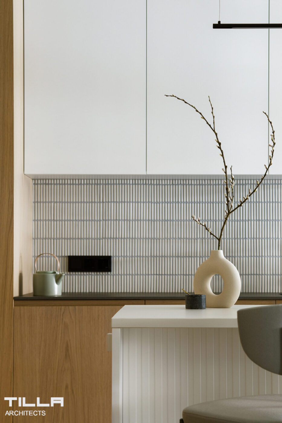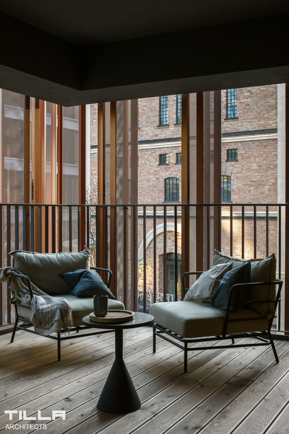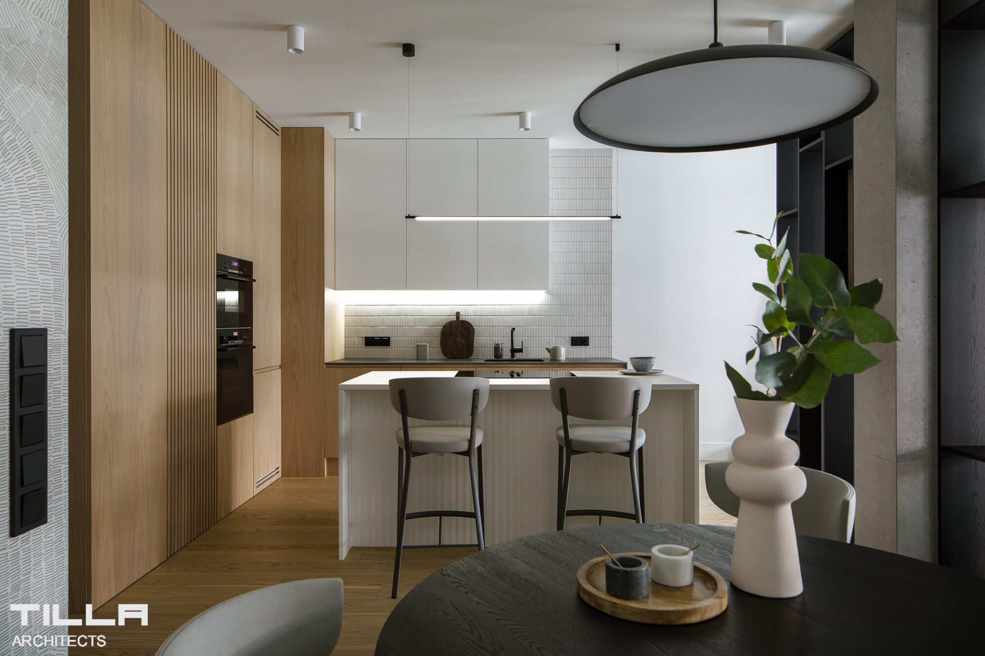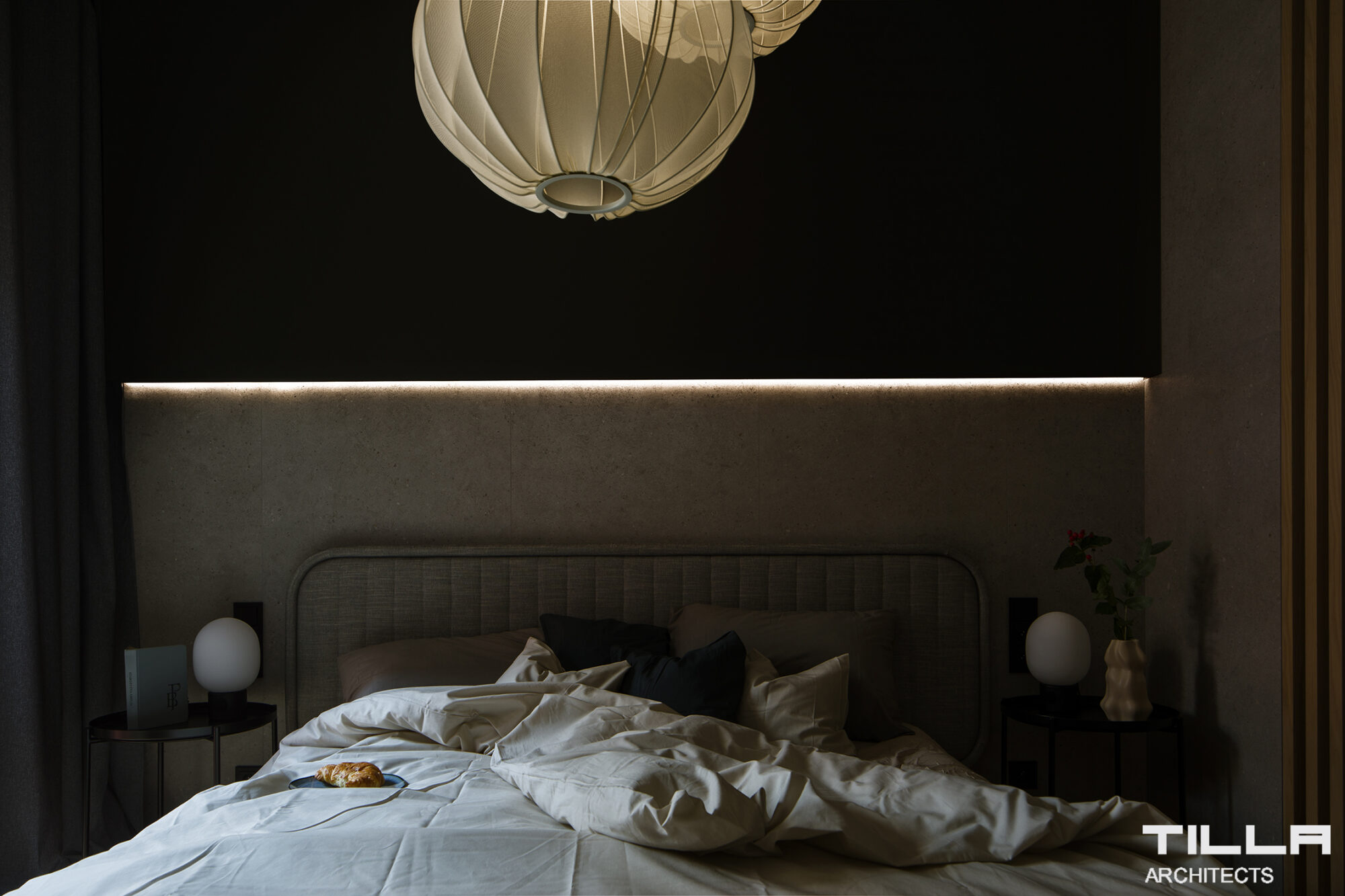 Harmonijne połączenie szarości, czerni, drewna i bieli tworzy spokojny kolorystyczny rytm tego miejsca. Prostota form i barw tworzy wdzięczne tło dla wyrafinowanych dekoracyjnych detali – stylizowanego oświetlenia, ażurowych ścianek z lameli i ceramiki. Na apartament składają się salon wraz z kuchnią, łazienka z prysznicem, łazienka z wolnostojącą wanną, sypialnia oraz loggia. Całość jest intrygująca, przytulna i pełna charakteru.