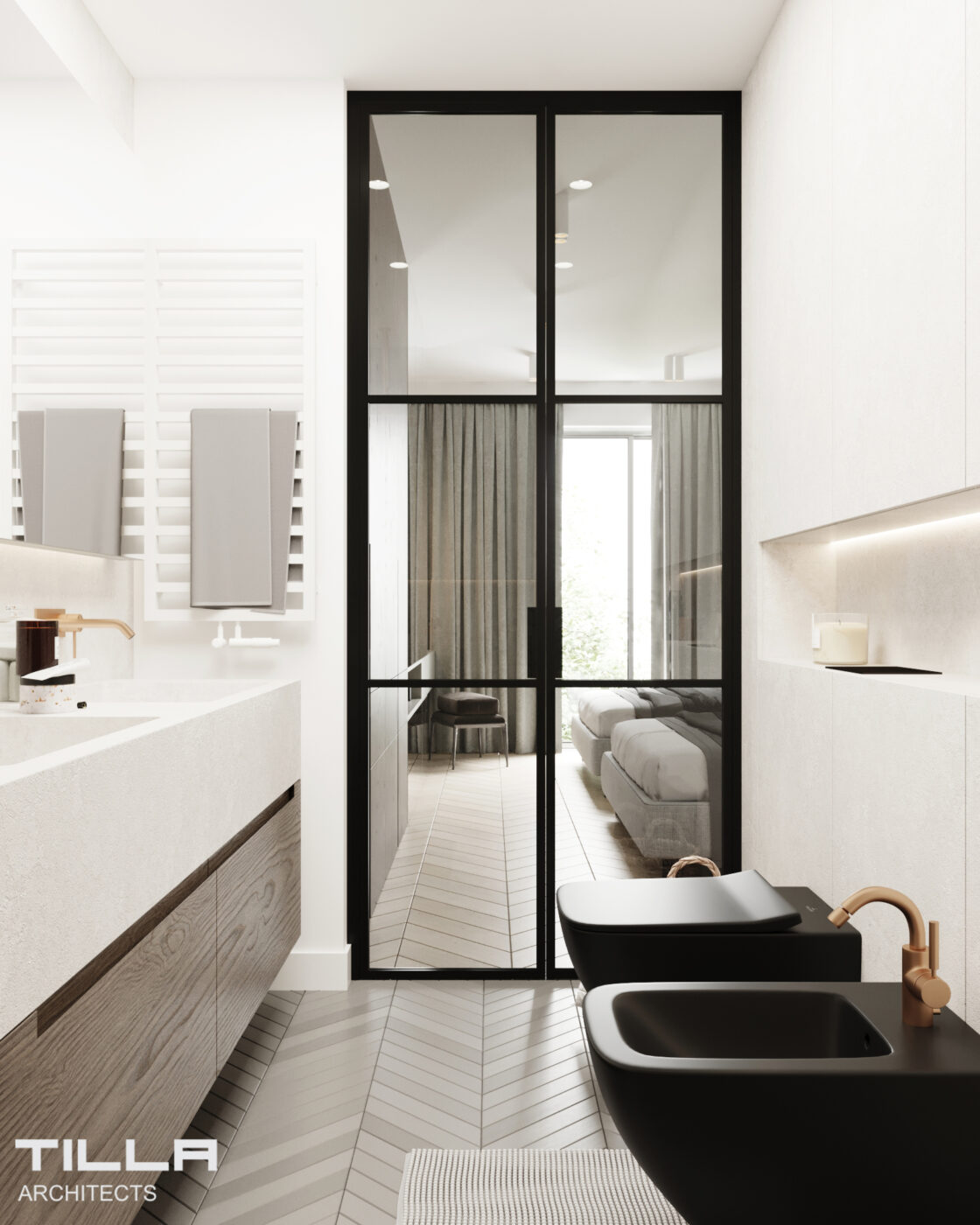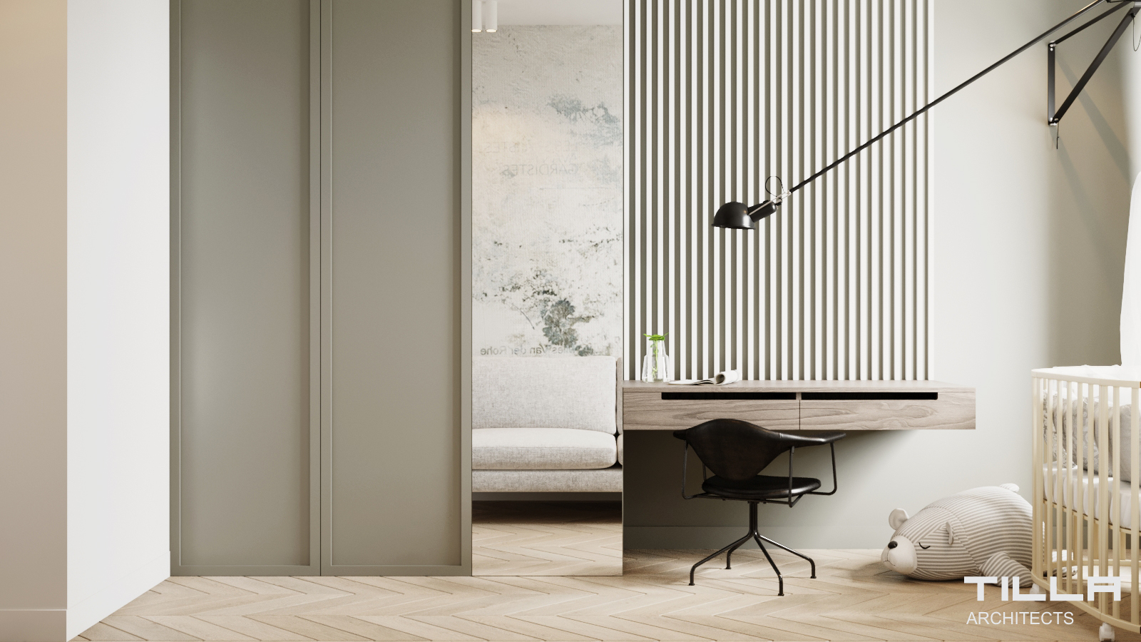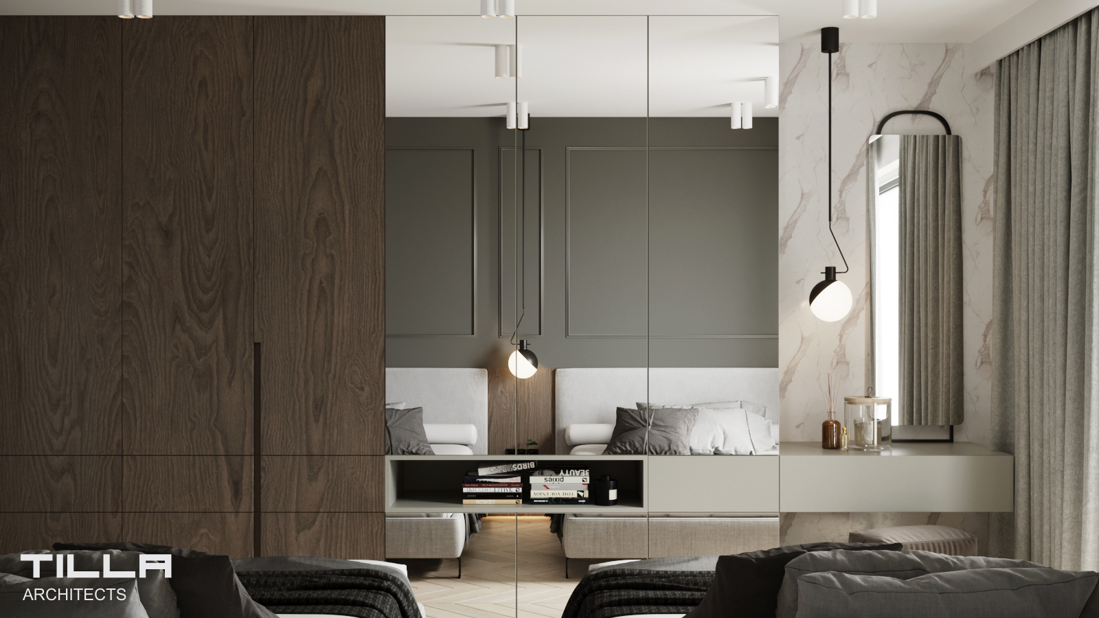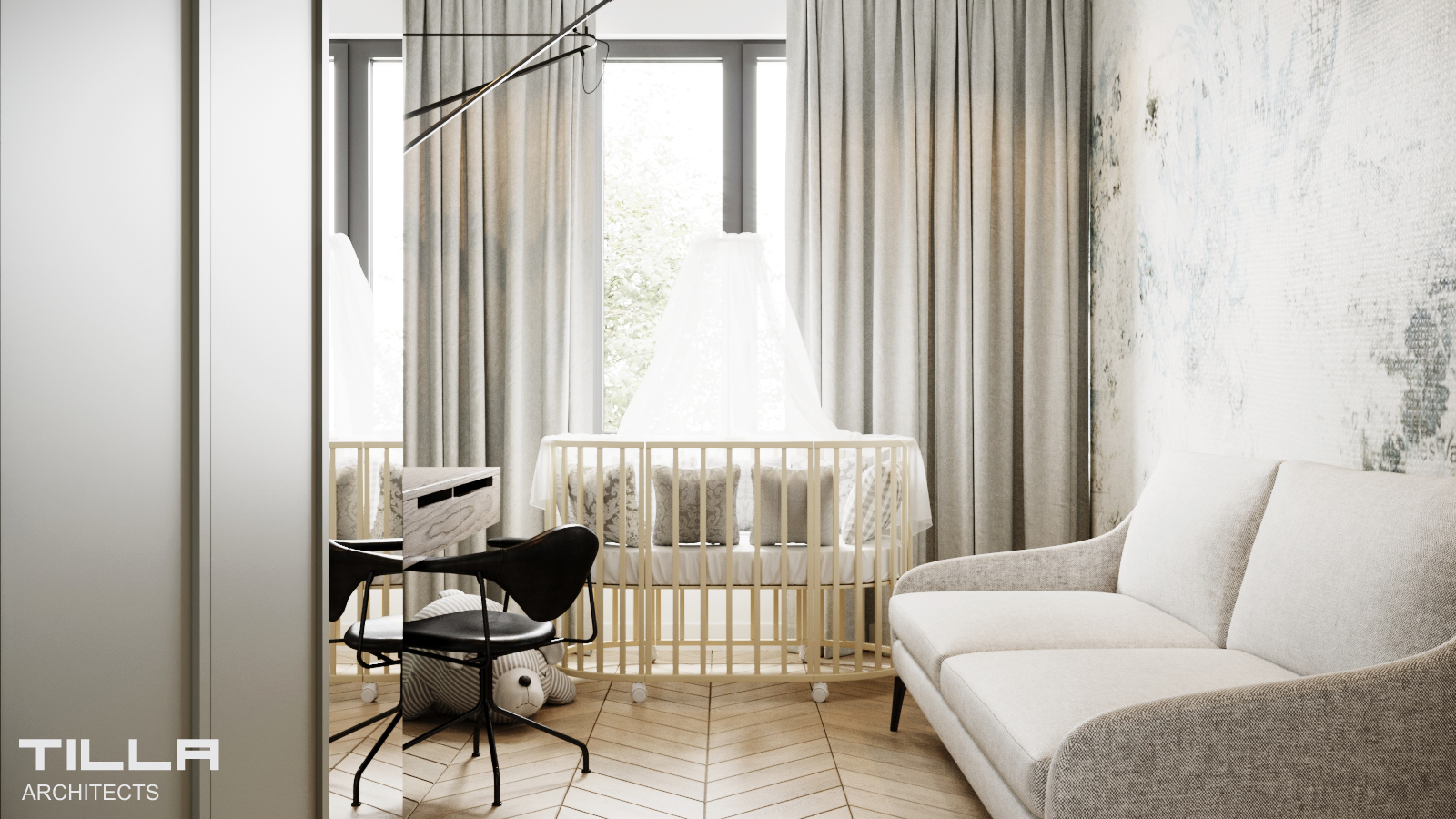 Ściana za łóżkami w sypialni została pomalowana na przyjemny odcień szarości. Wiszące lampy o kulistych kloszach stanowią dekoracyjny akcent, kontrastujący z klasyczną sztukaterią. Naprzeciwko łóżek powstała zabudowa z drewnianymi i lustrzanymi frontami, które tworzą harmonijne połączenie i powiększają optycznie wnętrze. Tuż obok zaaranżowano toaletkę. Za przeszklonymi drzwiami znalazła się łazienka. Jej ozdobą są płytki z wzorem terazzo oraz dekoracyjne płytki ułożone w jodełkę. Pokój dziecięcy jest utrzymany w neutralnych, jasnych kolorach. Znalazła się tu zabudowa, biurko, kanapa oraz łóżeczko z baldachimem. Apartament jest funkcjonalny i pełen przemyślanych połączeń. Odważny styk struktur, materiałów i kolorów to wizytówka tej przestrzeni.