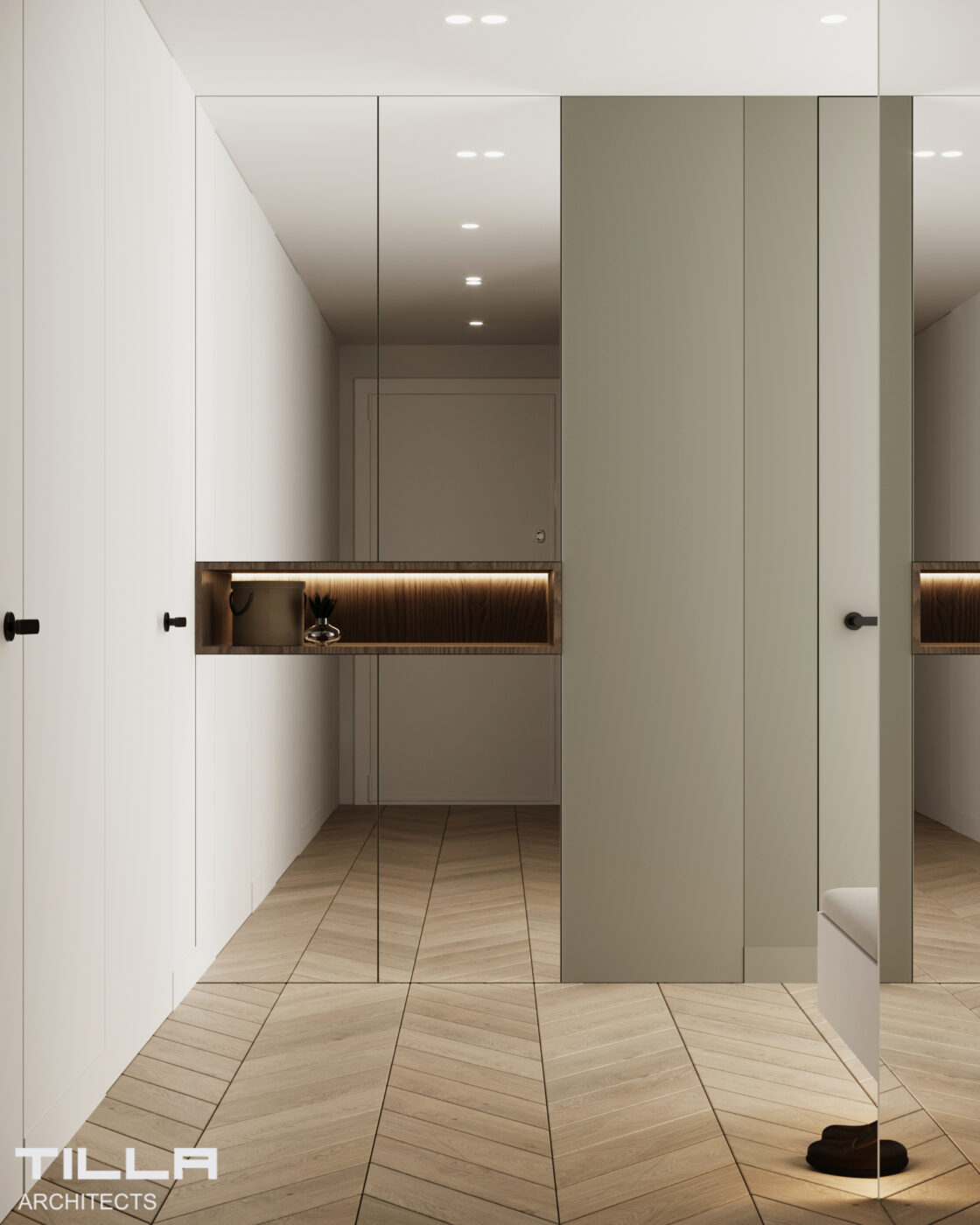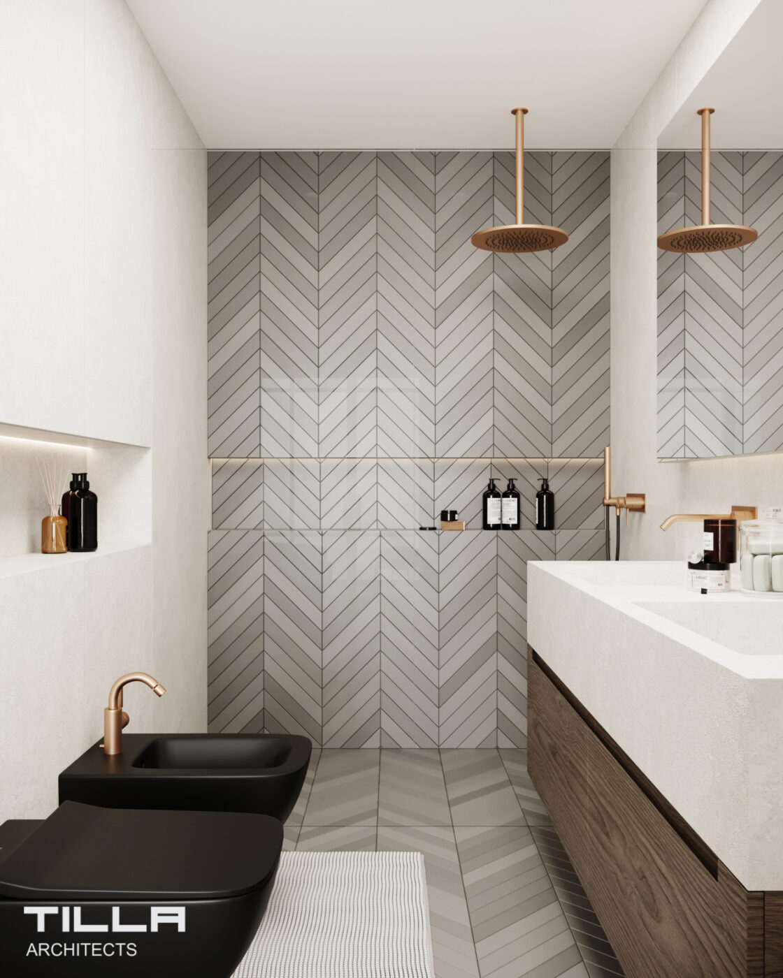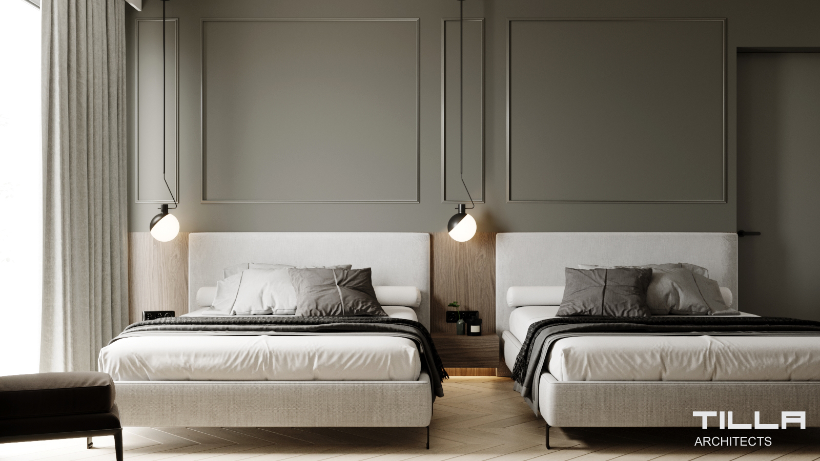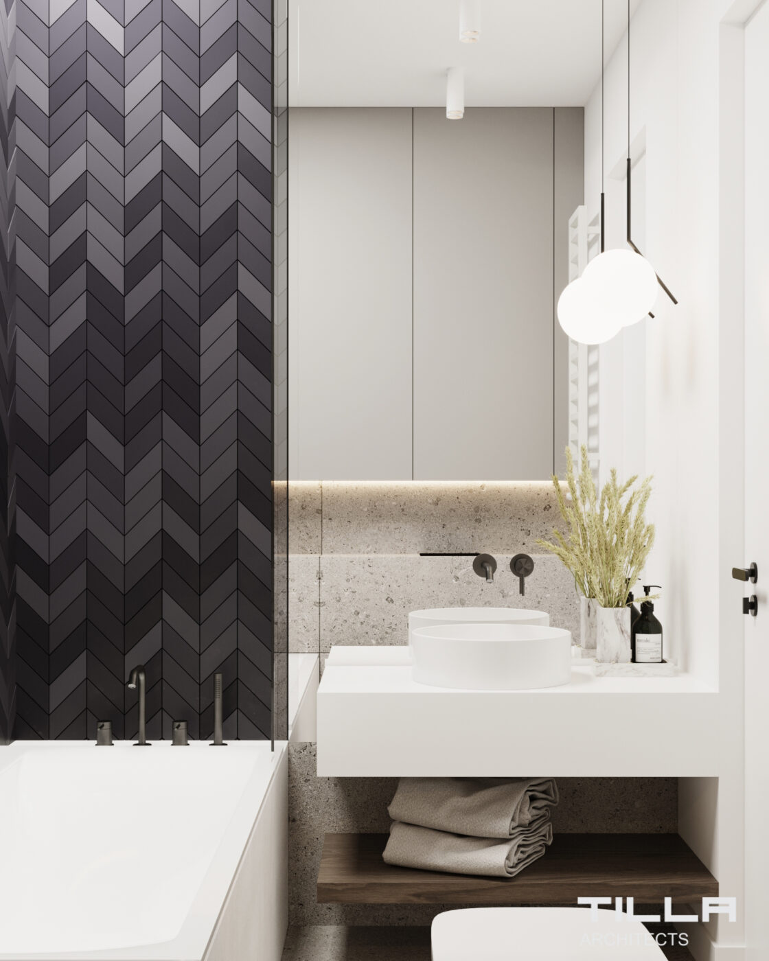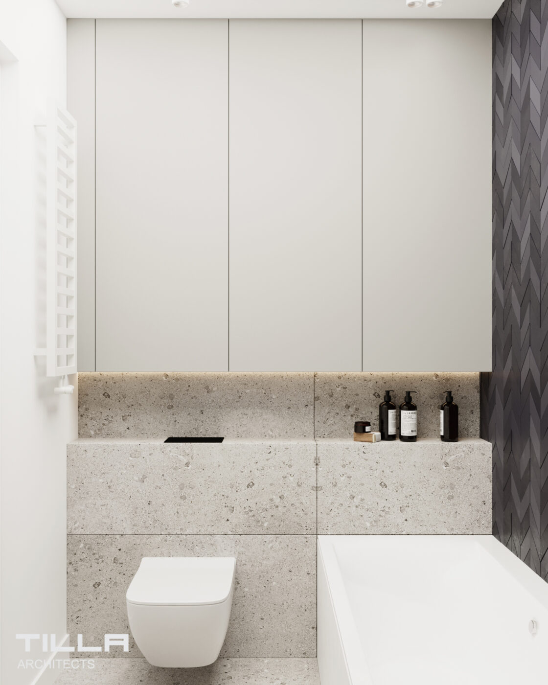 Ściana za łóżkami w sypialni została pomalowana na przyjemny odcień szarości. Wiszące lampy o kulistych kloszach stanowią dekoracyjny akcent, kontrastujący z klasyczną sztukaterią. Naprzeciwko łóżek powstała zabudowa z drewnianymi i lustrzanymi frontami, które tworzą harmonijne połączenie i powiększają optycznie wnętrze. Tuż obok zaaranżowano toaletkę. Za przeszklonymi drzwiami znalazła się łazienka. Jej ozdobą są płytki z wzorem terazzo oraz dekoracyjne płytki ułożone w jodełkę. Pokój dziecięcy jest utrzymany w neutralnych, jasnych kolorach. Znalazła się tu zabudowa, biurko, kanapa oraz łóżeczko z baldachimem. Apartament jest funkcjonalny i pełen przemyślanych połączeń. Odważny styk struktur, materiałów i kolorów to wizytówka tej przestrzeni.