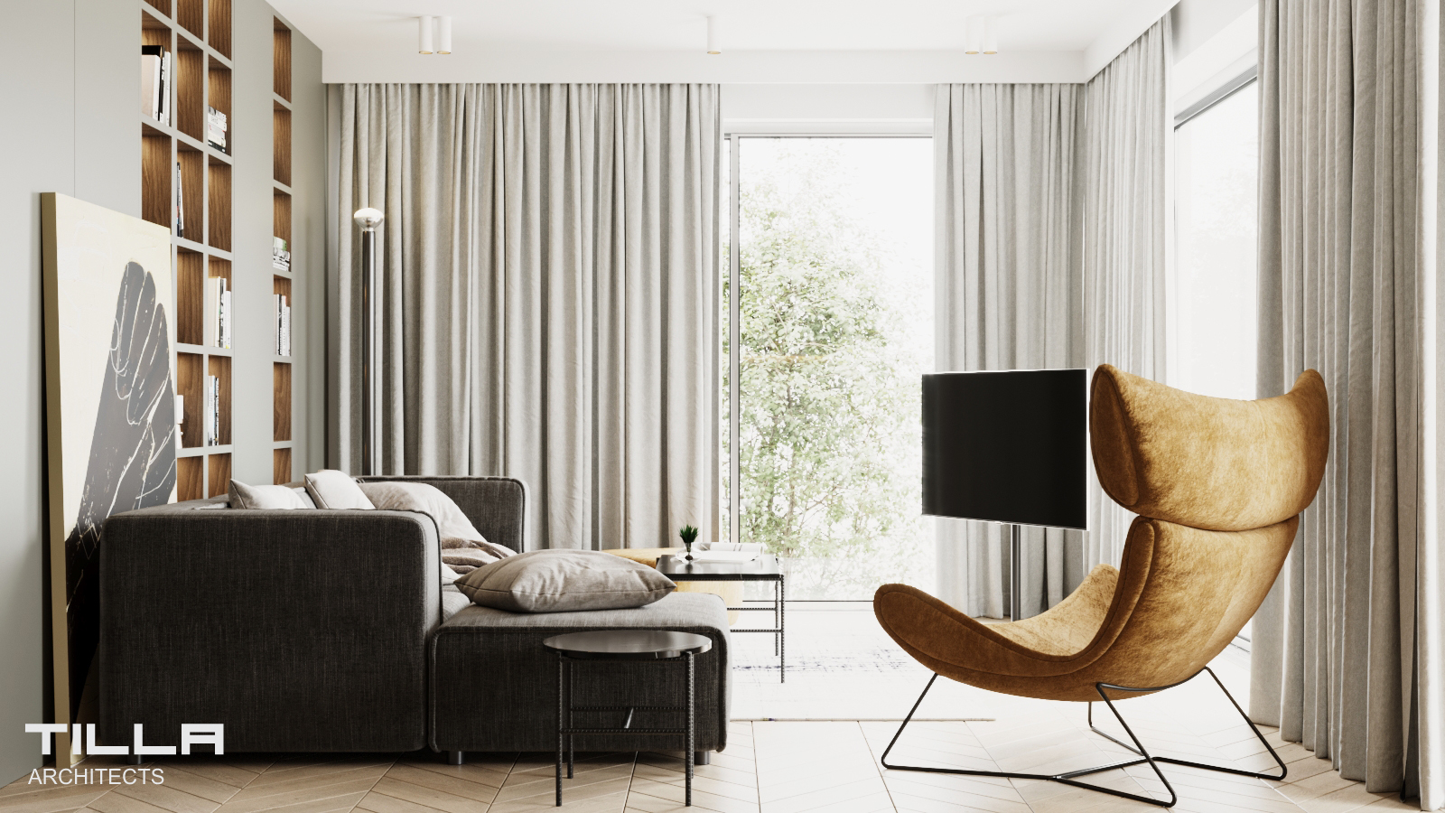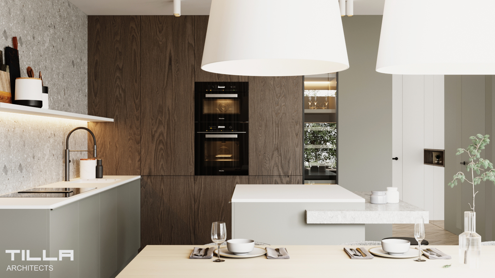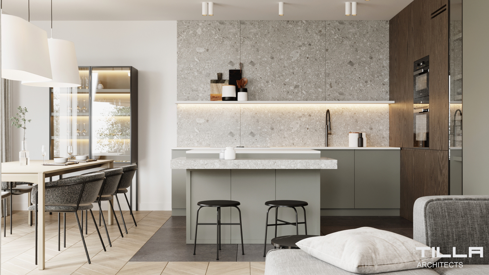 Apartament w Genewie zwraca uwagę harmonijnym połączeniem materiałów, ciepłem i szlachetnym, dopracowanym designem. W strefie dziennej znalazł się regał na książki z podświetlanymi półkami, tapicerowana, wygodna kanapa w odcieniu szarości oraz kultowy fotel Imola projektu Henrika Pedersena dla duńskiej marki BoConcept. Strefa kuchni została oddzielona od pozostałej części dziennej przy pomocy innej podłogi. Wizytówką kuchni jest wdzięczne połączenie terazzo i ciemnego drewna. Minimalistyczne zabudowy i wyspa są dopełnieniem tej przestrzeni. W strefie dziennej znalazł się także jadalniany stół z krzesłami tapicerowanymi tkaniną boucle w szarym odcieniu i przeszklonym kredensem.