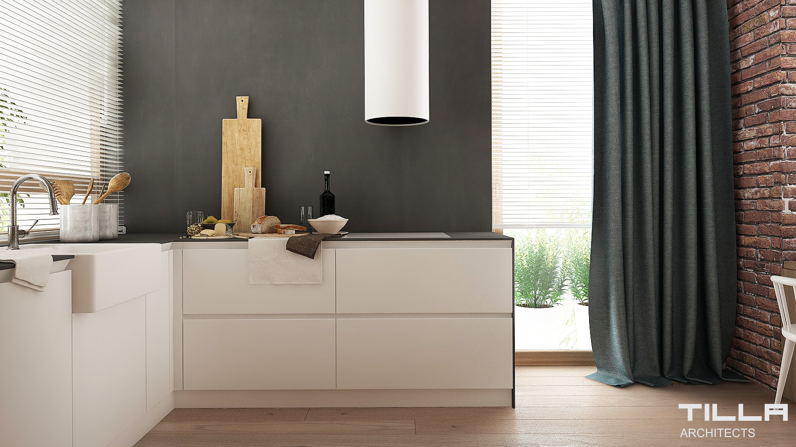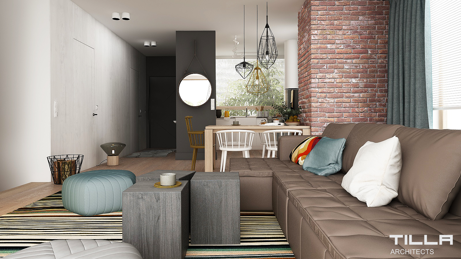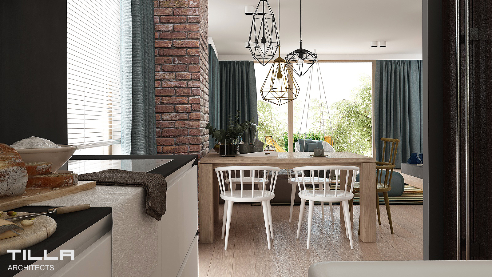 W tym miejscu nie można się nudzić. Jest energetyczny, pełen eklektycznych połączeń, etnicznych nawiązań i koloru. Bohaterem salonu jest dywan w barwne pasy. Ożywia stonowane tło w postaci jasnej podłogi i pozostałych elementów wyposażenia w spokojnych kolorach. Obok kanapy i puf znalazła się również huśtawka z wygodnym siedziskiem. Obok telewizora znalazł się prosty kominek, który dodaje przytulności. Kuchnia jest minimalistyczna – utrzymana w bieli i szarości, ożywiona cegłą, która pojawia się na ścianie. Kącik jadalniany tworzą stół i drewniane krzesła w stylu vintage w różnych kolorach wraz z loftowymi lampami wiszącymi.
