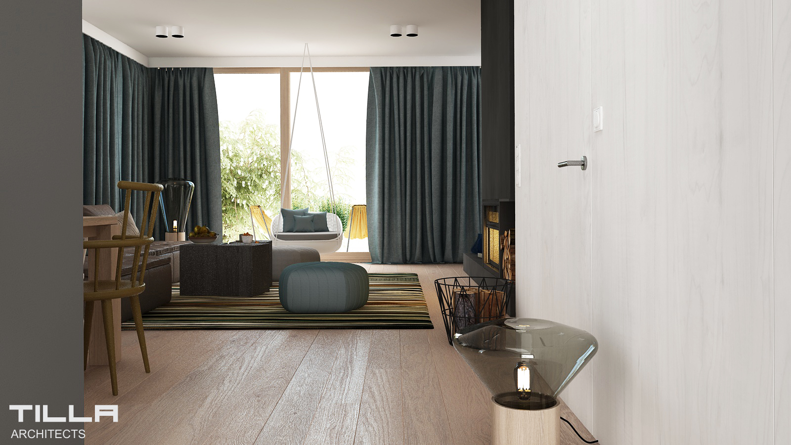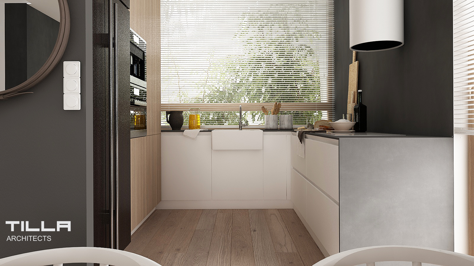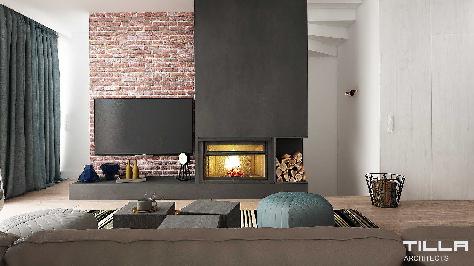 W tym miejscu nie można się nudzić. Jest energetyczny, pełen eklektycznych połączeń, etnicznych nawiązań i koloru. Bohaterem salonu jest dywan w barwne pasy. Ożywia stonowane tło w postaci jasnej podłogi i pozostałych elementów wyposażenia w spokojnych kolorach. Obok kanapy i puf znalazła się również huśtawka z wygodnym siedziskiem. Obok telewizora znalazł się prosty kominek, który dodaje przytulności. Kuchnia jest minimalistyczna – utrzymana w bieli i szarości, ożywiona cegłą, która pojawia się na ścianie. Kącik jadalniany tworzą stół i drewniane krzesła w stylu vintage w różnych kolorach wraz z loftowymi lampami wiszącymi.