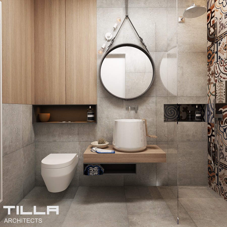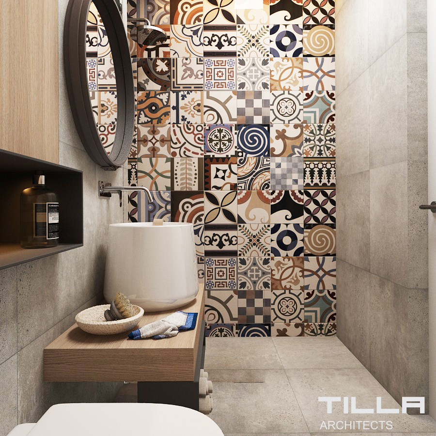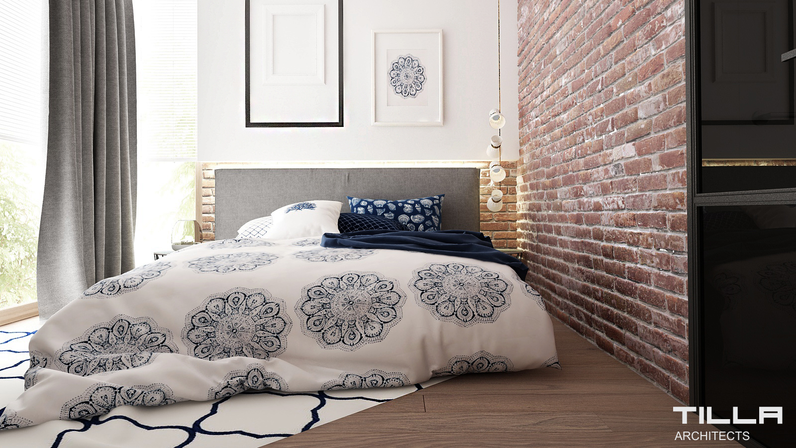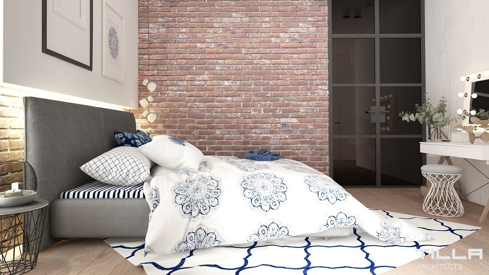 W sypialni część ścian również pokryto cegłą, pozostała część została utrzymana w bieli. Dekoracyjnym akcentem jest tu dywan z geometrycznym wzorem i obrazy nad łóżkiem. Łazienka na pierwszy rzut oka wydaje się surowa ze względu na szare płytki. Jednak znalazło się tu miejsca na mocny dekoracyjny akcent w postaci marokańskich płytek z różnymi wzorami. Całość jest pełna energii, emanuje domowym ciepłem i optymizmem.