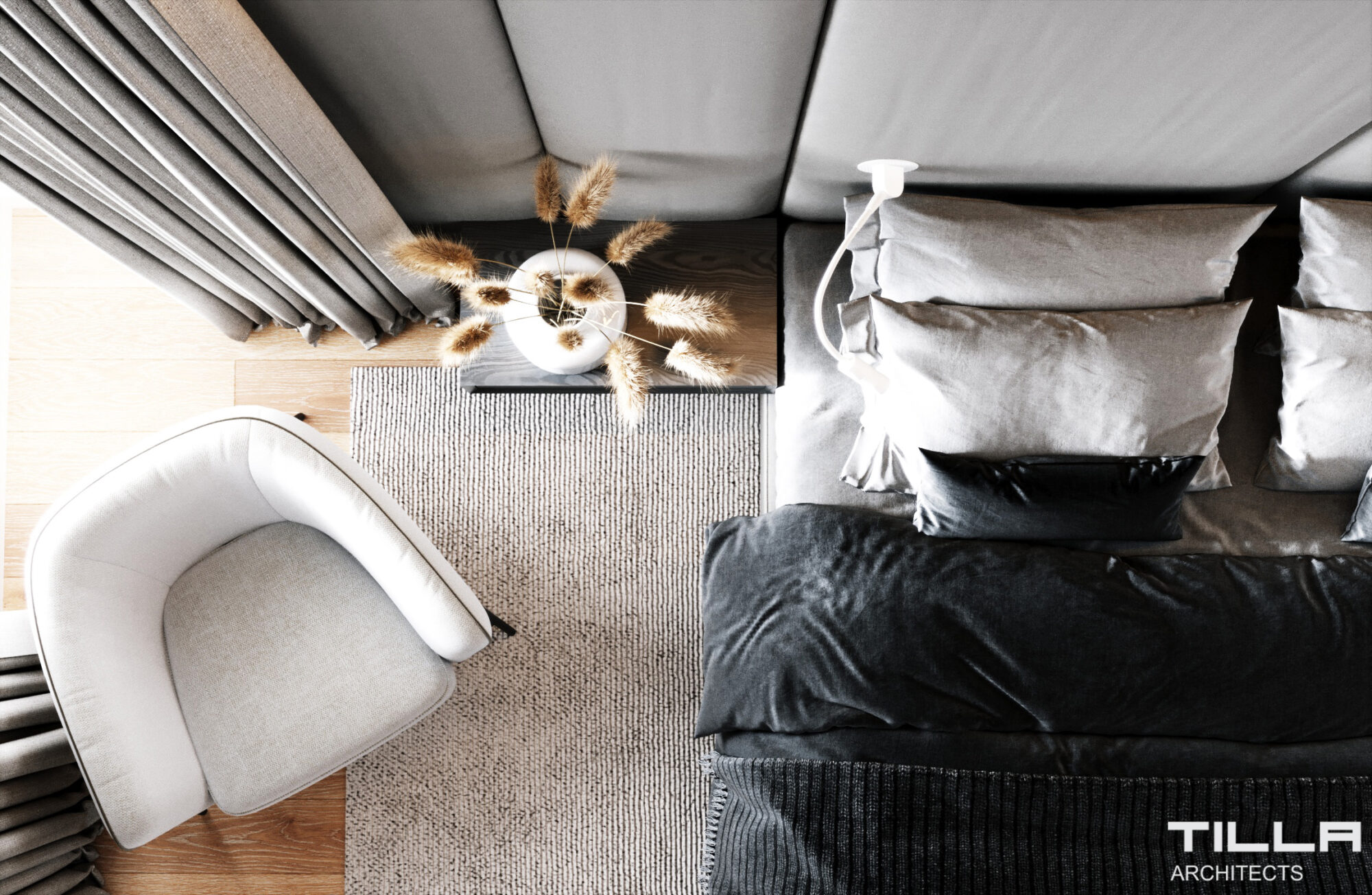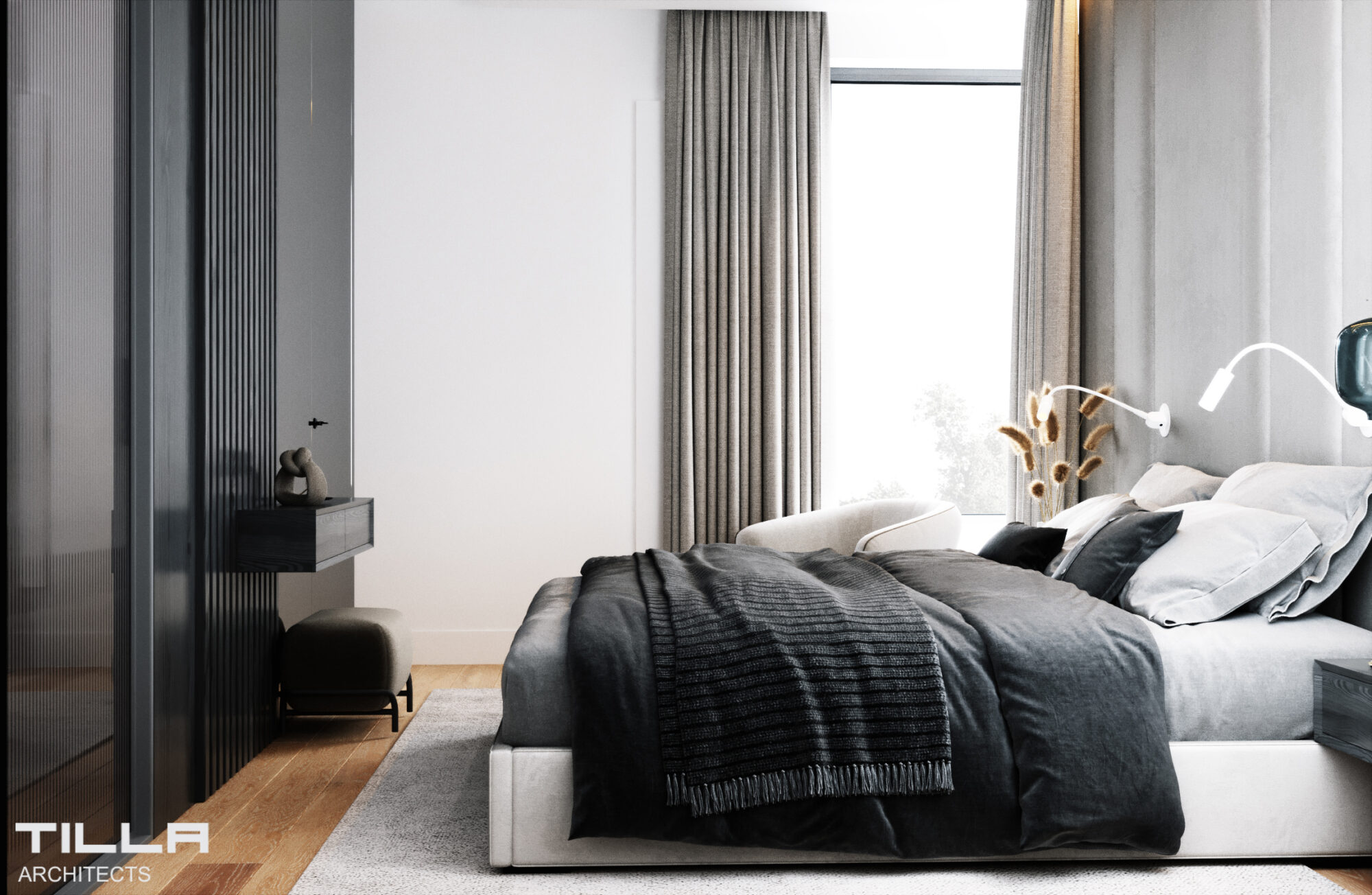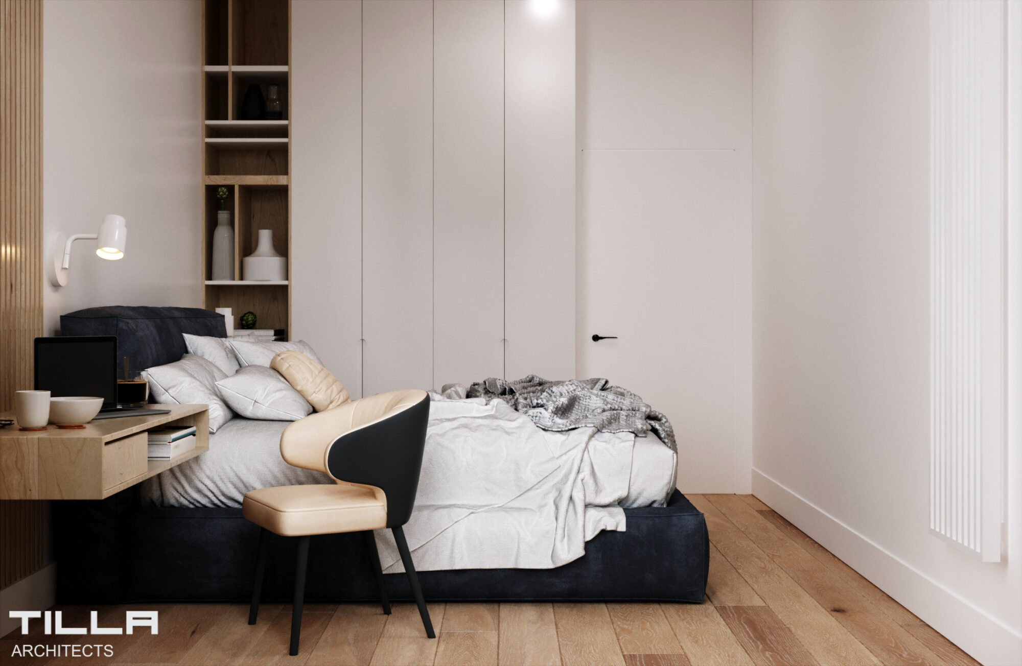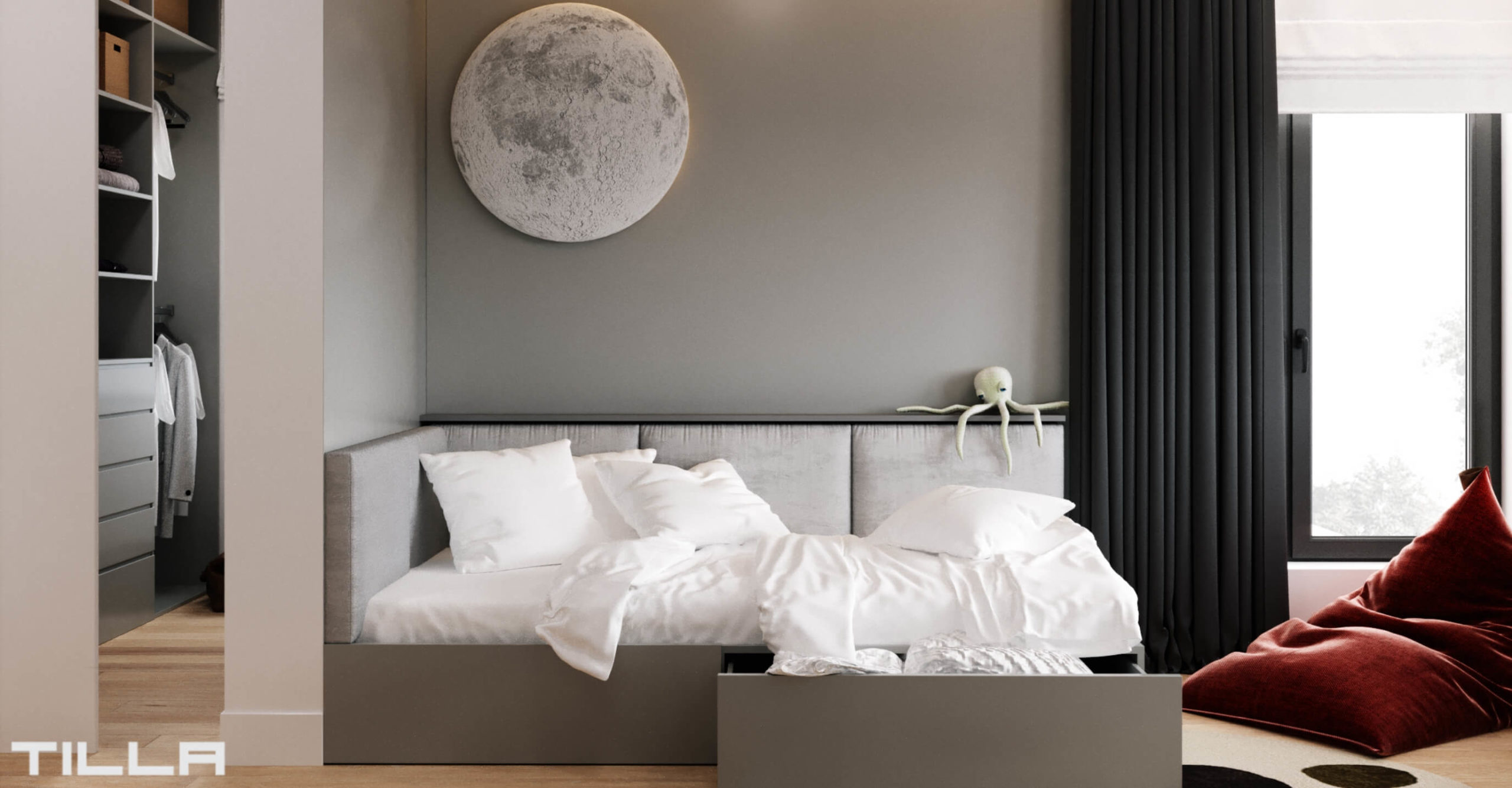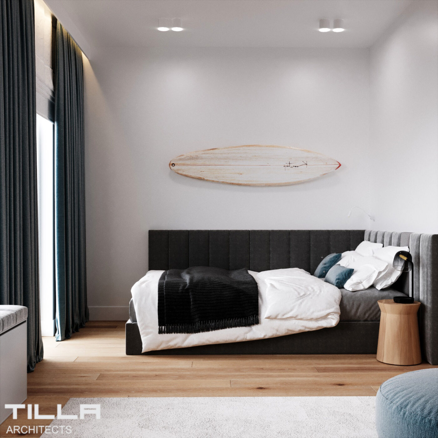 Sypialnia to czarno-biała oaza spokoju z łóżkiem w kolorze przygaszonej pomarańczy. Pozostałe sypialnie zostały utrzymane w podobnej estetyce i stonowanych barwach – szarości i beżu. W jednym z pokoi znalazła się nietypowa ozdoba w postaci deski surfingowej powieszonej na ścianie. W pokoju syna inwestorów najbardziej przykuwającym wzrok akcentem jest natomiast tapeta z motywem księżyca w pełni. Łazienki są minimalistyczne i wpisujące się w koncepcję całości. Jest przytulnie, nowocześnie i z klasą.