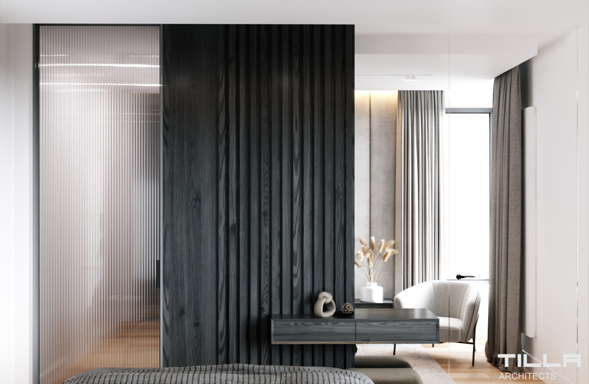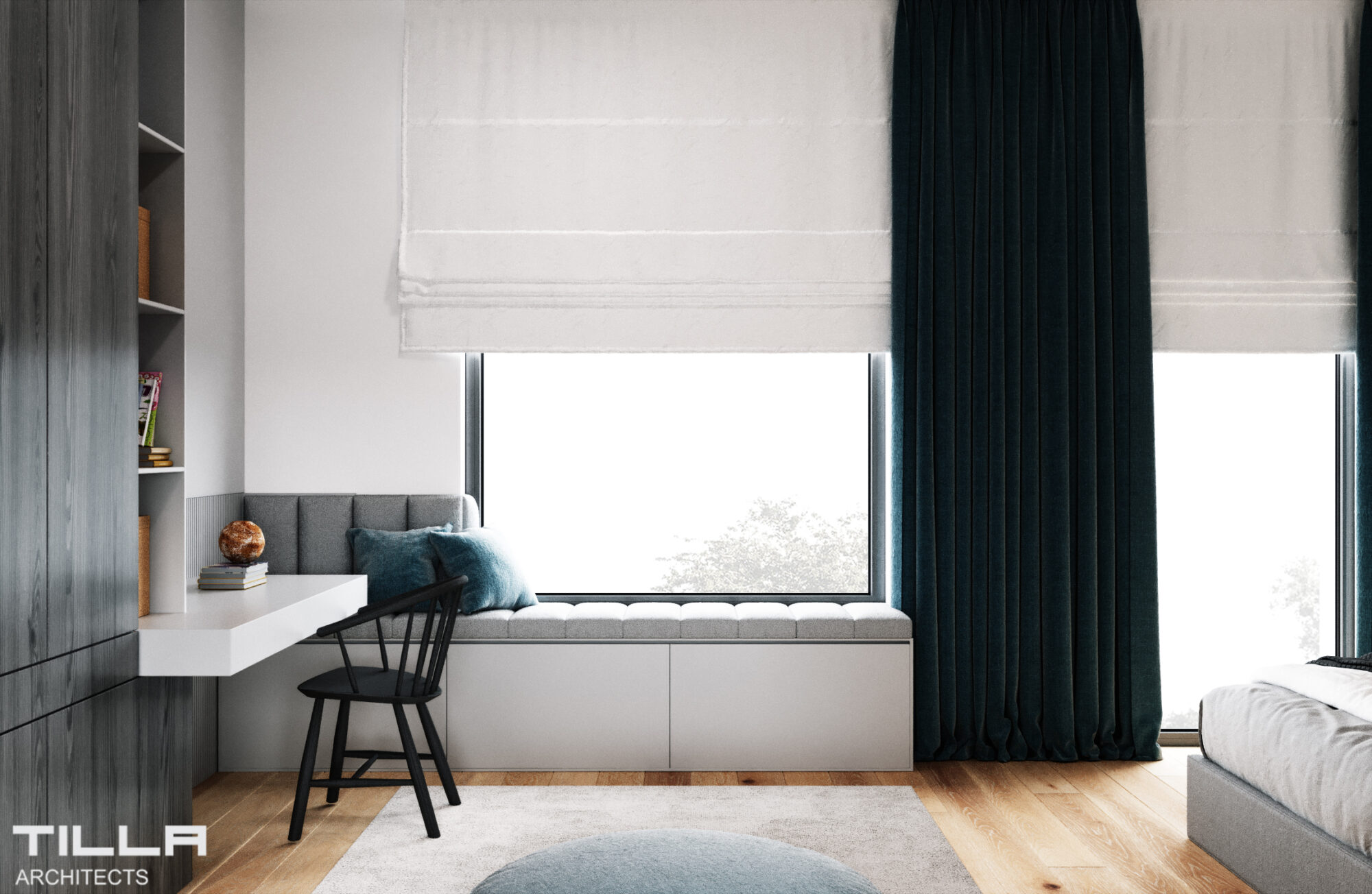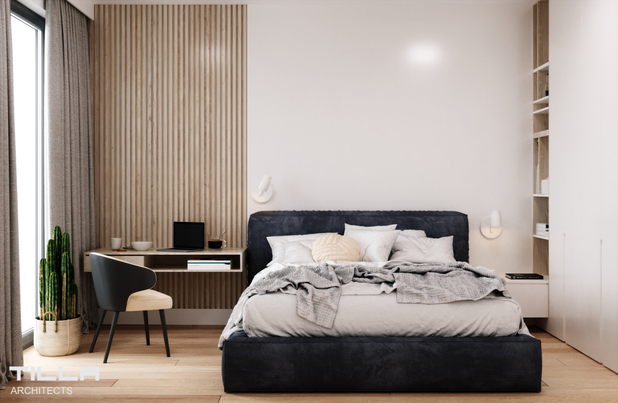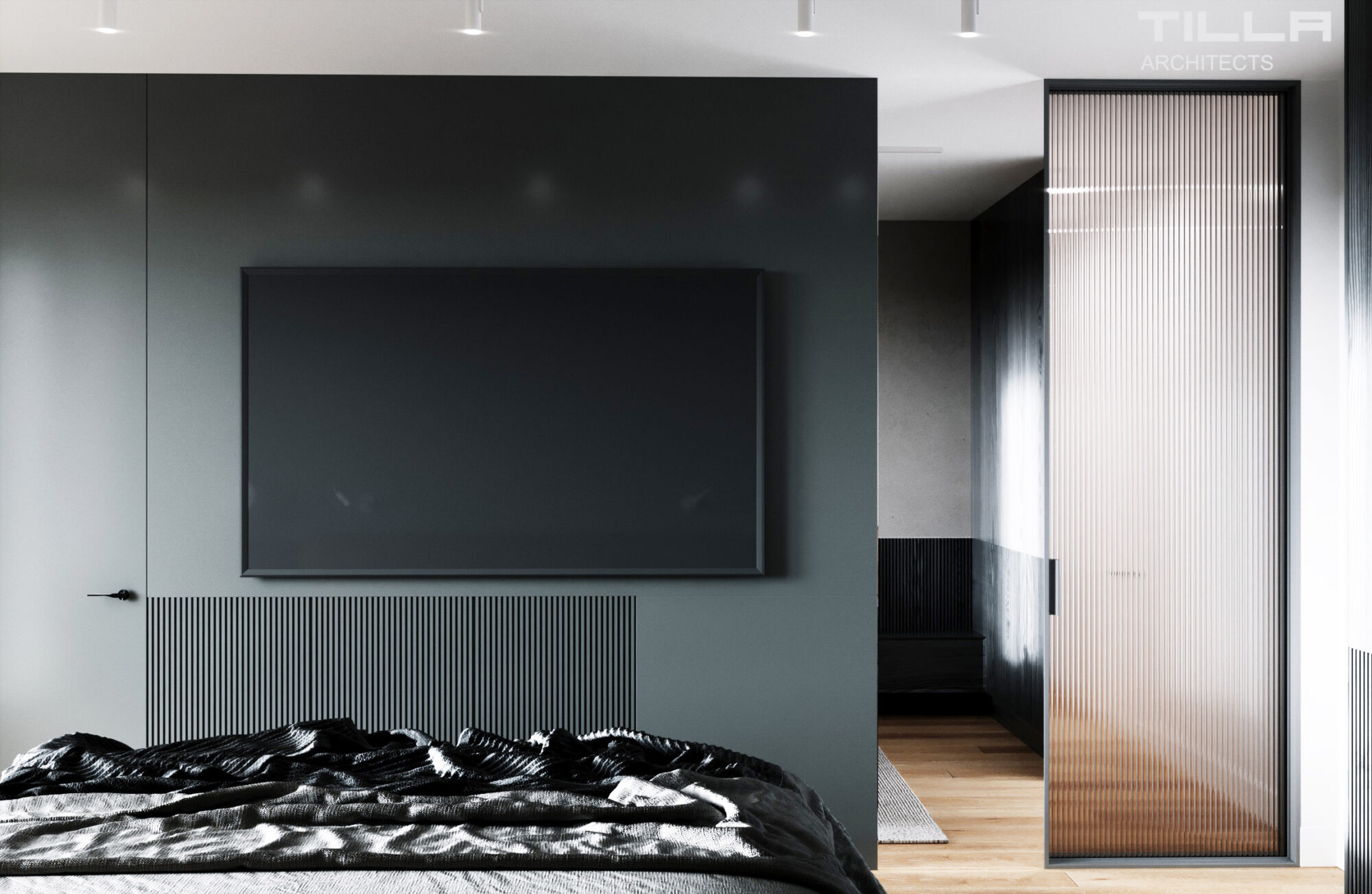 Sypialnia to czarno-biała oaza spokoju z łóżkiem w kolorze przygaszonej pomarańczy. Pozostałe sypialnie zostały utrzymane w podobnej estetyce i stonowanych barwach – szarości i beżu. W jednym z pokoi znalazła się nietypowa ozdoba w postaci deski surfingowej powieszonej na ścianie. W pokoju syna inwestorów najbardziej przykuwającym wzrok akcentem jest natomiast tapeta z motywem księżyca w pełni. Łazienki są minimalistyczne i wpisujące się w koncepcję całości. Jest przytulnie, nowocześnie i z klasą.