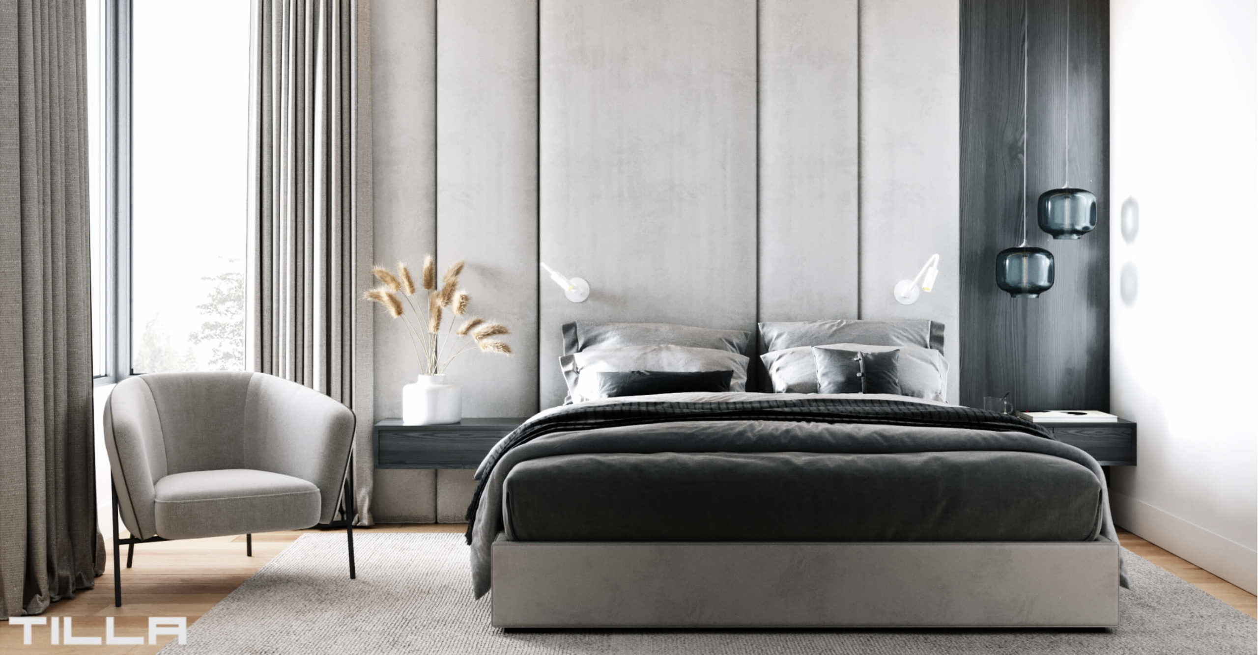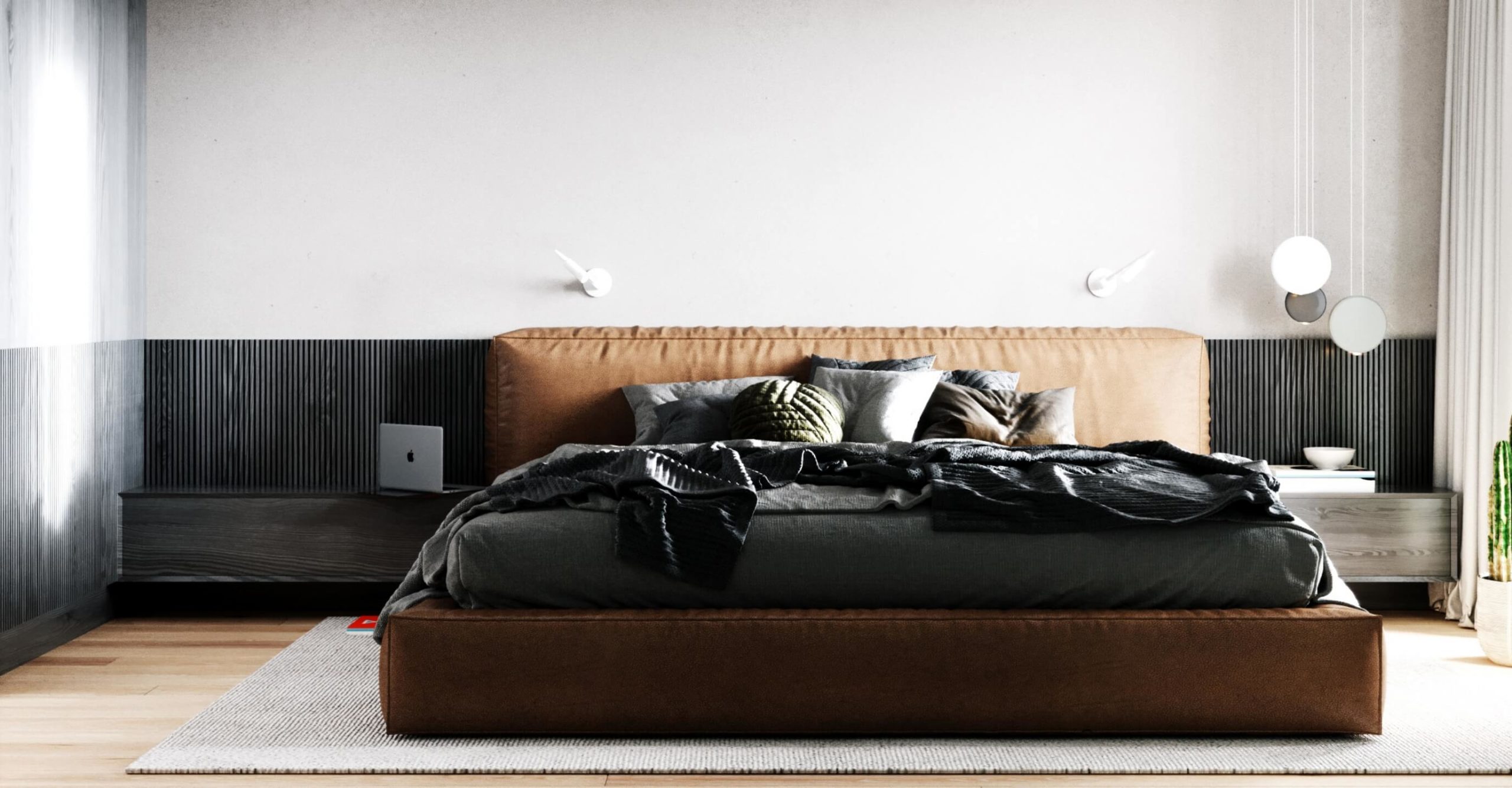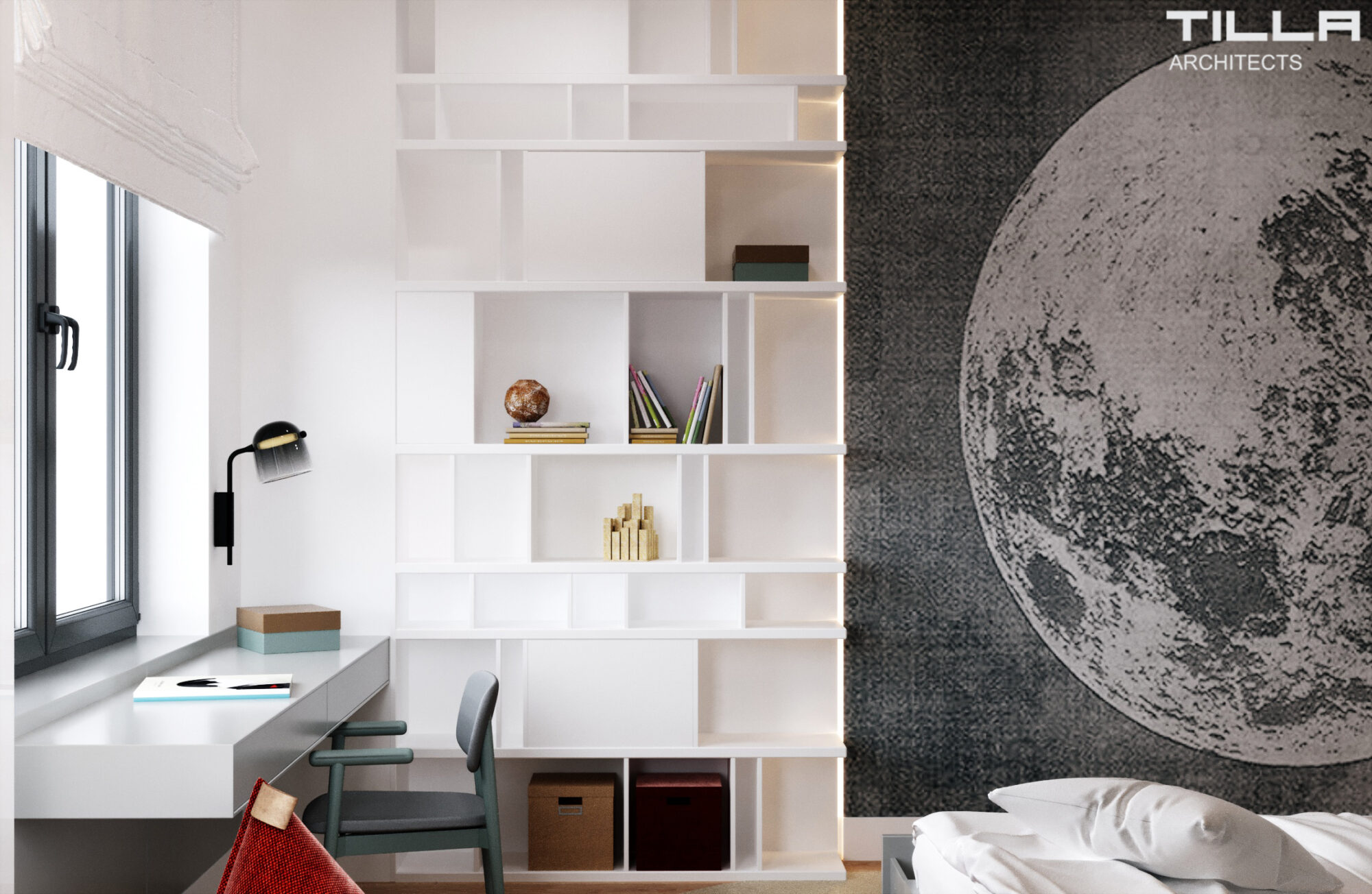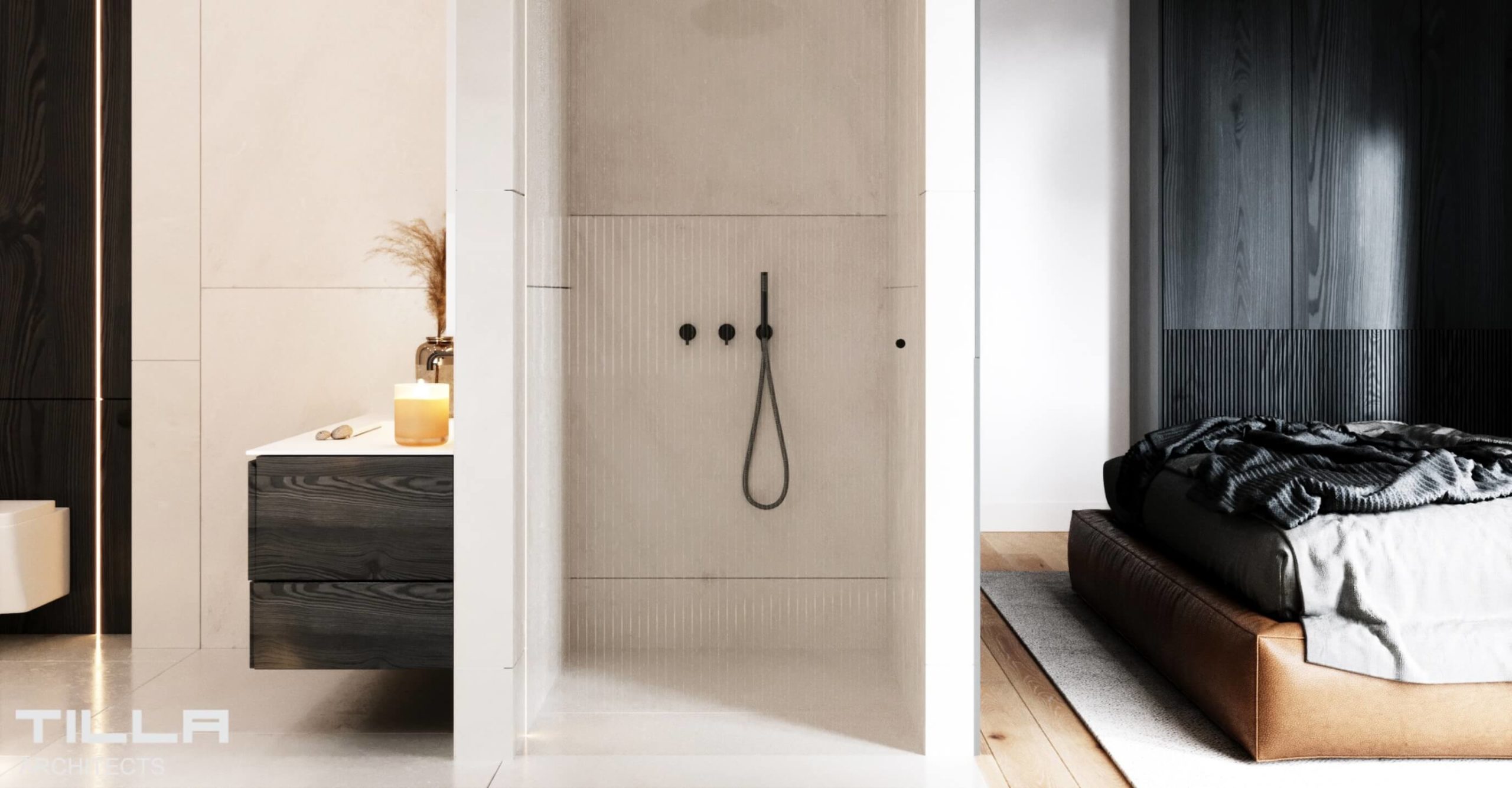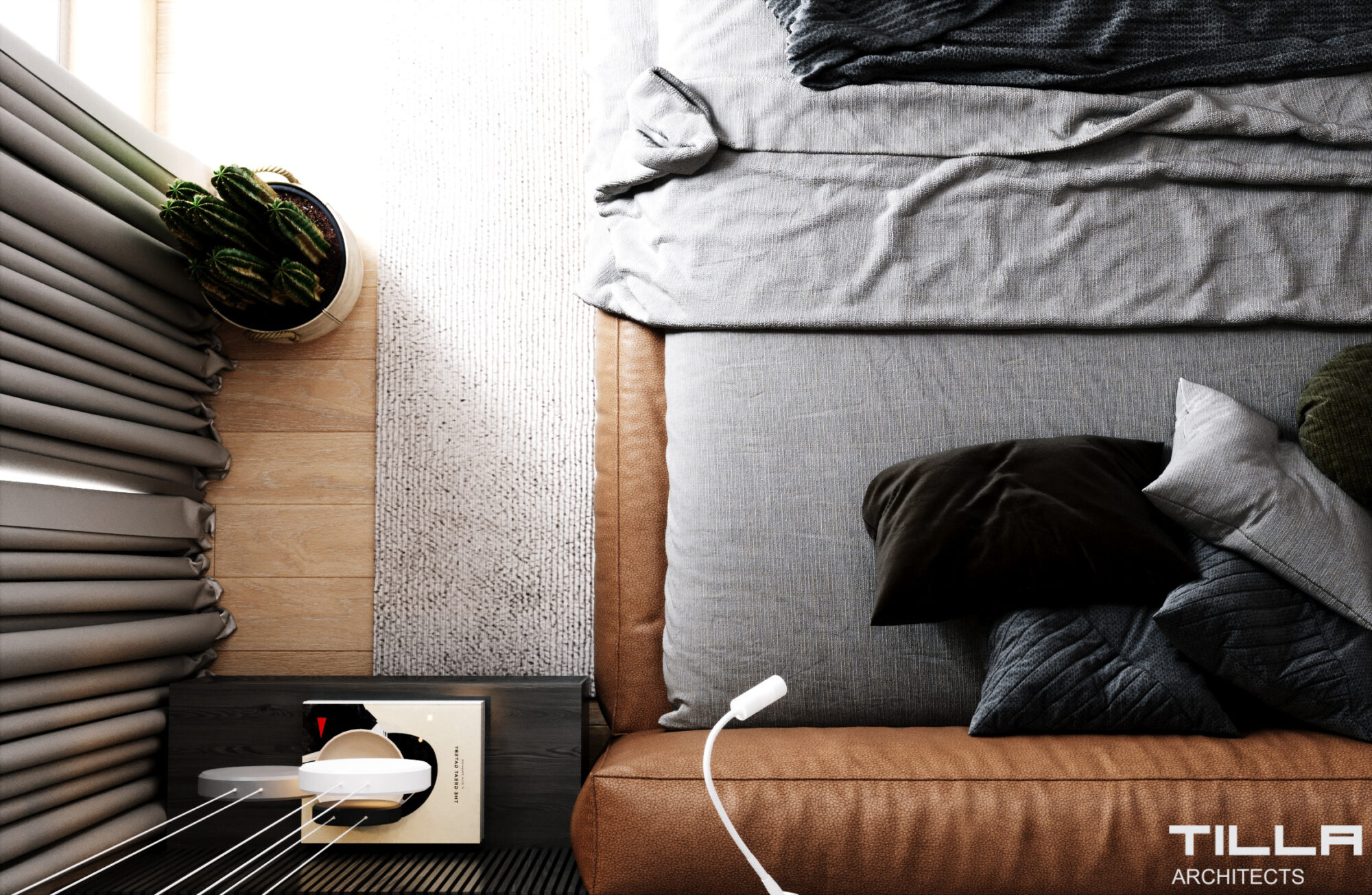 Sypialnia to czarno-biała oaza spokoju z łóżkiem w kolorze przygaszonej pomarańczy. Pozostałe sypialnie zostały utrzymane w podobnej estetyce i stonowanych barwach – szarości i beżu. W jednym z pokoi znalazła się nietypowa ozdoba w postaci deski surfingowej powieszonej na ścianie. W pokoju syna inwestorów najbardziej przykuwającym wzrok akcentem jest natomiast tapeta z motywem księżyca w pełni. Łazienki są minimalistyczne i wpisujące się w koncepcję całości. Jest przytulnie, nowocześnie i z klasą.