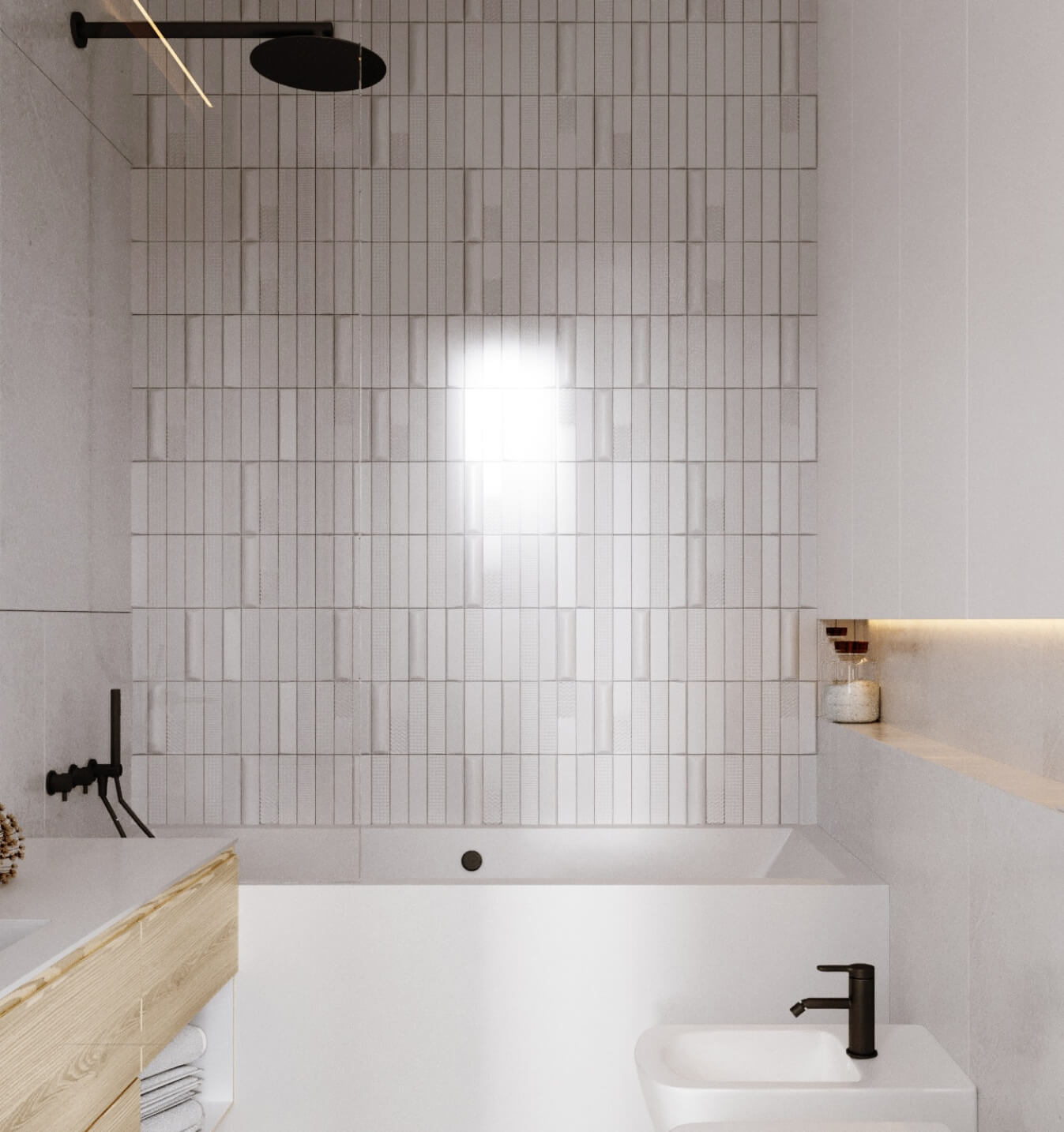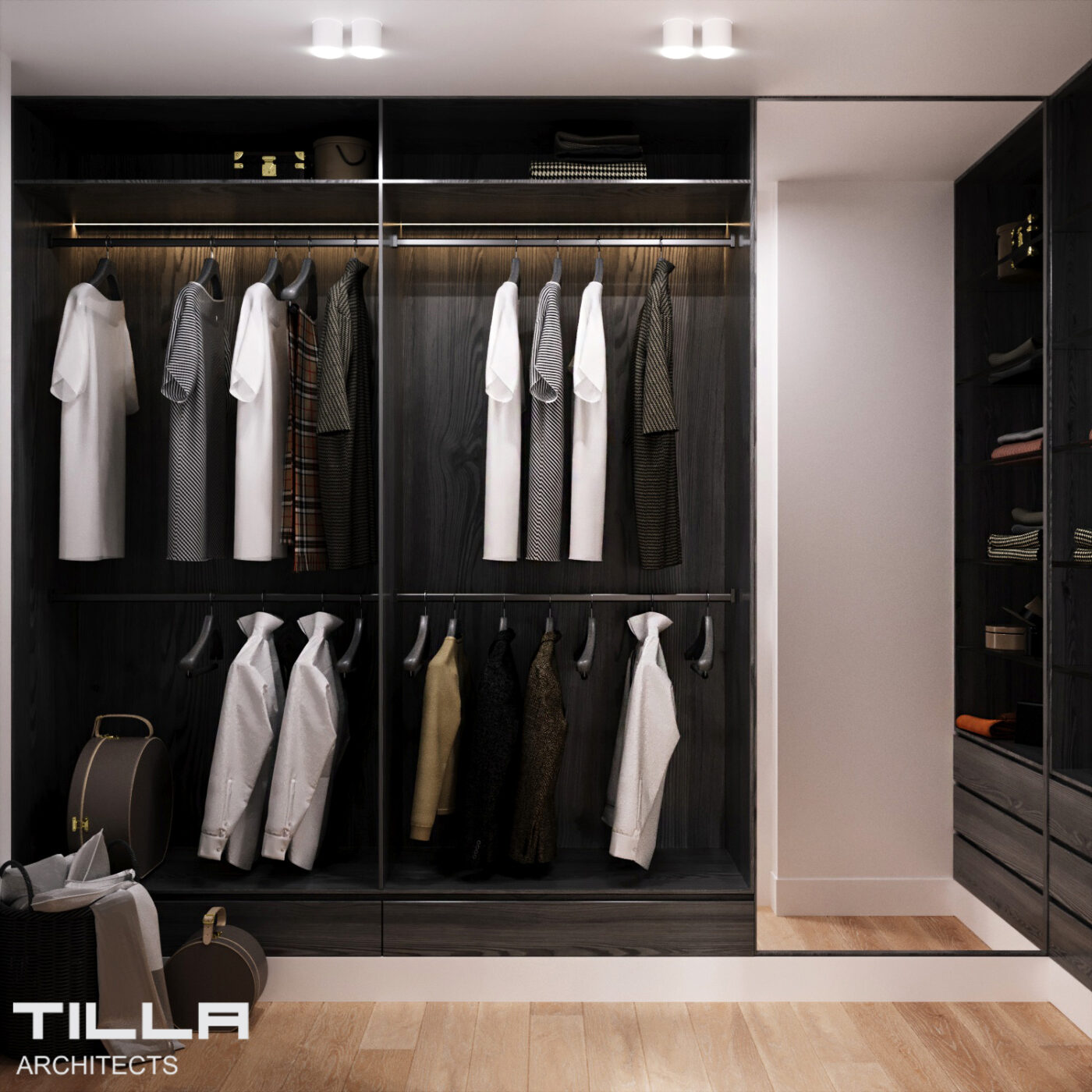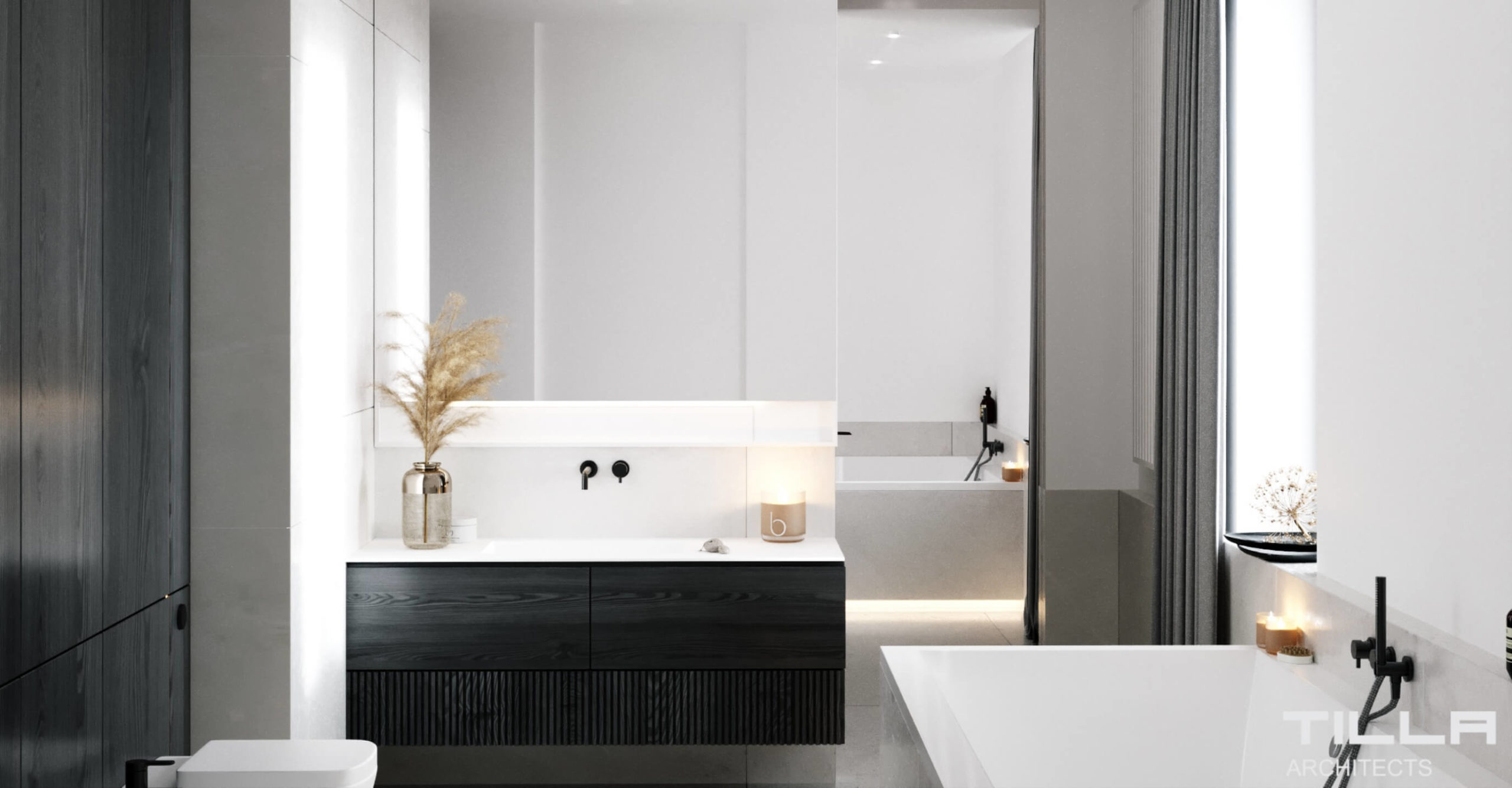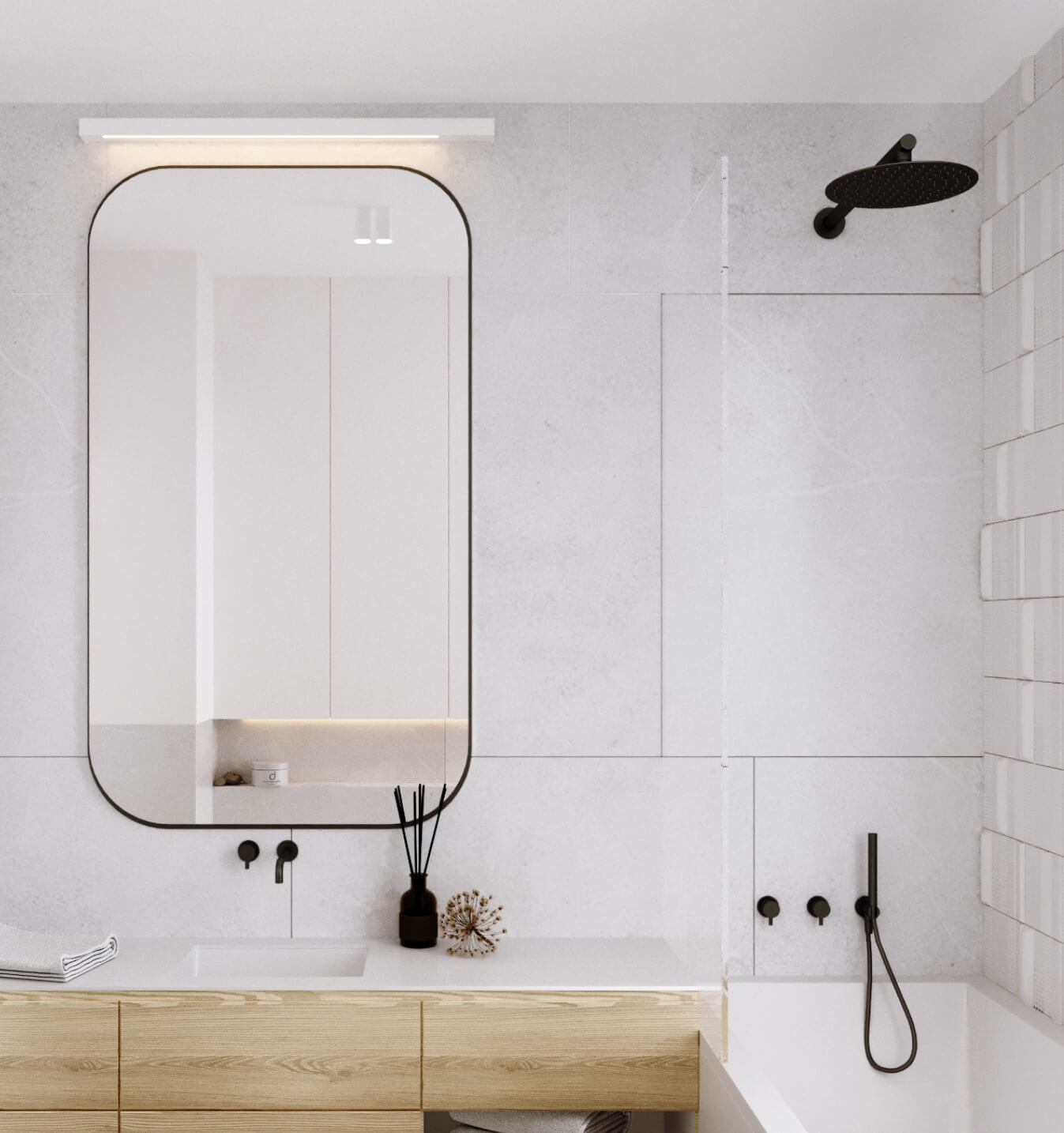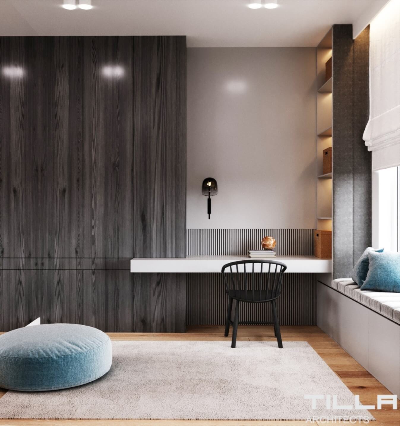 Sypialnia to czarno-biała oaza spokoju z łóżkiem w kolorze przygaszonej pomarańczy. Pozostałe sypialnie zostały utrzymane w podobnej estetyce i stonowanych barwach – szarości i beżu. W jednym z pokoi znalazła się nietypowa ozdoba w postaci deski surfingowej powieszonej na ścianie. W pokoju syna inwestorów najbardziej przykuwającym wzrok akcentem jest natomiast tapeta z motywem księżyca w pełni. Łazienki są minimalistyczne i wpisujące się w koncepcję całości. Jest przytulnie, nowocześnie i z klasą.