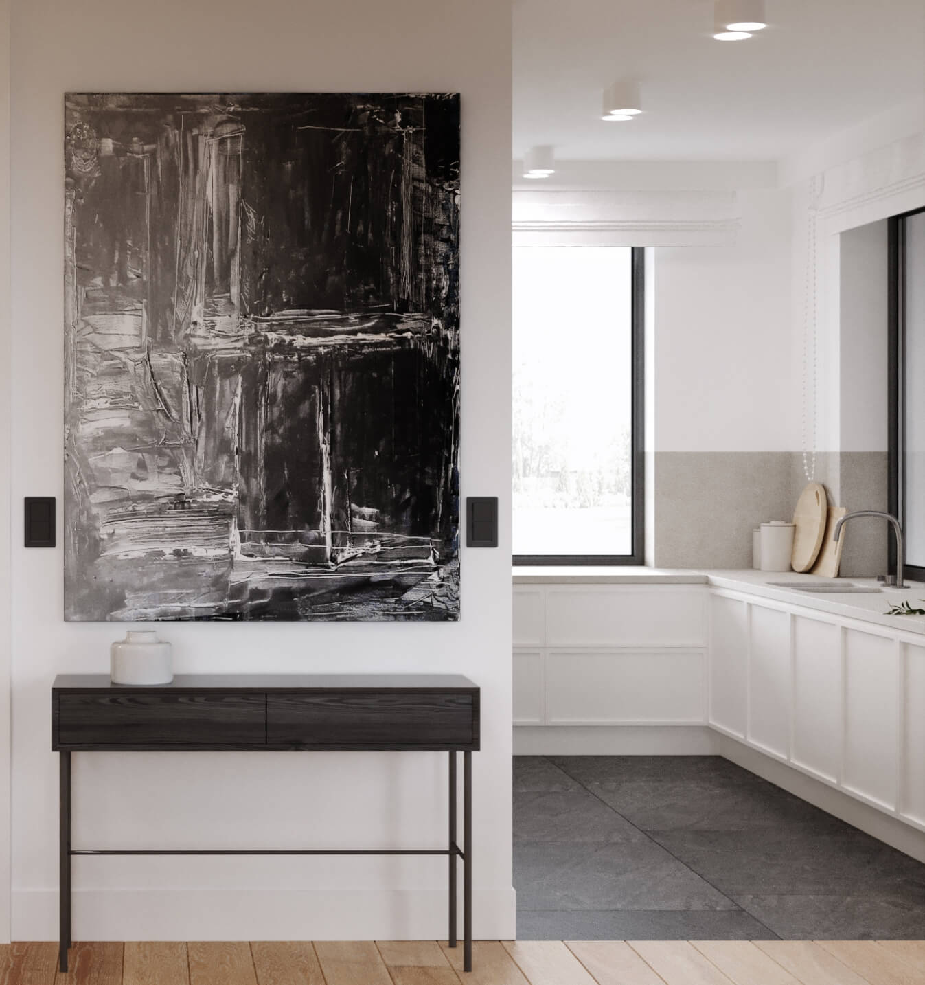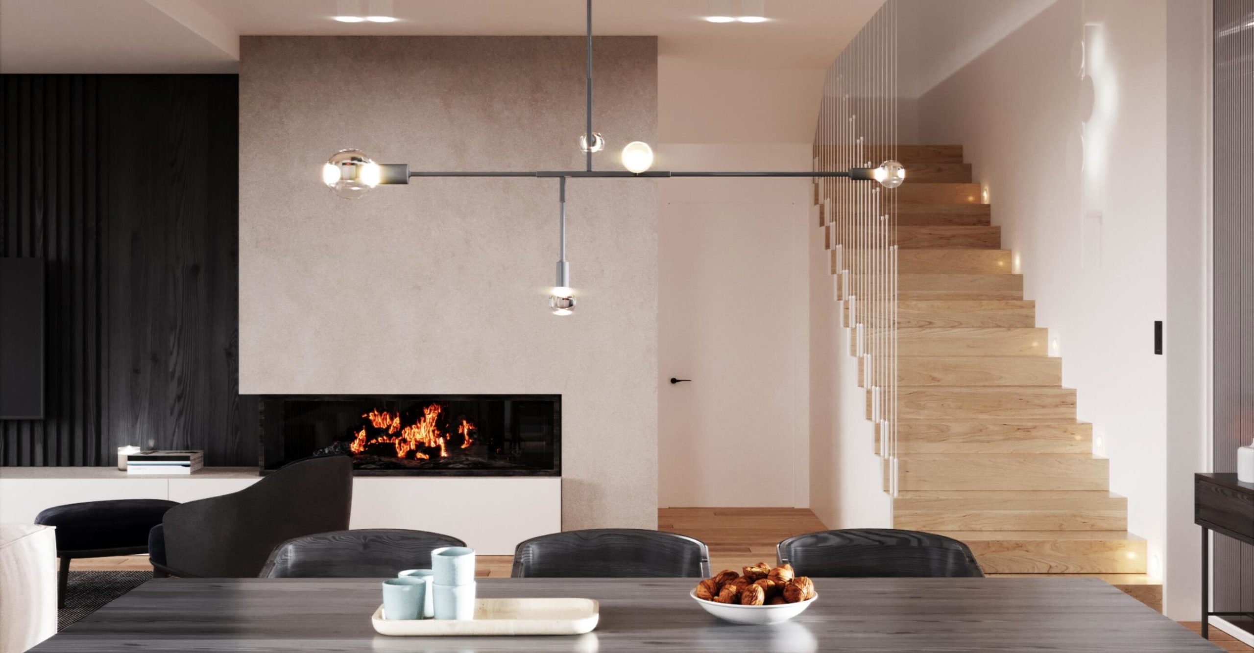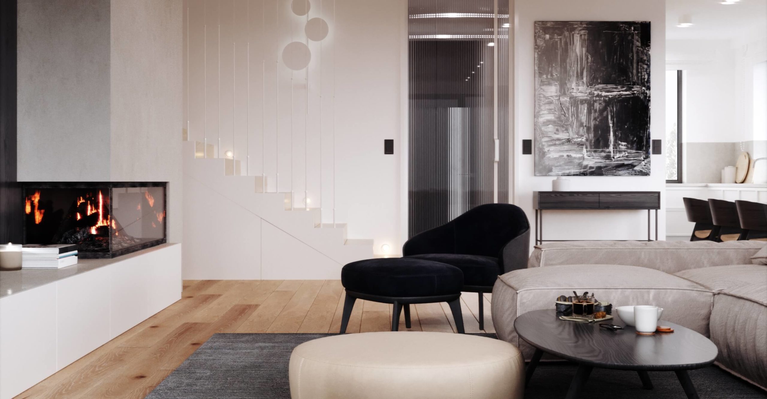 Ten dom utrzymany w stylu minimalistycznym jest pełen ciepła i dbałości o detale. W strefie dziennej królują biel, drewno, czerń i piaskowe beże. Strefa wypoczynkowa z miękką tapicerowaną kanapą, tv i kominkiem jest sercem tej przestrzeni. Kuchnię oddziela umowna granica, którą wyznaczają płytki na podłodze. Zabudowy w kolorze bieli i drewna komponują się z pozostałą częścią wnętrza. Stół w jadalni umieszczono naprzeciwko dużego okna, dzięki czemu podczas celebracji posiłków można cieszyć się widokiem na ogród.