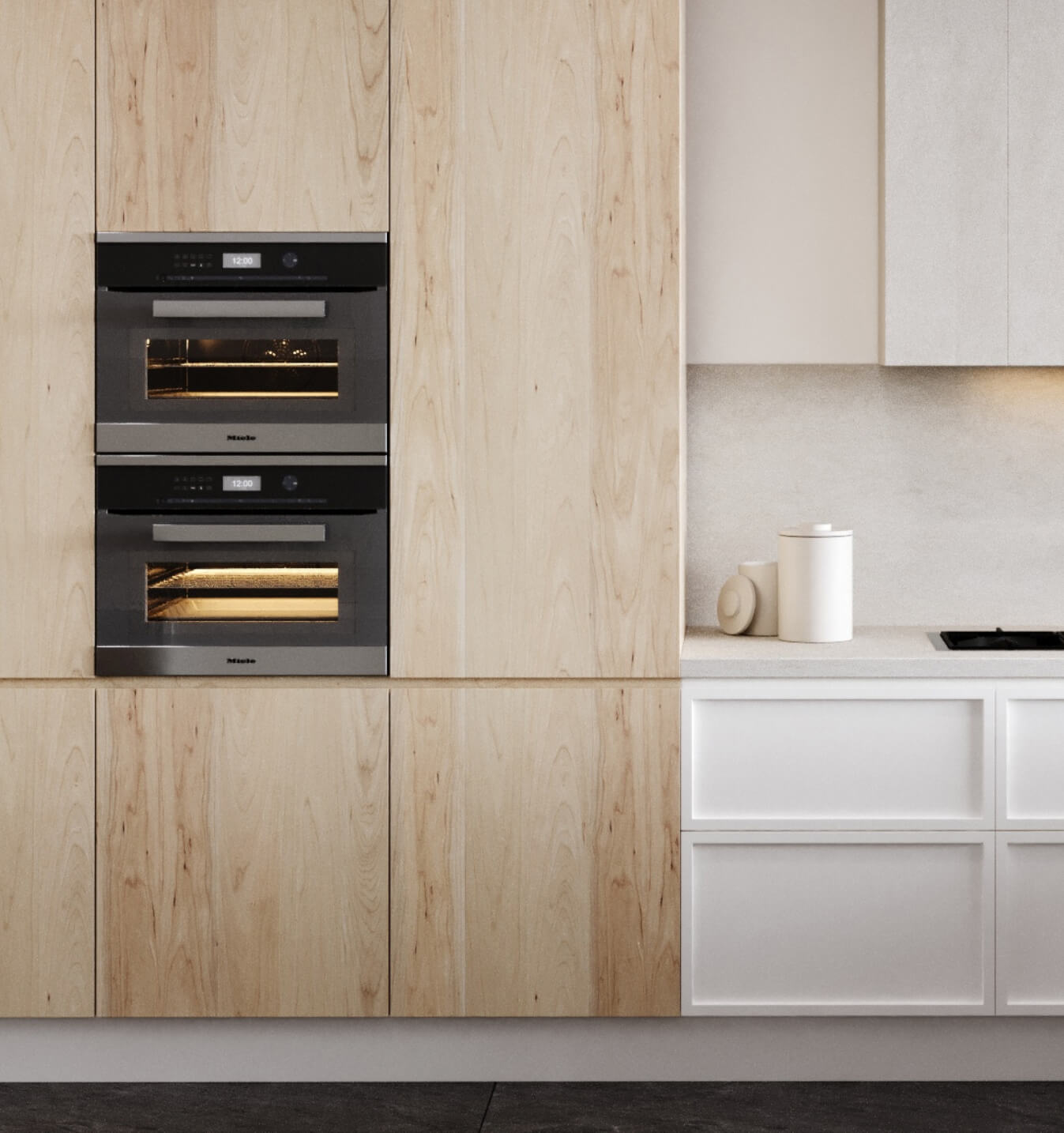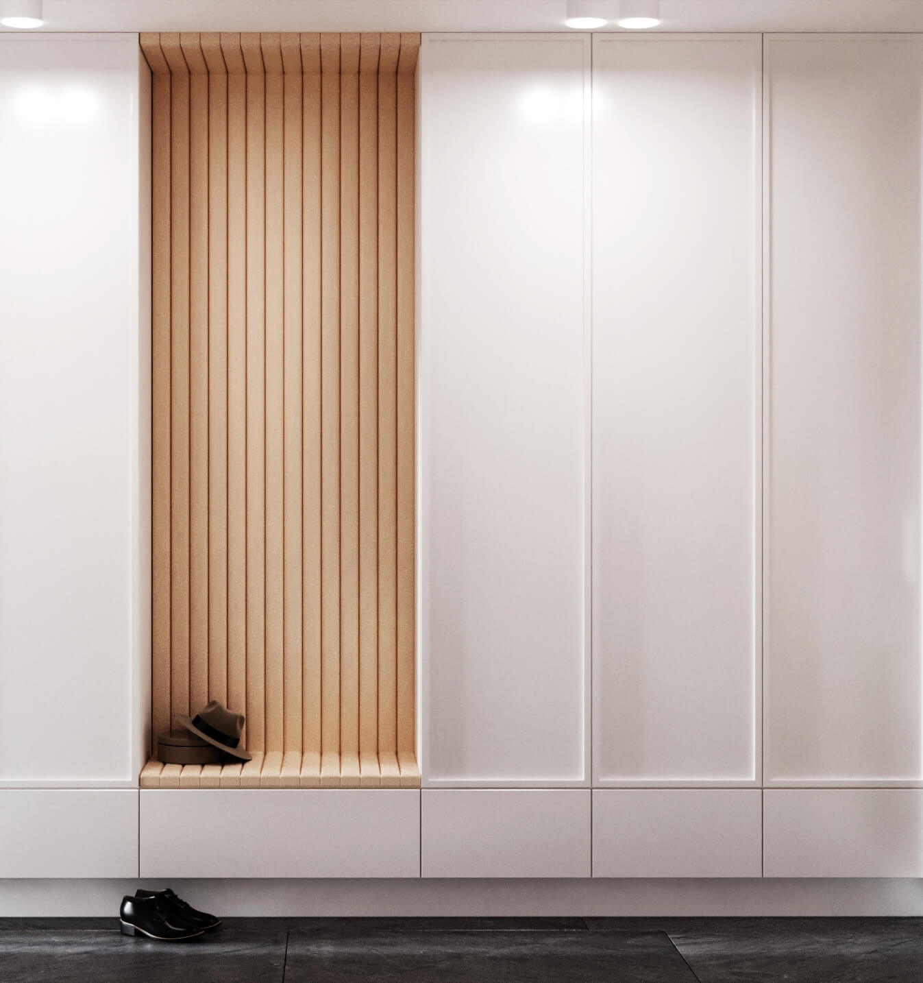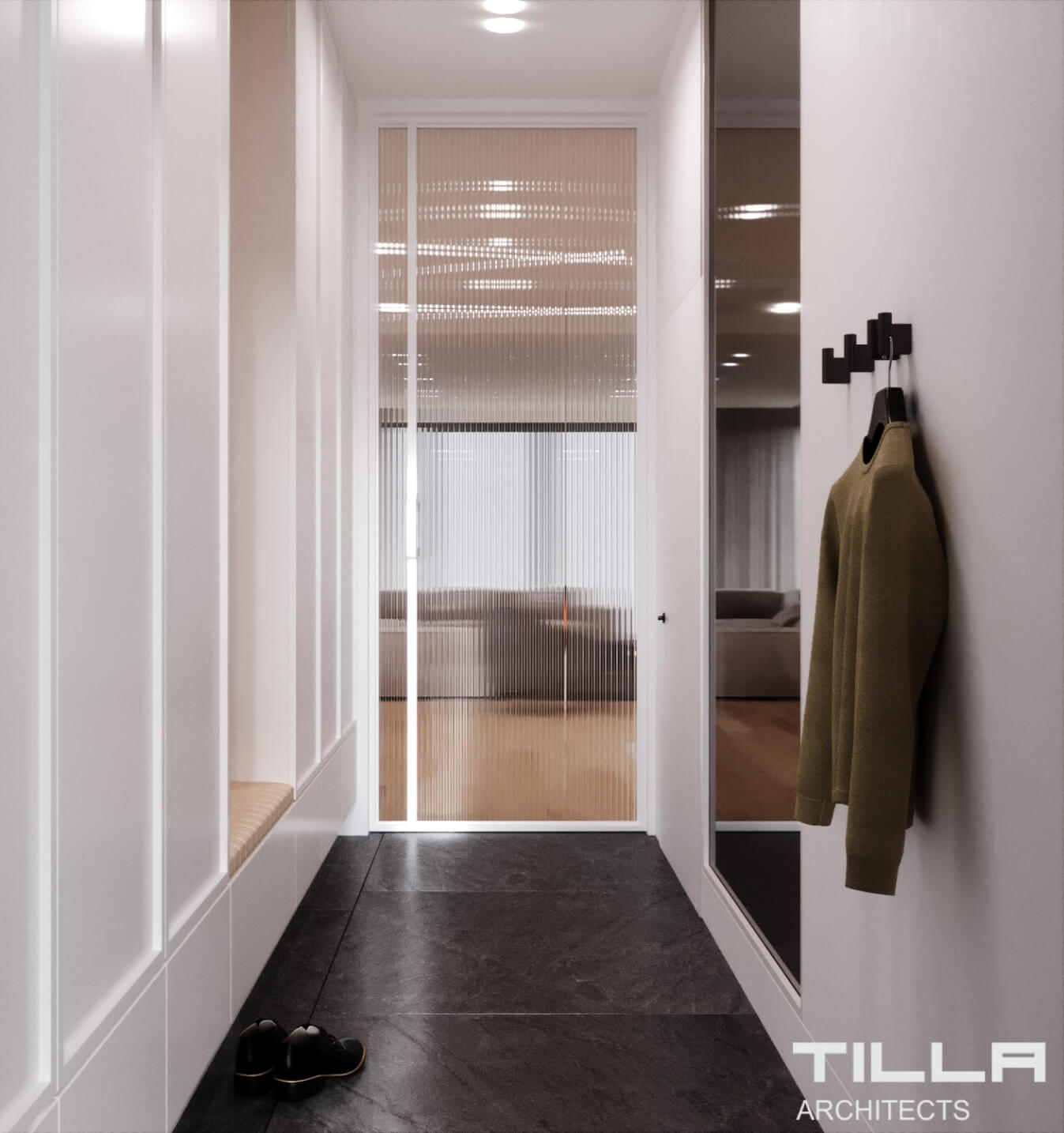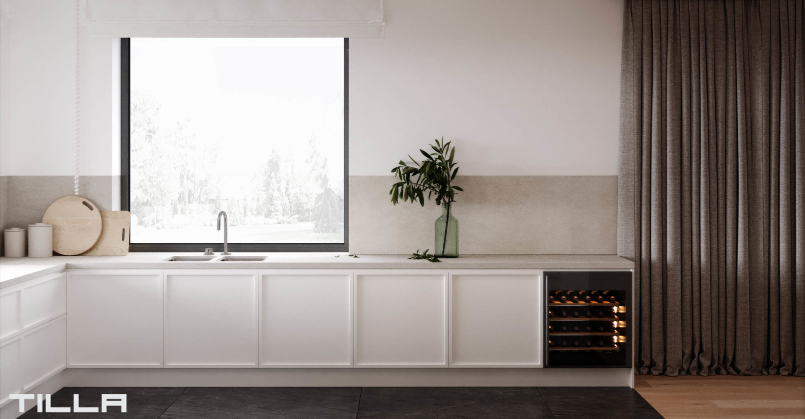 Ten dom utrzymany w stylu minimalistycznym jest pełen ciepła i dbałości o detale. W strefie dziennej królują biel, drewno, czerń i piaskowe beże. Strefa wypoczynkowa z miękką tapicerowaną kanapą, tv i kominkiem jest sercem tej przestrzeni. Kuchnię oddziela umowna granica, którą wyznaczają płytki na podłodze. Zabudowy w kolorze bieli i drewna komponują się z pozostałą częścią wnętrza. Stół w jadalni umieszczono naprzeciwko dużego okna, dzięki czemu podczas celebracji posiłków można cieszyć się widokiem na ogród.