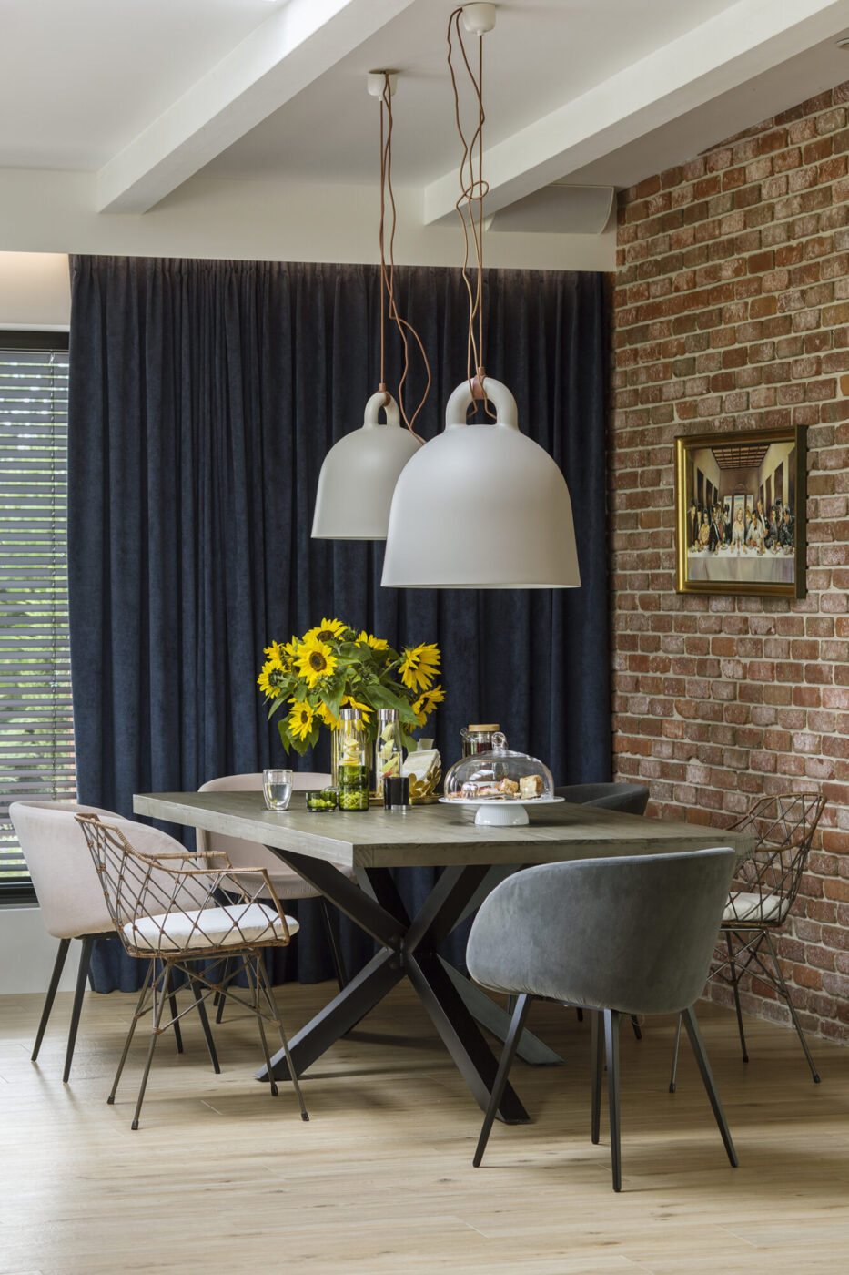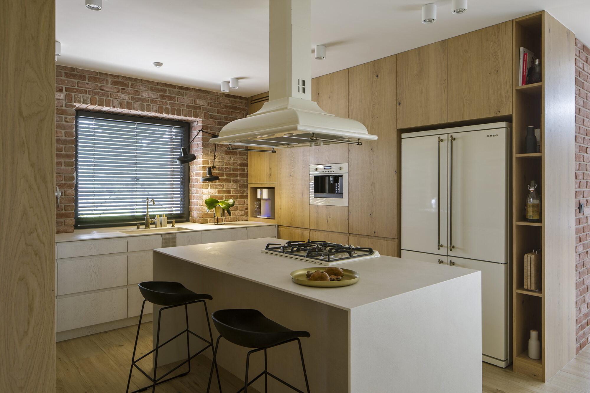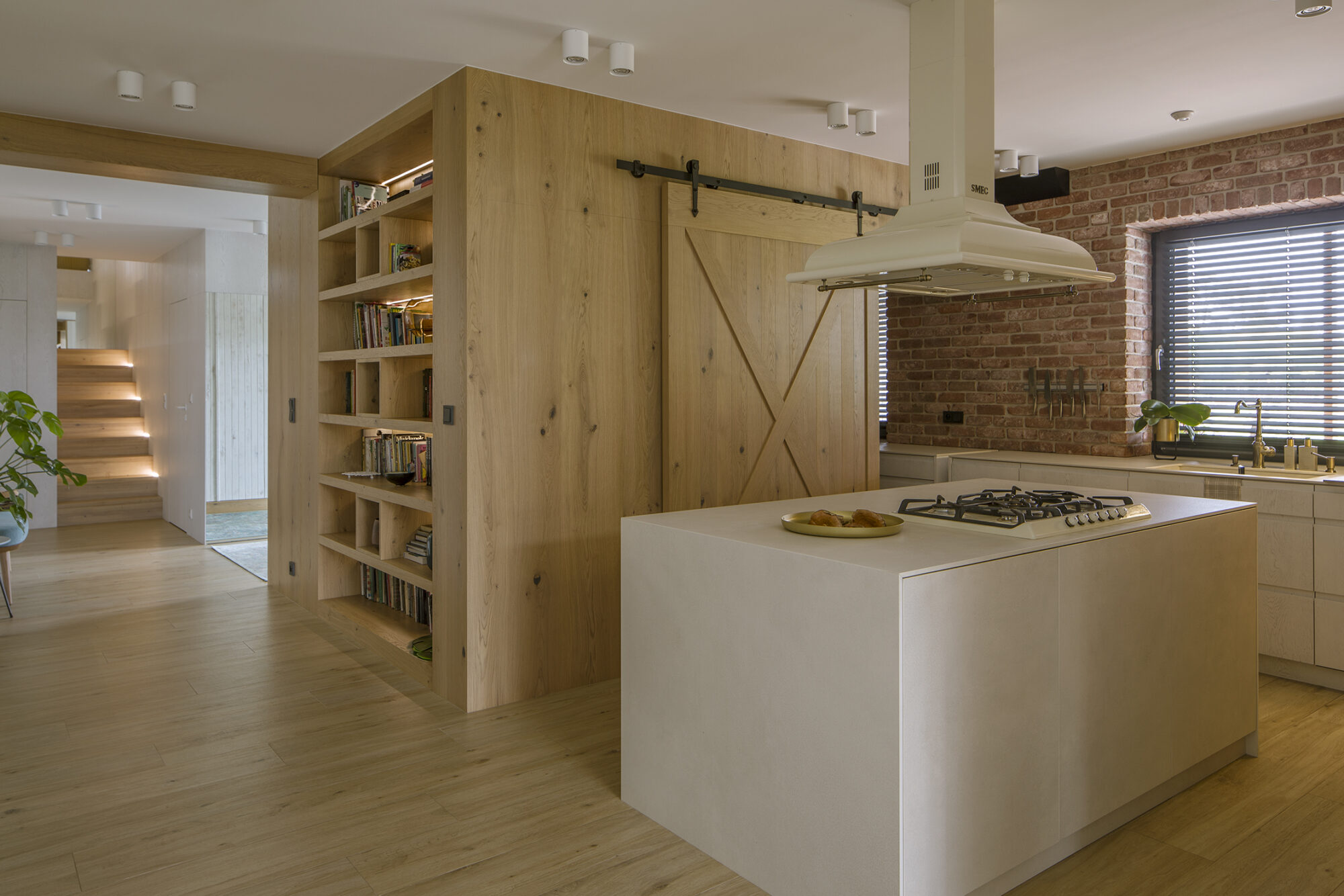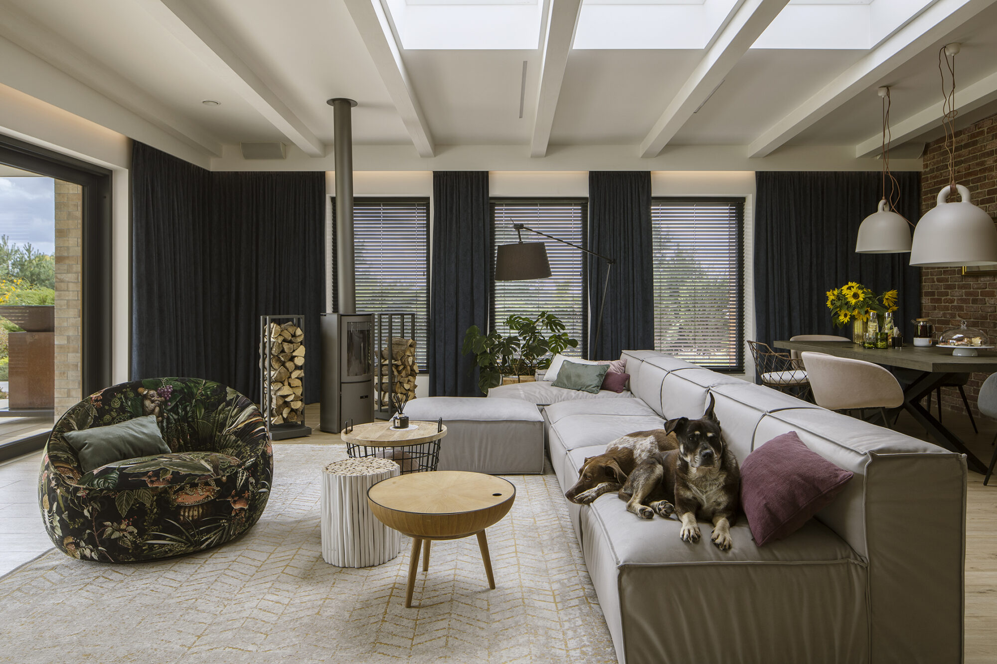 Dom w Babicach to miejsce, które urzeka sielskim klimatem i rustykalnymi nawiązaniami. Cegła, drewno i elementy w stylu vintage występują tu ramię w ramię z nowoczesnym designem. W strefie dziennej prym wiedzie czerwona cegła, która pojawia się w salonie kuchni oraz innych pomieszczeniach domu. Widoczne belki na suficie podkreślają rustykalny charakter aranżacji.