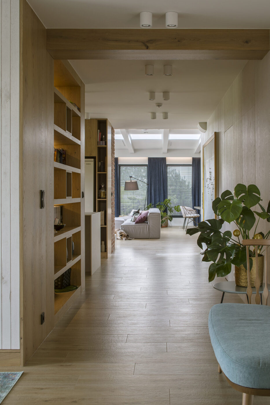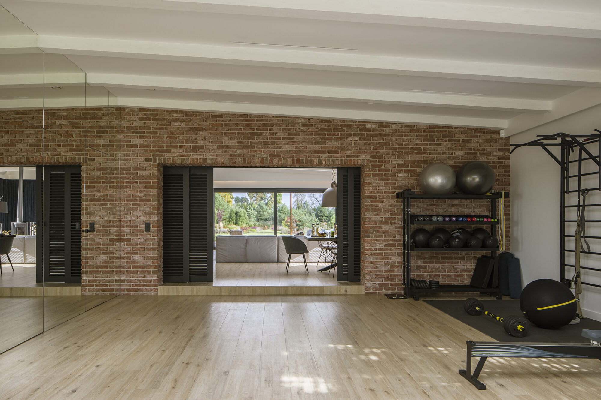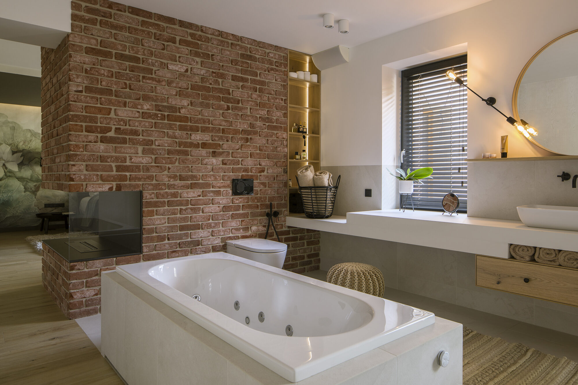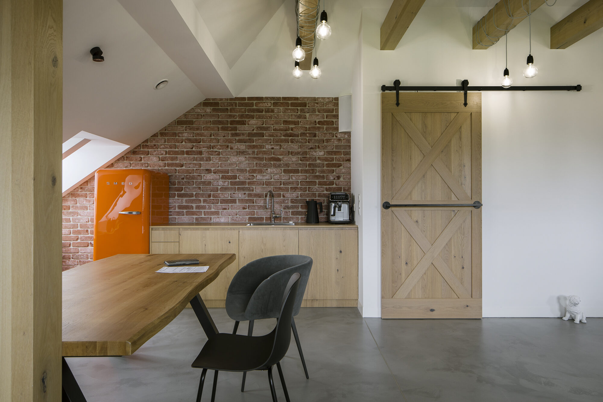 Dom w Babicach to miejsce, które urzeka sielskim klimatem i rustykalnymi nawiązaniami. Cegła, drewno i elementy w stylu vintage występują tu ramię w ramię z nowoczesnym designem. W strefie dziennej prym wiedzie czerwona cegła, która pojawia się w salonie kuchni oraz innych pomieszczeniach domu. Widoczne belki na suficie podkreślają rustykalny charakter aranżacji.
