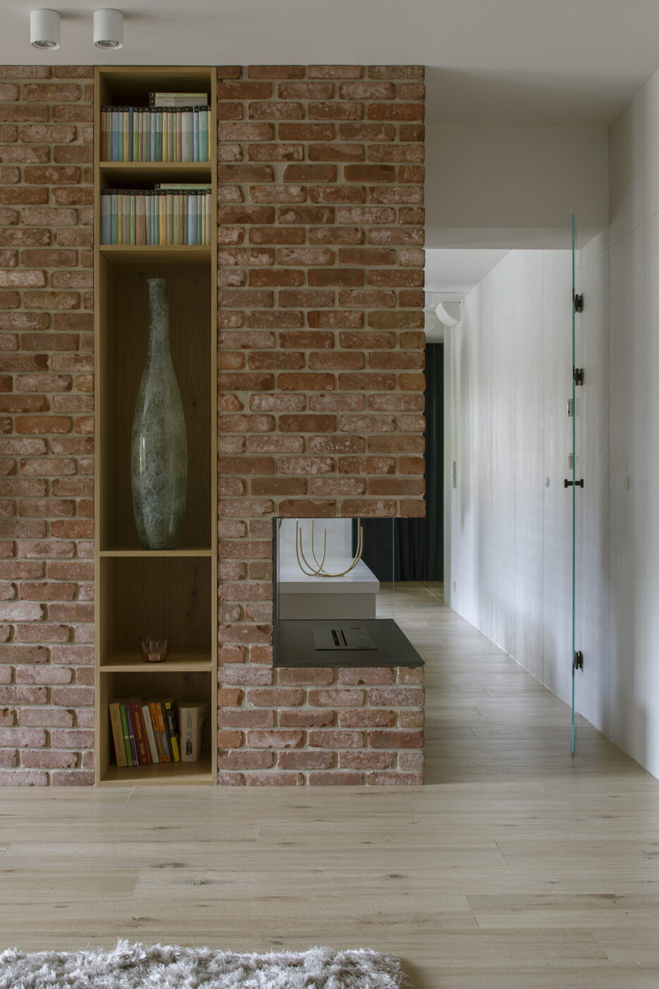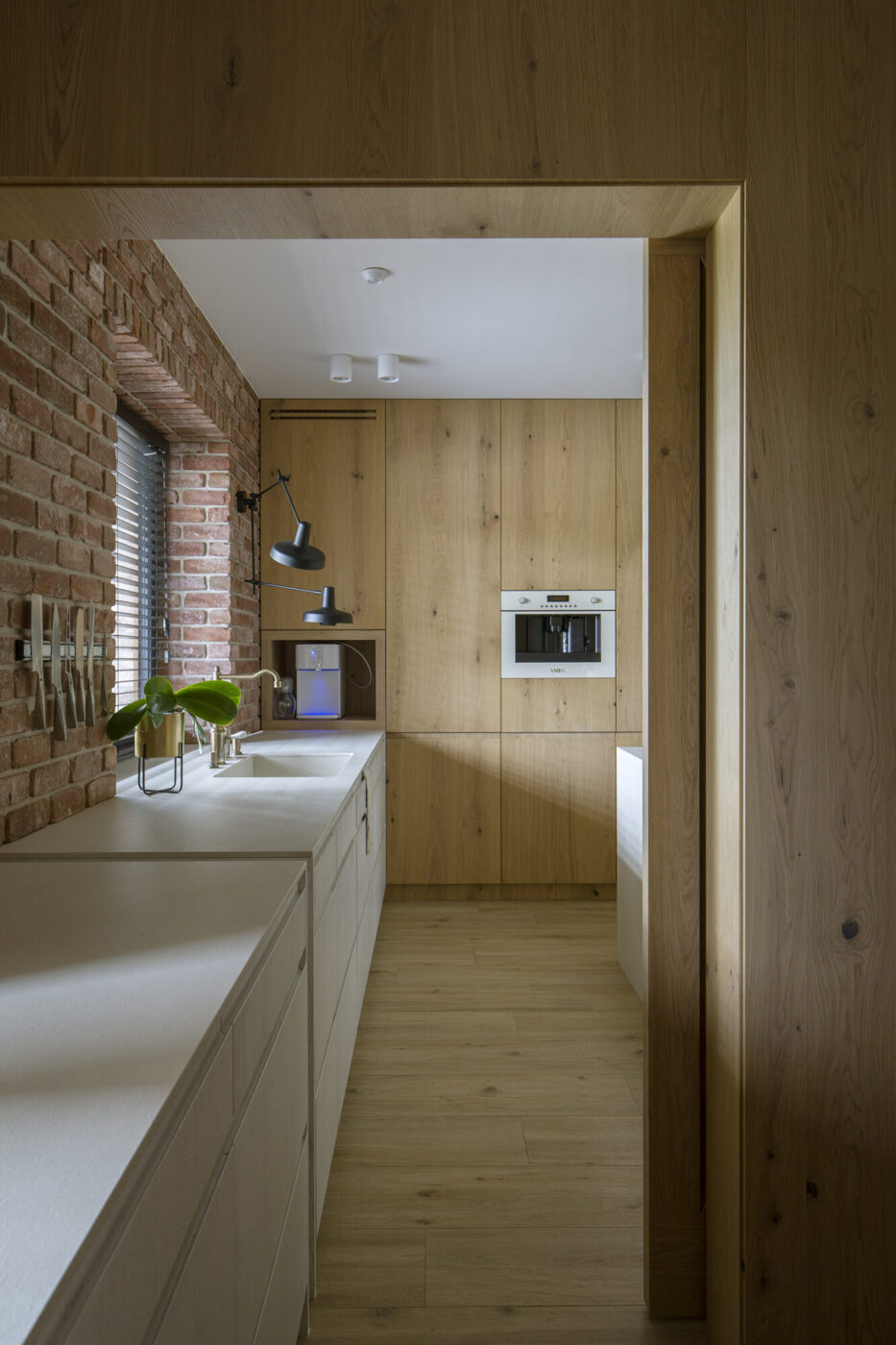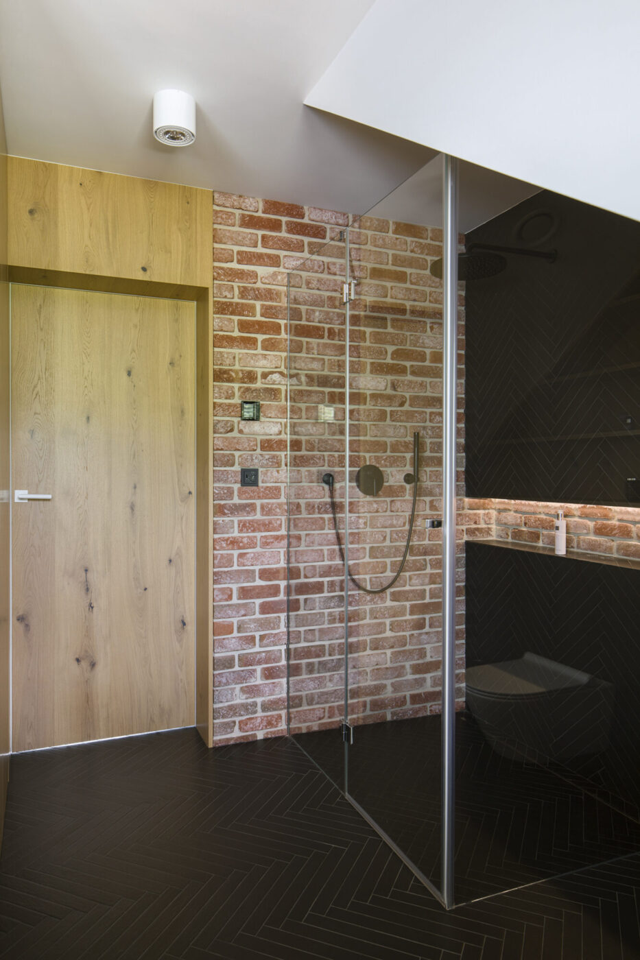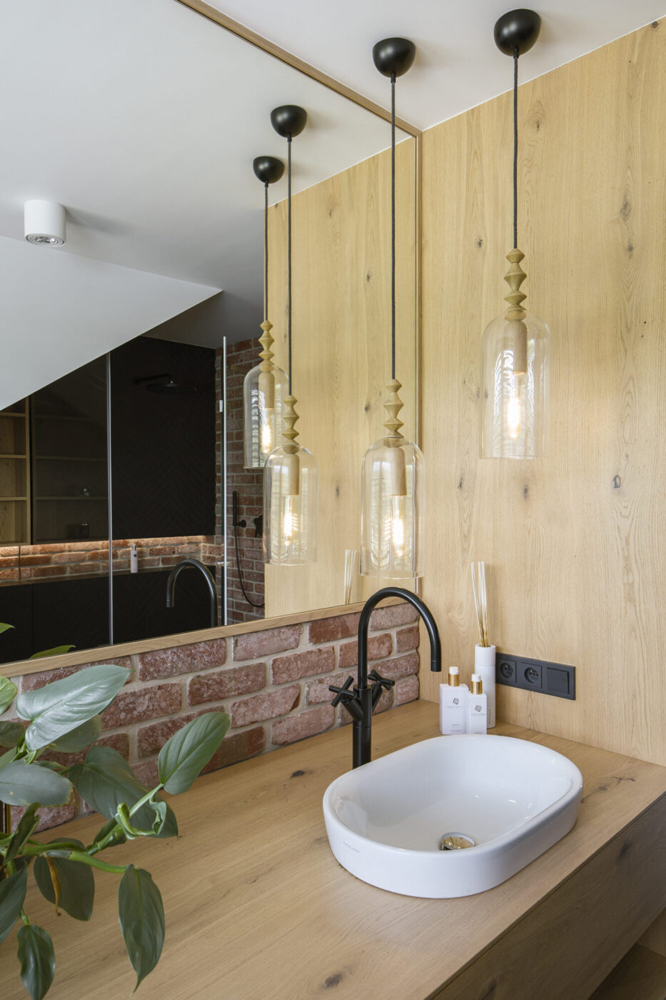 Dom w Babicach to miejsce, które urzeka sielskim klimatem i rustykalnymi nawiązaniami. Cegła, drewno i elementy w stylu vintage występują tu ramię w ramię z nowoczesnym designem. W strefie dziennej prym wiedzie czerwona cegła, która pojawia się w salonie kuchni oraz innych pomieszczeniach domu. Widoczne belki na suficie podkreślają rustykalny charakter aranżacji.
