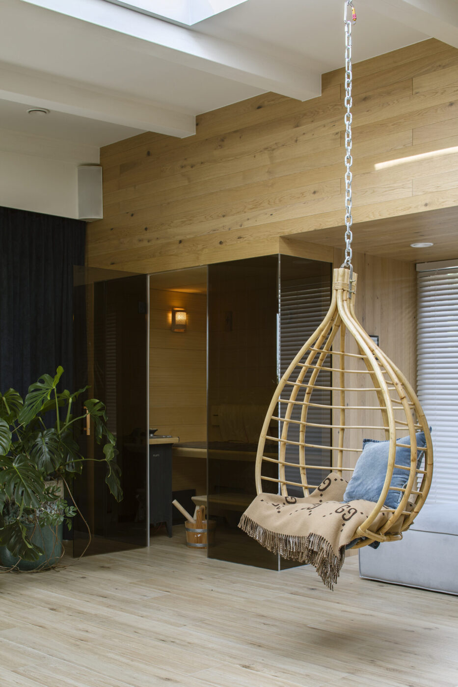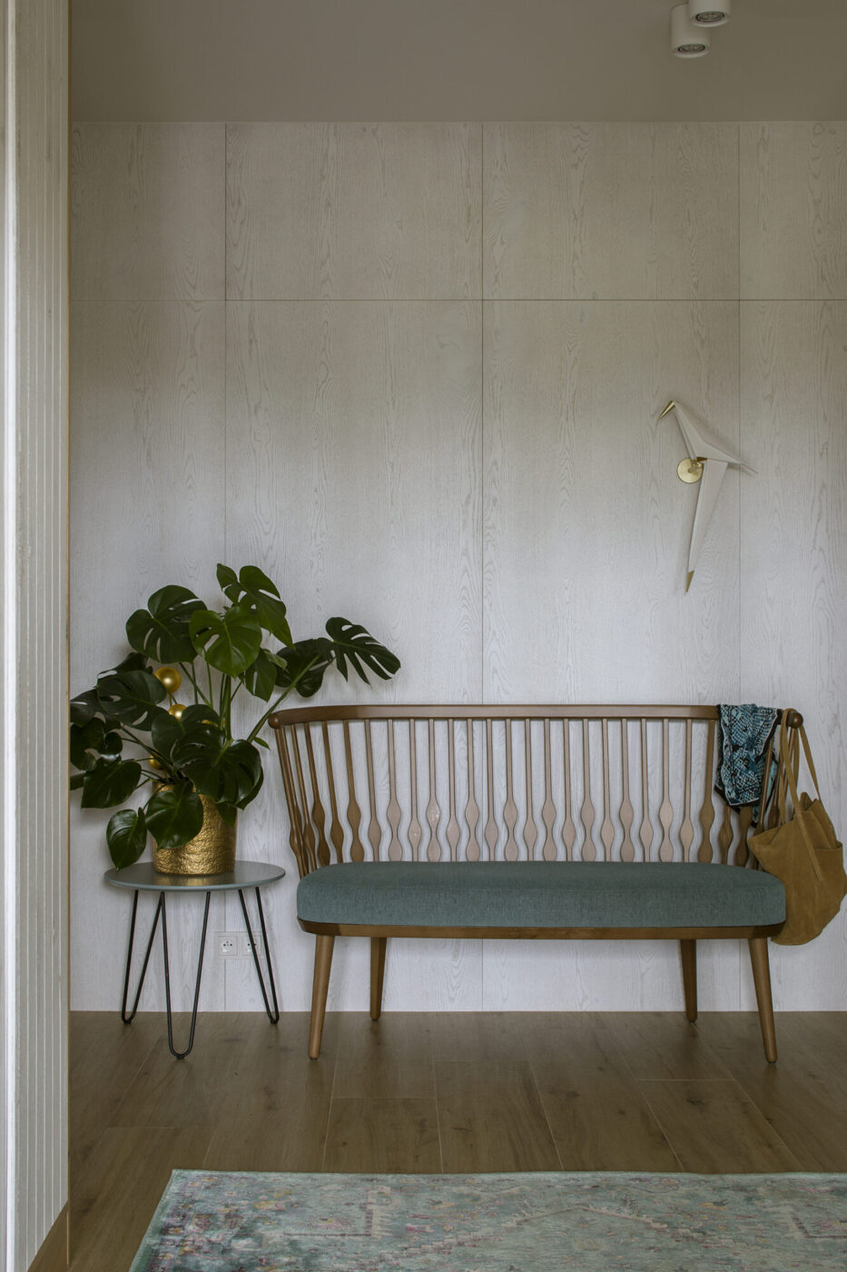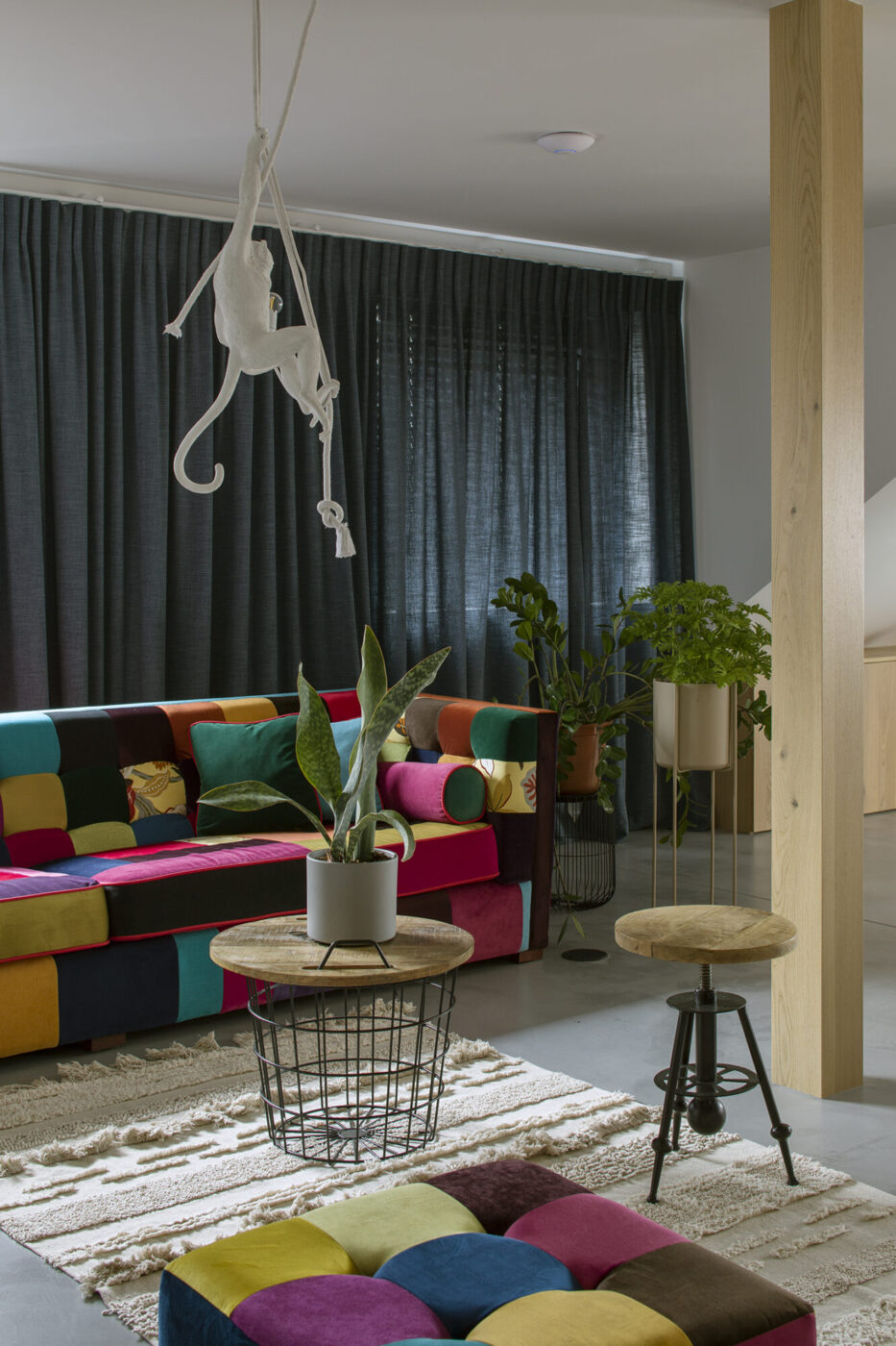 Dominuje tu biel, drewno i cegła, tworzące harmonijną, stonowaną kompozycję. Wyjątkiem jest pokój na piętrze z wielobarwną patchworkową kanapą i pufą oraz kultową lampą-małpą od Seletti. Dom w Babicach to idealne miejsce relaksu, gdzie można wypocząć, oddać się swoim pasjom i poczuć sielski, beztroski klimat okolicy.