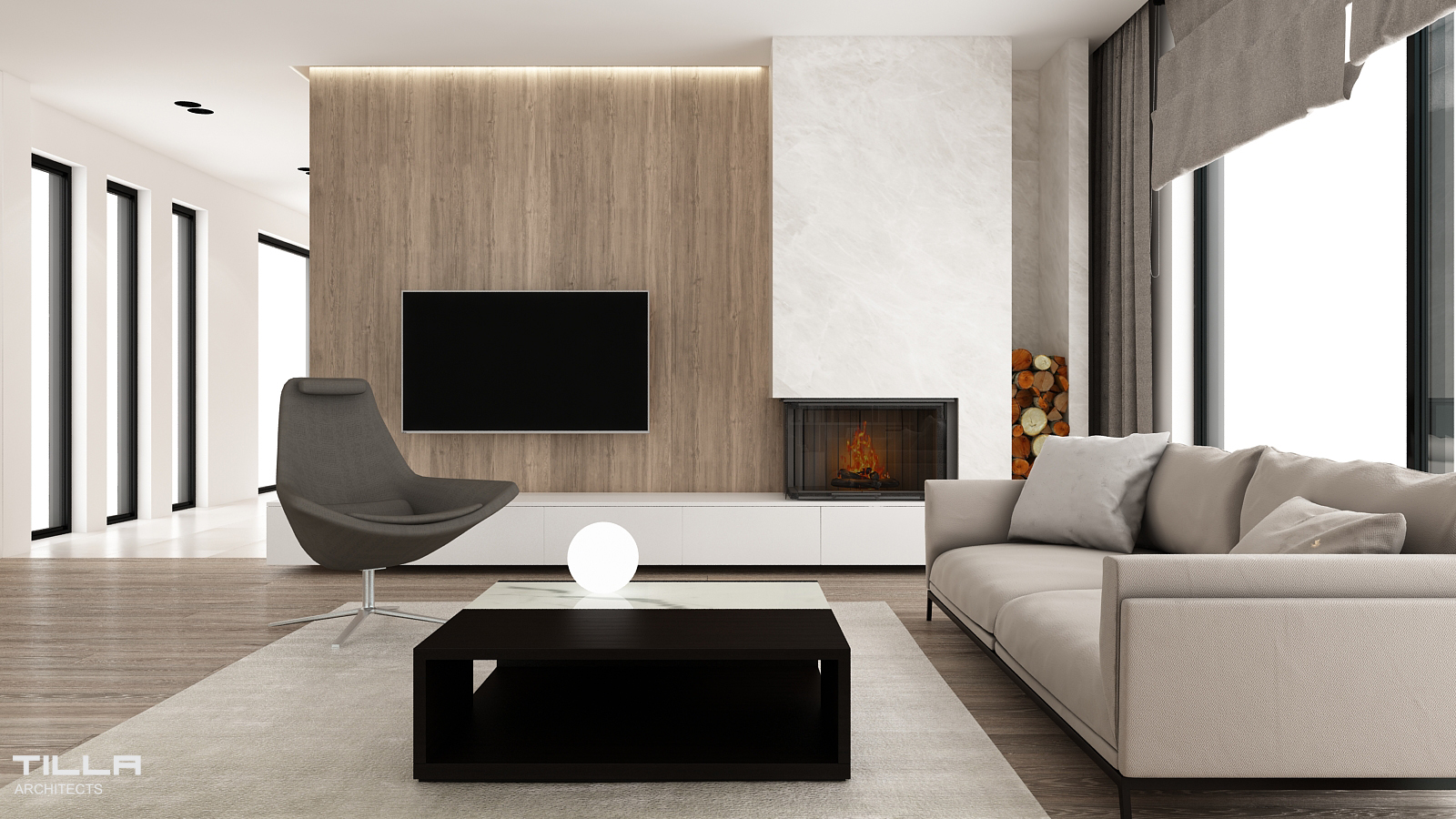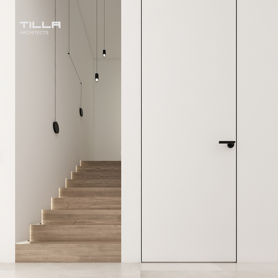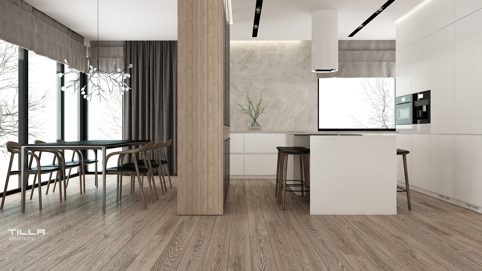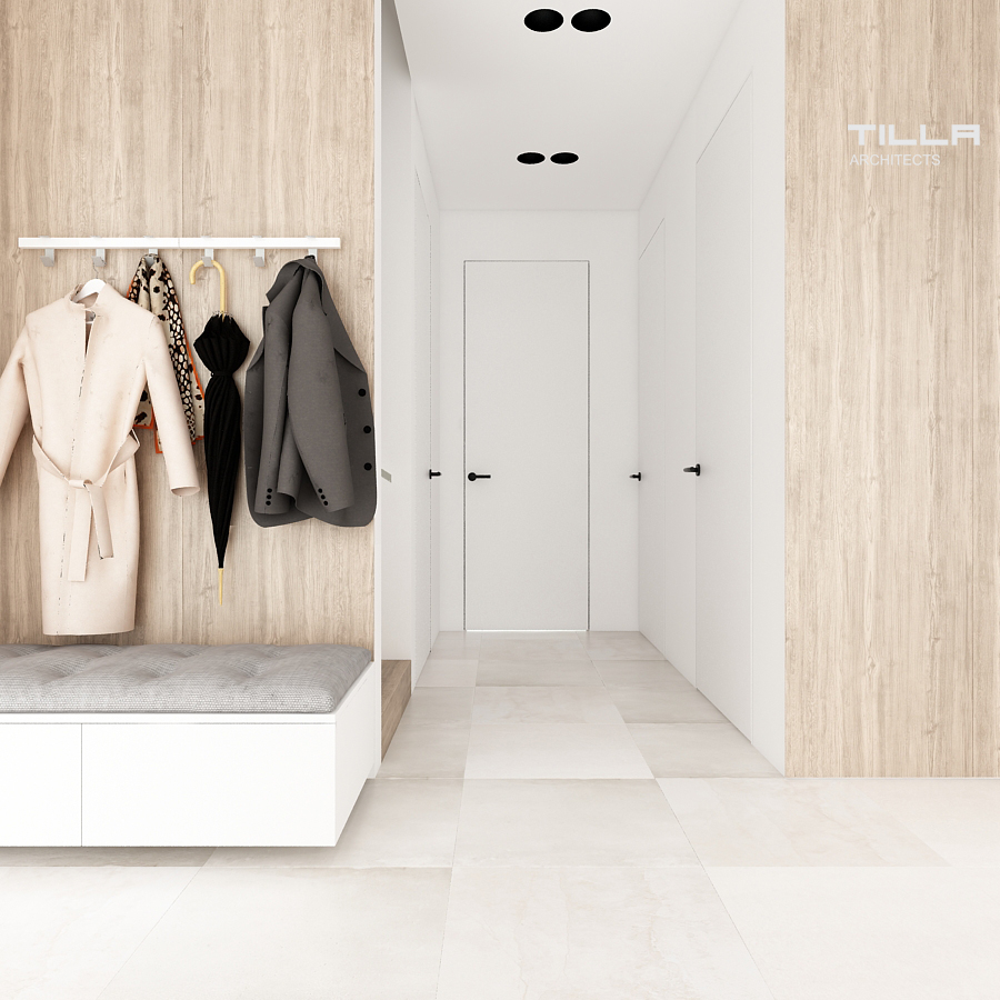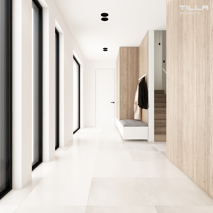 Minimalizm zyskuje coraz większą rzeszę zwolenników. Dom w Łazach pozwala odpowiedzieć na pytanie: dlaczego? Ma w sobie wszystko to, za co pokochaliśmy prostotę. W strefie dziennej króluje biel i drewno. Salon składa się z kominka i TV, kącika wypoczynkowego oraz rozbudowanego regału, który pozwala pomieścić bogatą kolekcję książek inwestorów. Otwarta kuchnia z wyspą jest jasna, prosta i funkcjonalna. Zabudowy po lewej i prawej stronie pokrywają całą wysokość ściany, co daje wiele miejsca do przechowywania. Pośrodku stanęła wyspa wraz z nowoczesnym okapem. Ścianę z oknem zdobi kamienny wzór z delikatnymi żyłkami. Za wysokim kuchennym kredensem znalazła się jadalnia z dekoracyjną lampa Heracleum od Moooi.