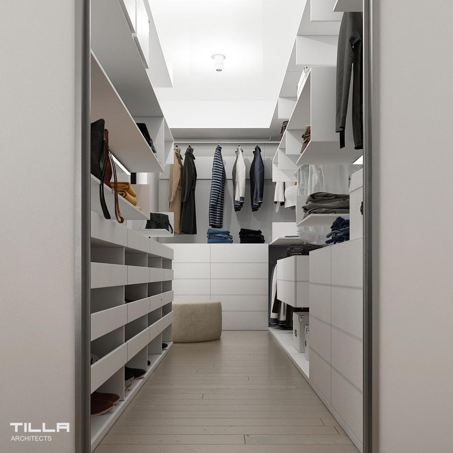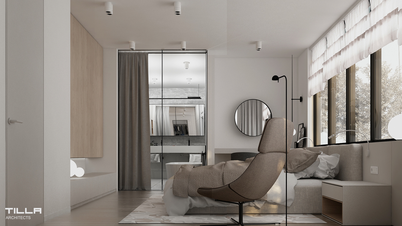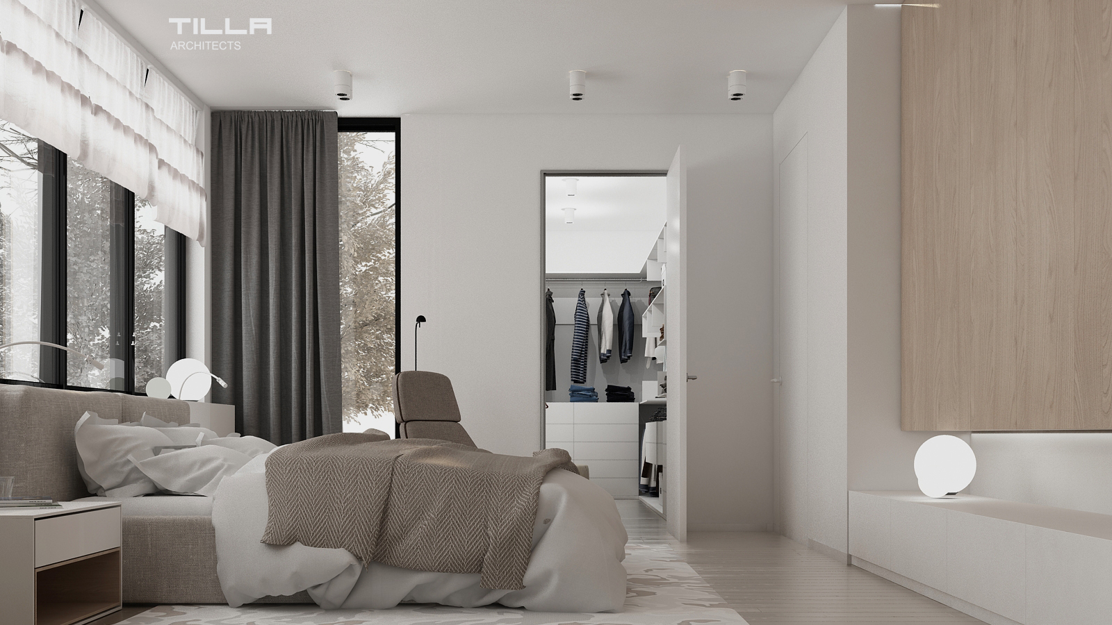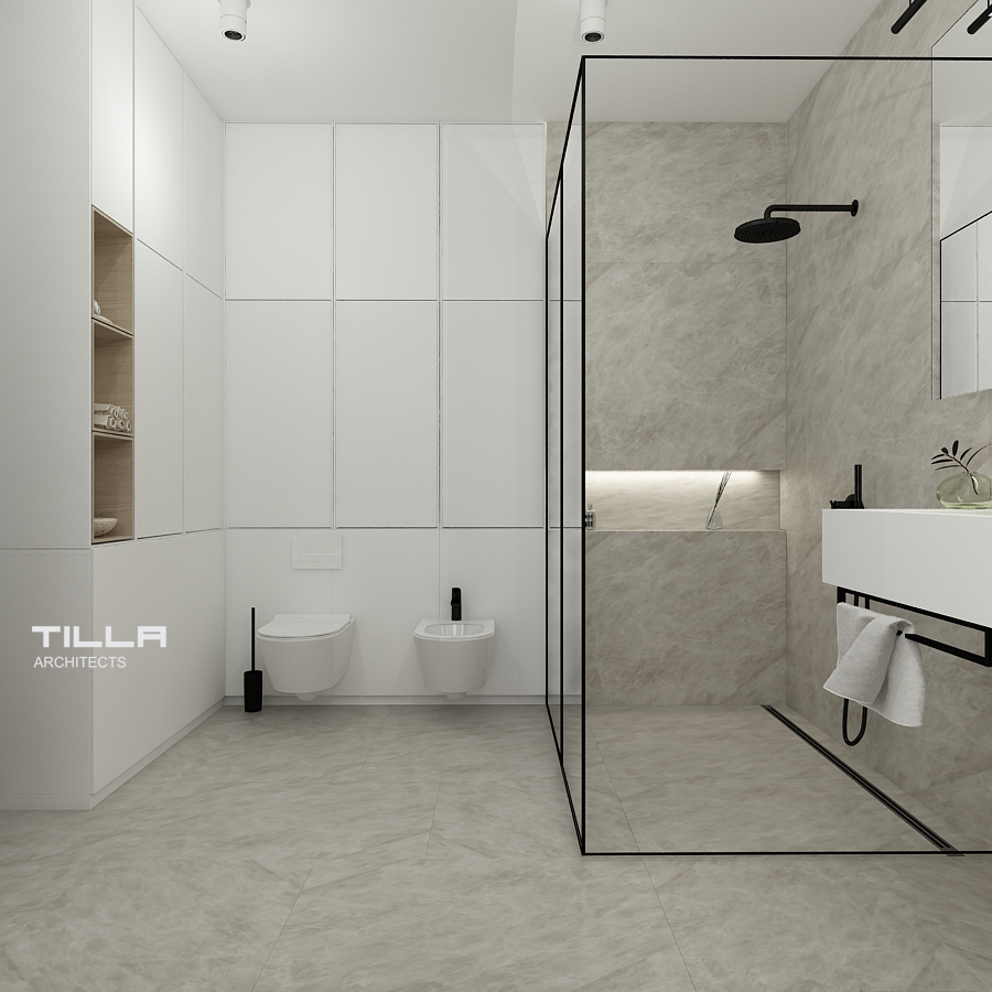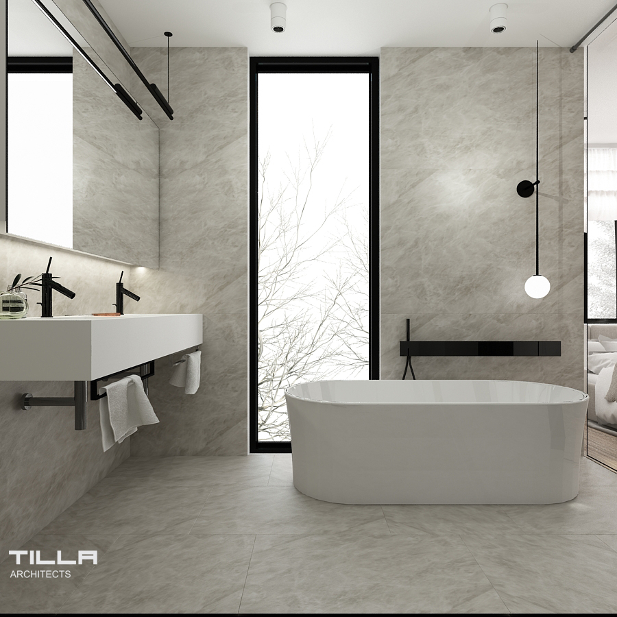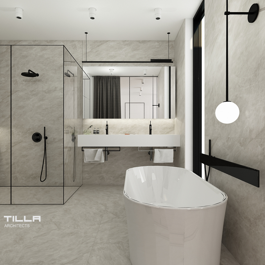 Na piętrze znalazła się sypialnia z wygodnym łóżkiem, prostą zabudową oraz fotelem. Nie mogło tu także zabraknąć garderoby, która również jest utrzymana w minimalistycznym stylu. Za przesuwnymi szklanymi drzwiami z kratownicą znajduje się przejście do łazienki. Znalazła się tu wolnostojąca wanna, prysznic typu walk-in, WC, bidet oraz dwie umywalki. Ściany i podłogę pomieszczenia pokryto identycznymi szarymi płytami, co optycznie powiększa wnętrze i daje efekt spójności. Dom w Łazach to wizytówka minimalizmu. Prostota i umiar pozwalają skupić się na szlachetnych formach wyposażenia. Wszystko ma tu swoje miejsca i nic nie dzieje się przypadkiem.