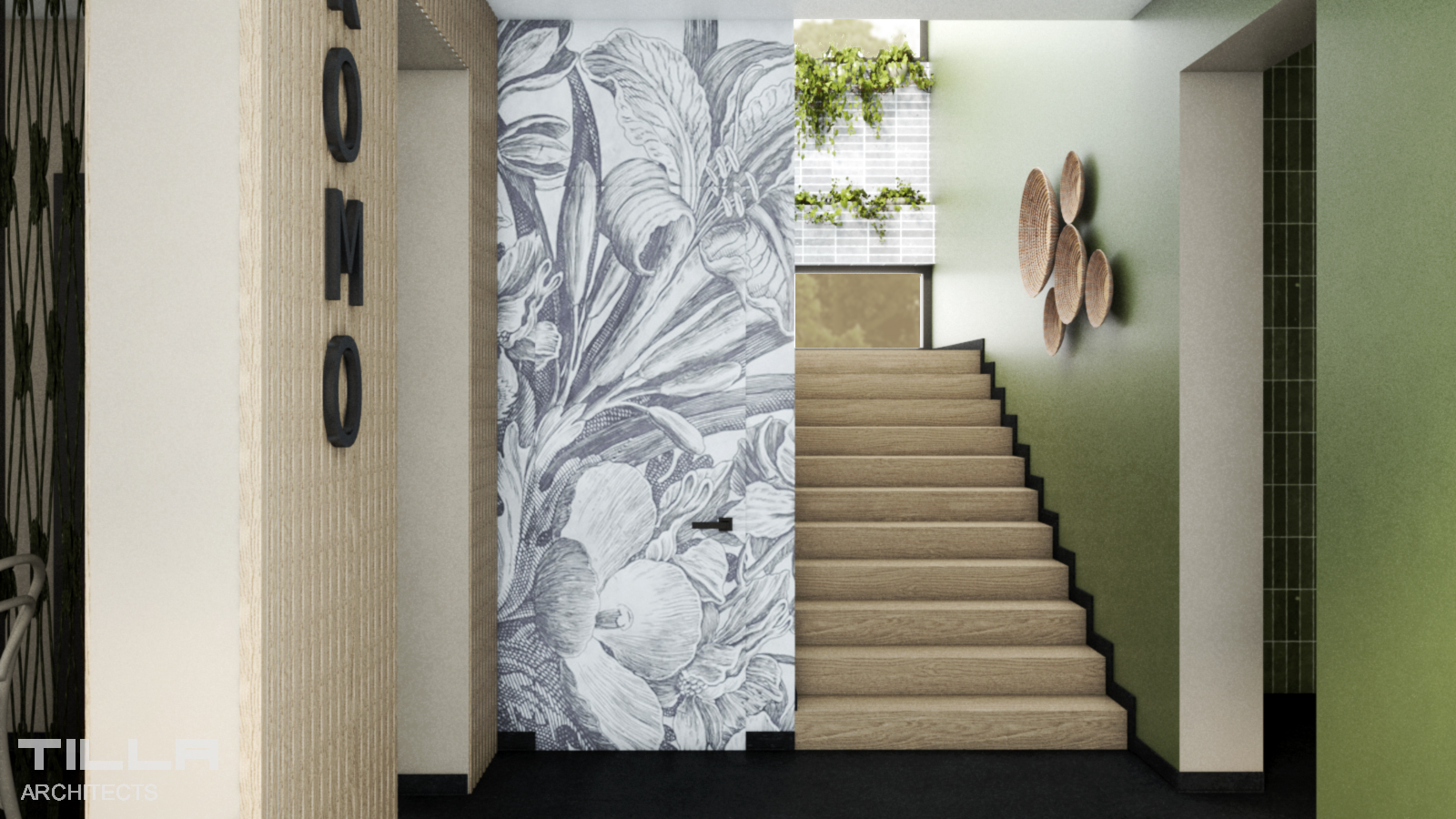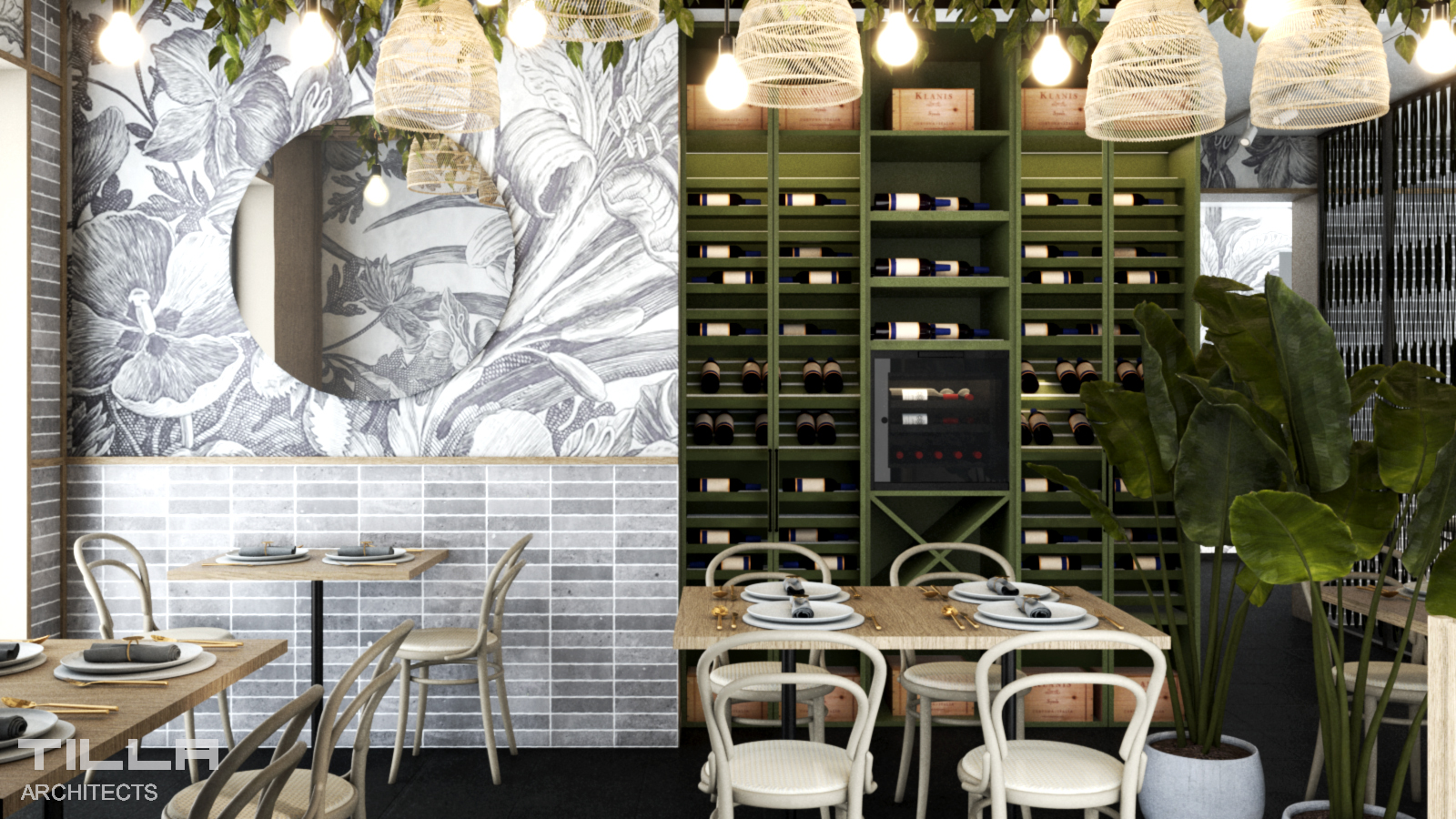 Bistro Como Pizza i Wino w Komorowie przypomina rajski ogród bądź dżunglę pełną ptaków i roślin. Ściany zdobią tapety z motywem kwiatów i tukanów, a z sufitu “wyrastają” zielone liście. Całość uzupełniają bananowce umieszczone między stolikami. W aranżację wpisują się również bar ozdobiony dekoracyjnymi płytkami w kolorze oliwkowej zieleni oraz regały na wino w tym samym odcieniu.
