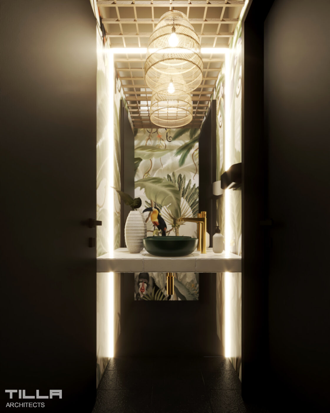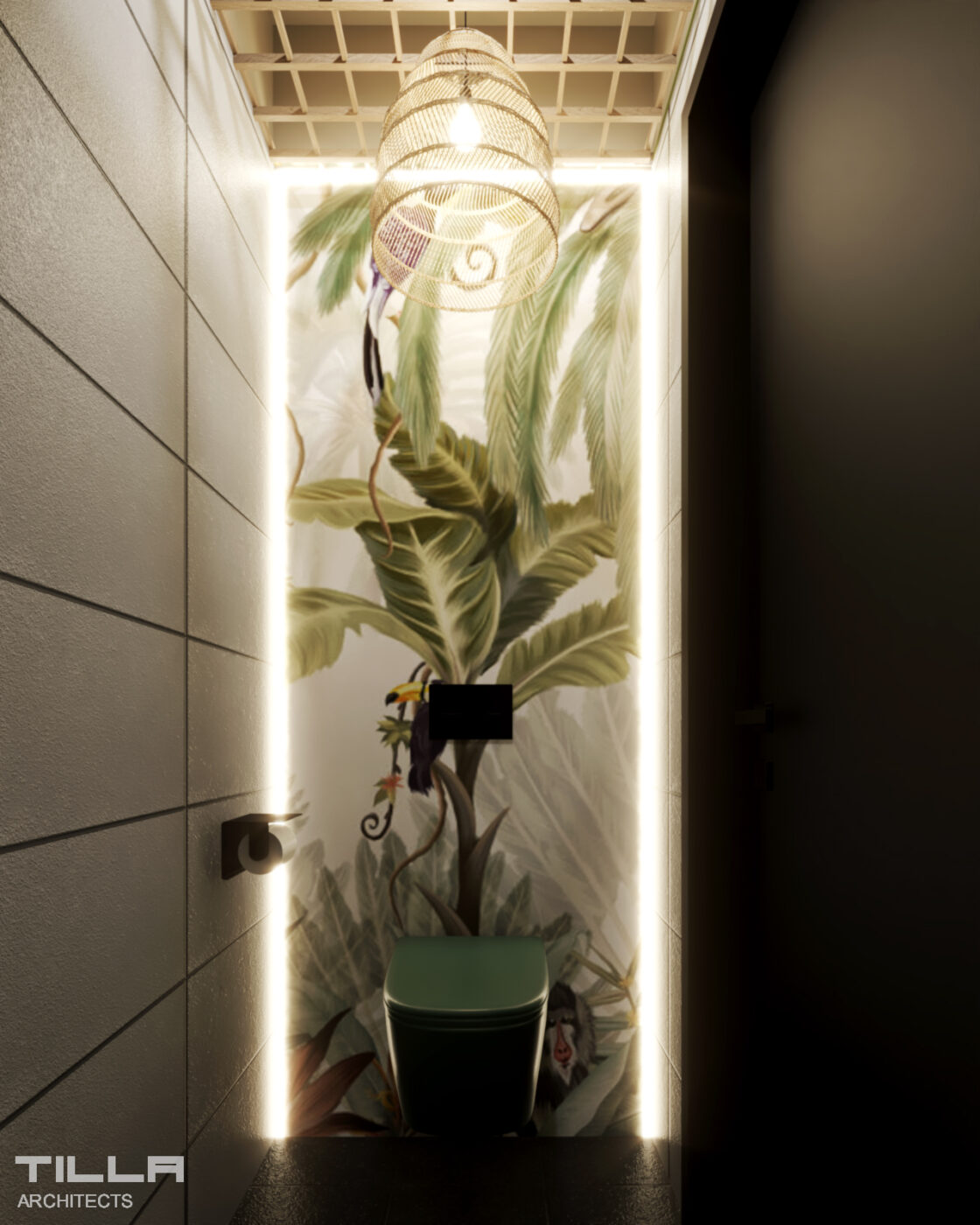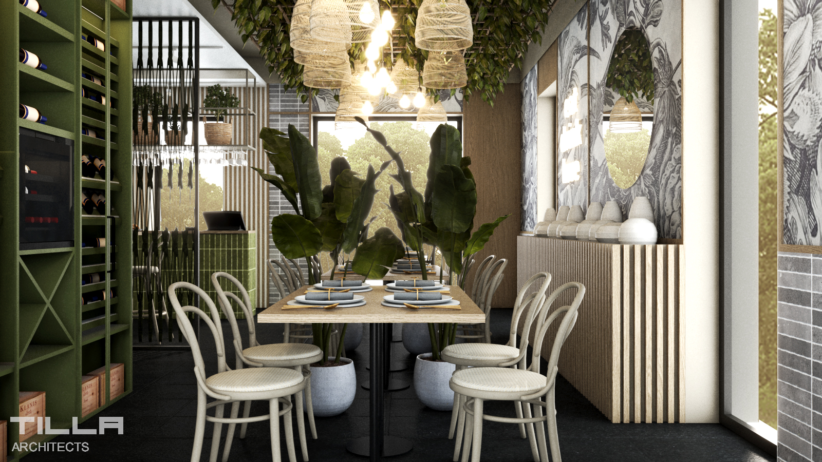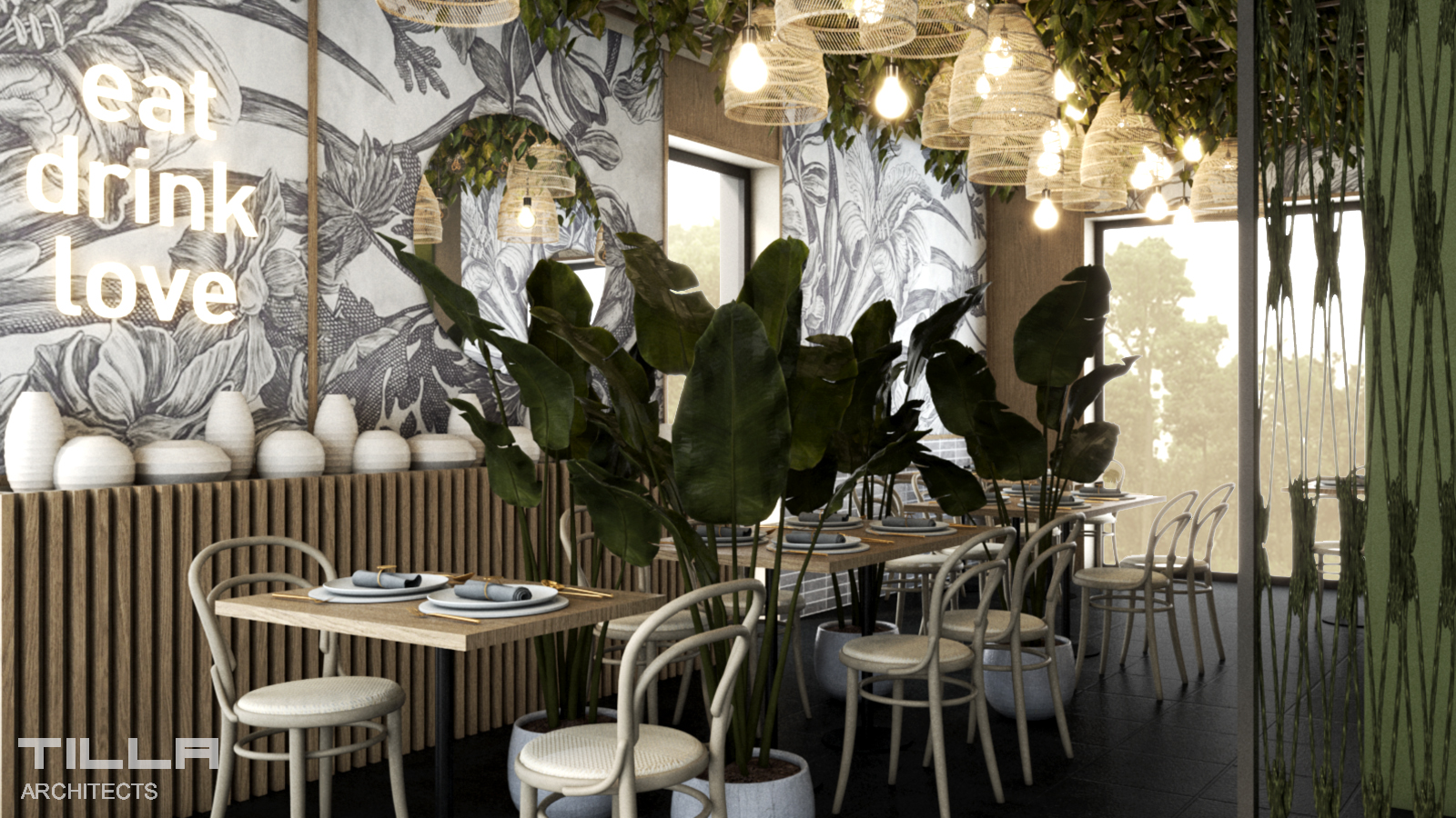 Przytulności dodają drewniane lamele, żarówki o ciepłym świetle zwisające z zielonego sufitu oraz lampy z plecionki. Na jednej ze ścian umieszczono neon z mottem restauracji: Eat, drink, love. To miejsce, w którym można zapomnieć o mieście i poczuć bliskość natury.