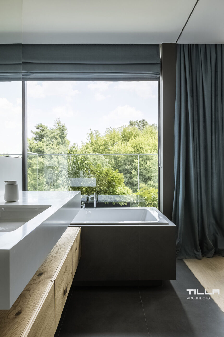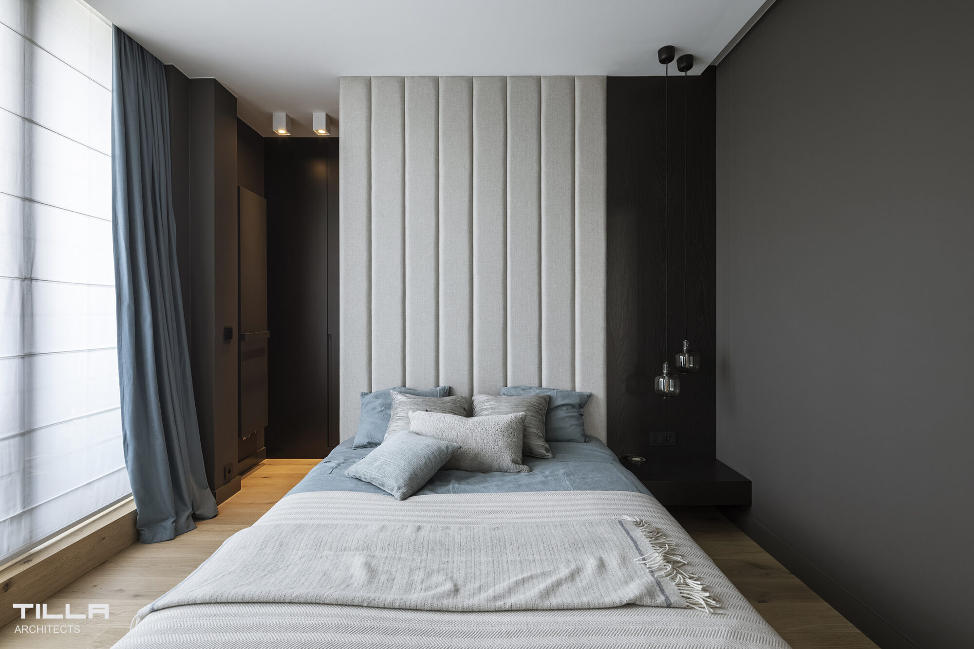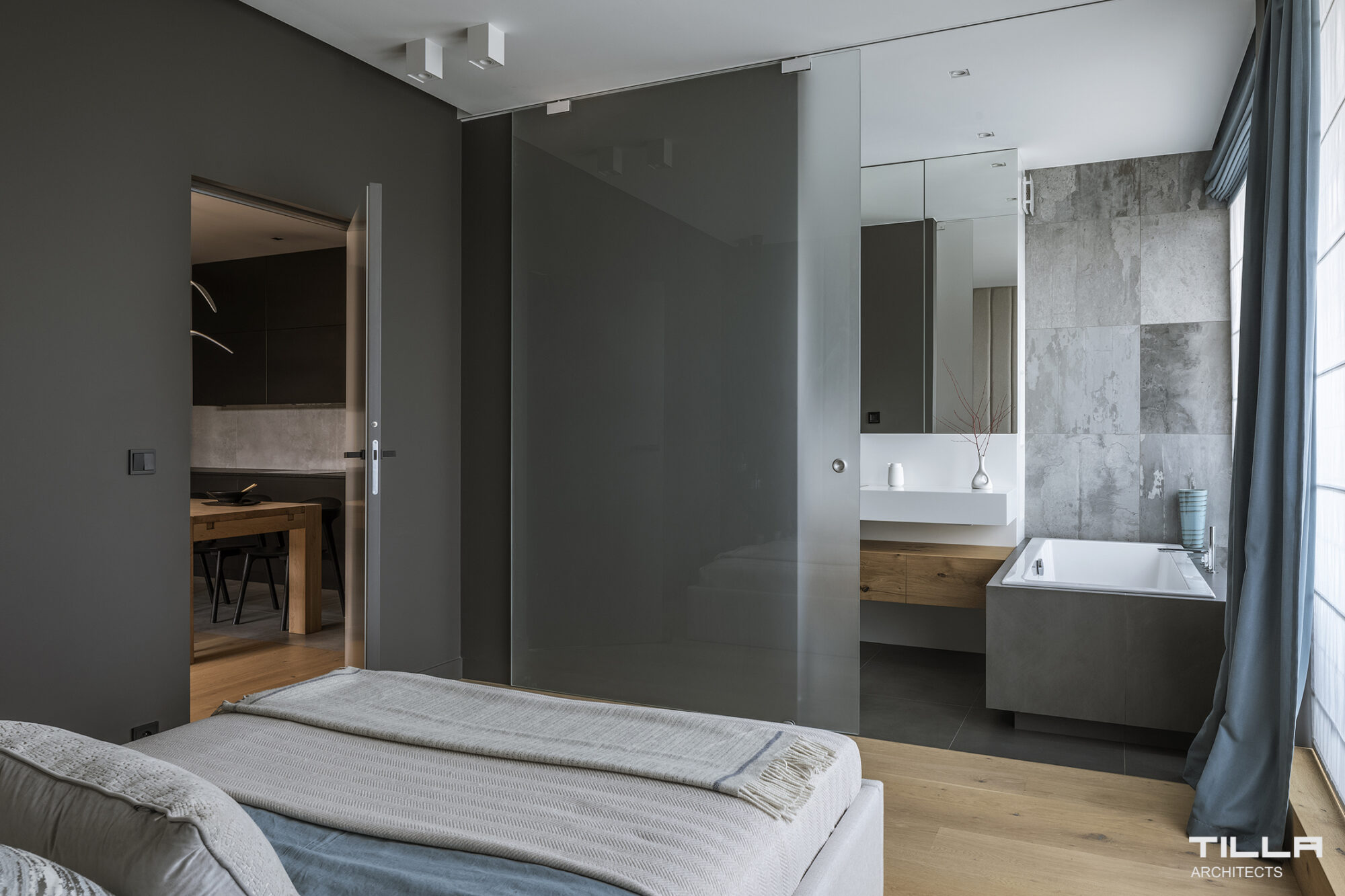 W sypialni króluje czerń przełamana chłodnym błękitem zasłon i jasnym tapicerowanym zagłówkiem łóżka, który dodaje przytulności. Do minimalistycznej łazienki w odcieniach szarości prowadzą przesuwne szklane drzwi w sypialni. Z wanny rozciąga się widok na zieleń za oknem.