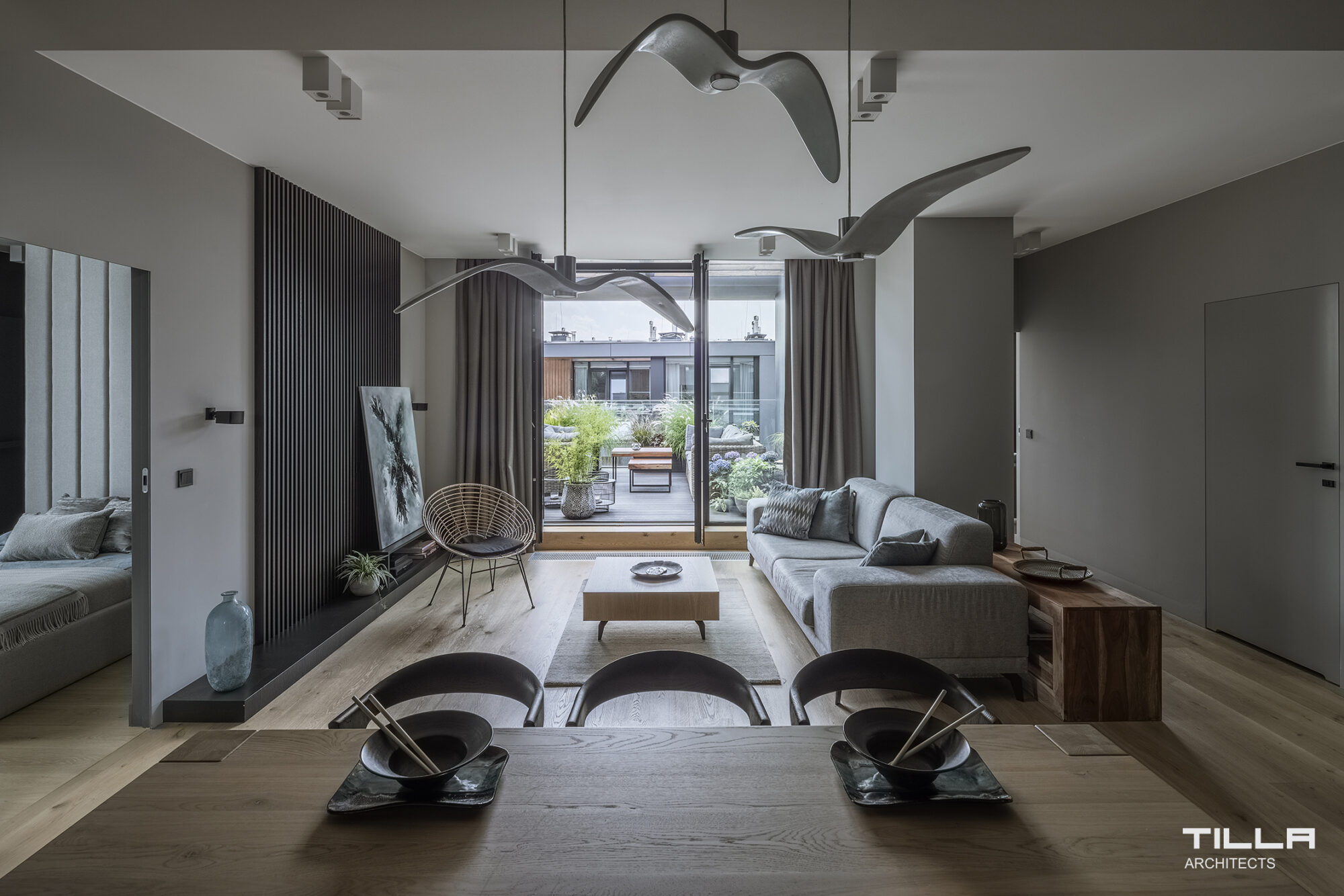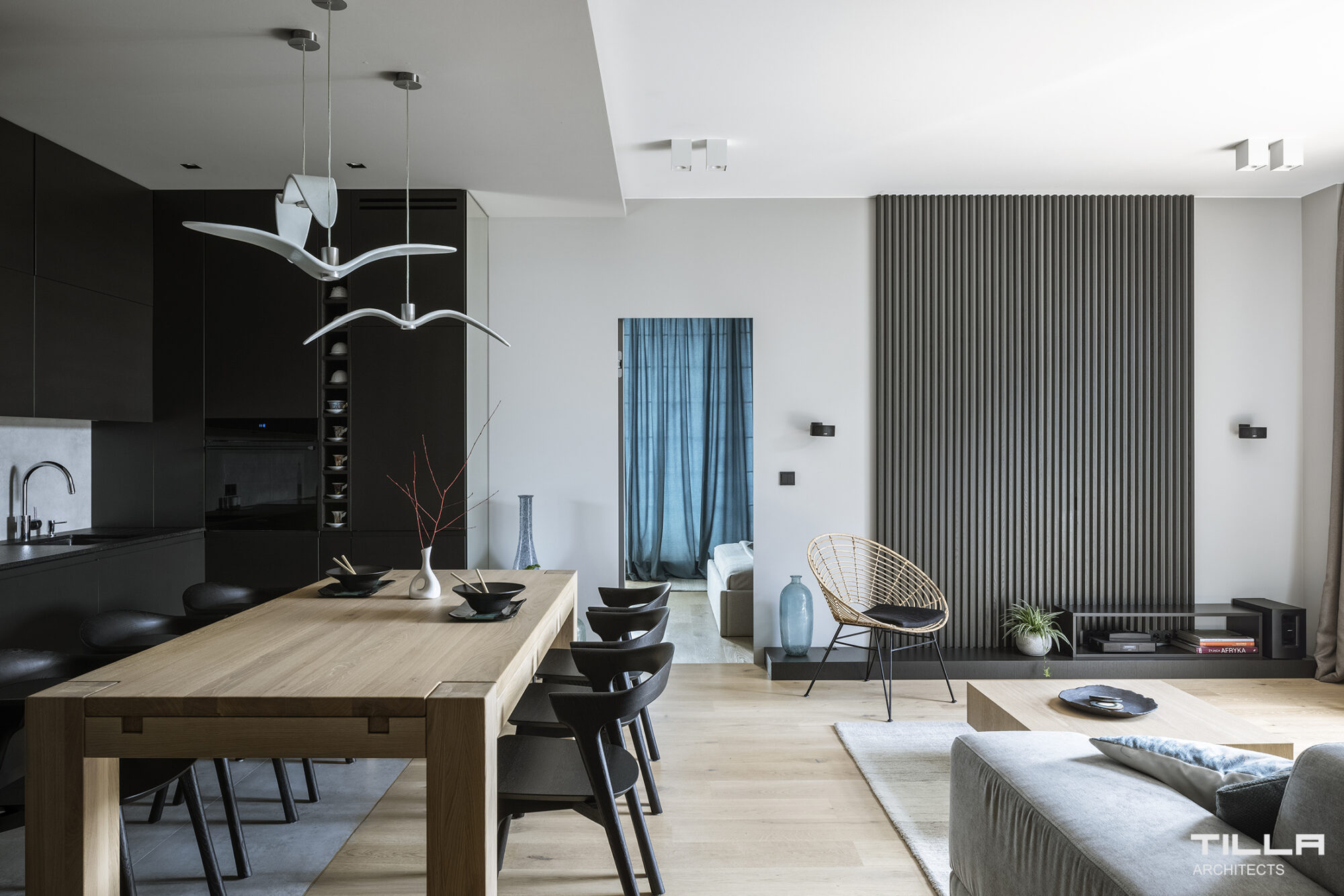 Czerń, szarości, biel, jasne drewno. Oszczędne formy, prostota i nowoczesny design na najwyższym poziomie. Ten apartament, choć znajduje się w Warszawie, estetyką przywodzi na myśl raczej Tokyo bądź Kioto. Od progu wita nas ściana zdobiona subtelnym, stylizowanym motywem roślinnym. Strefie dziennej charakteru nadaje odważnie zastosowana czerń, zdobienie z lameli i duża ilość naturalnego drewna. Główną ozdobą tego ascetycznego wnętrza są ikoniczne, inspirowane lotem ptaka lampy wiszące Nigh Birds marki Brokis, projektu Borisa Klimka.